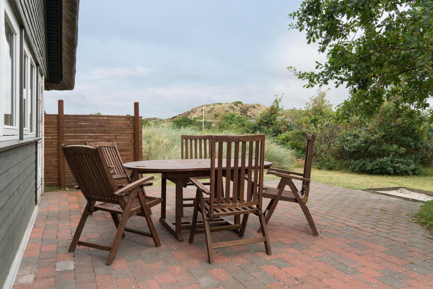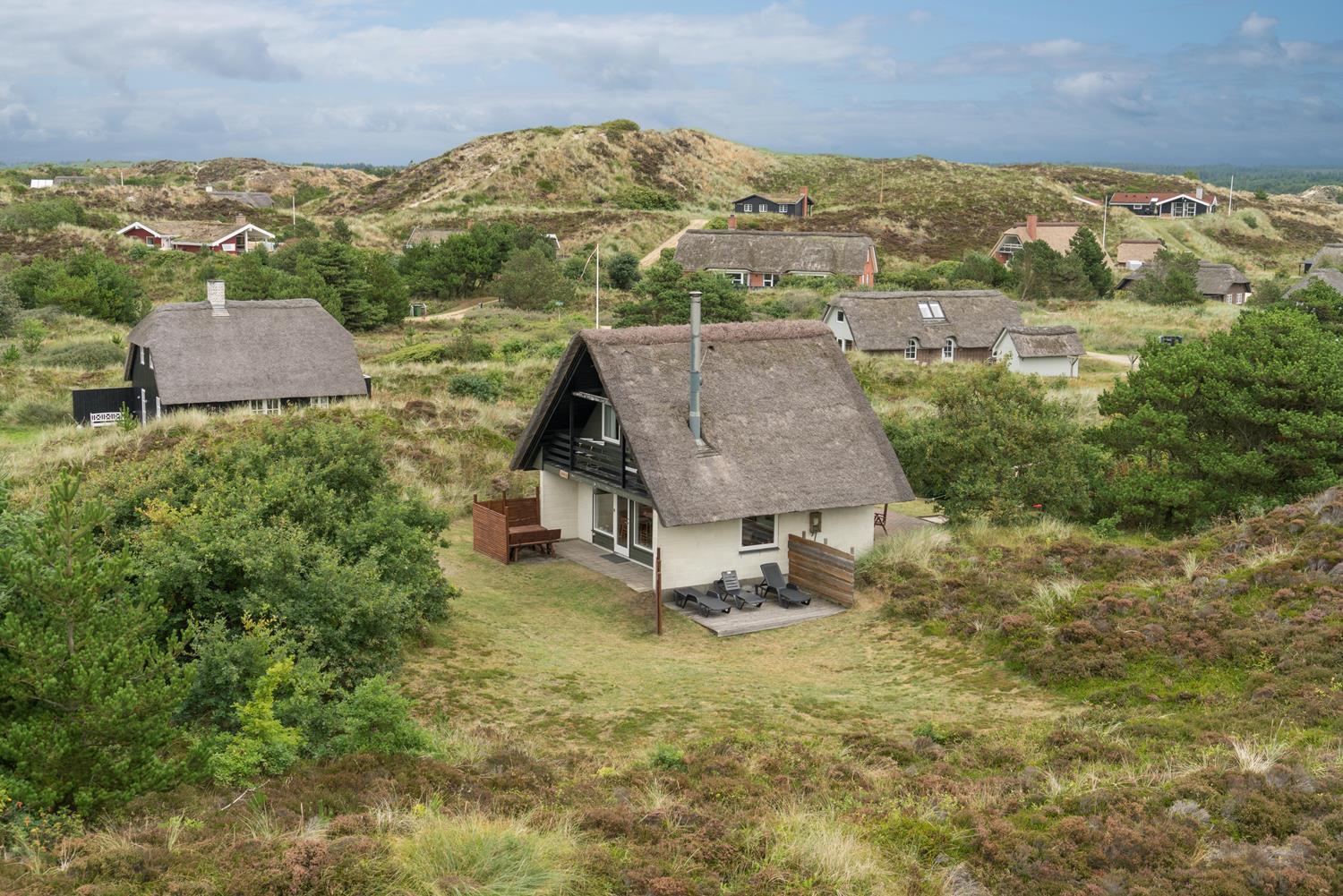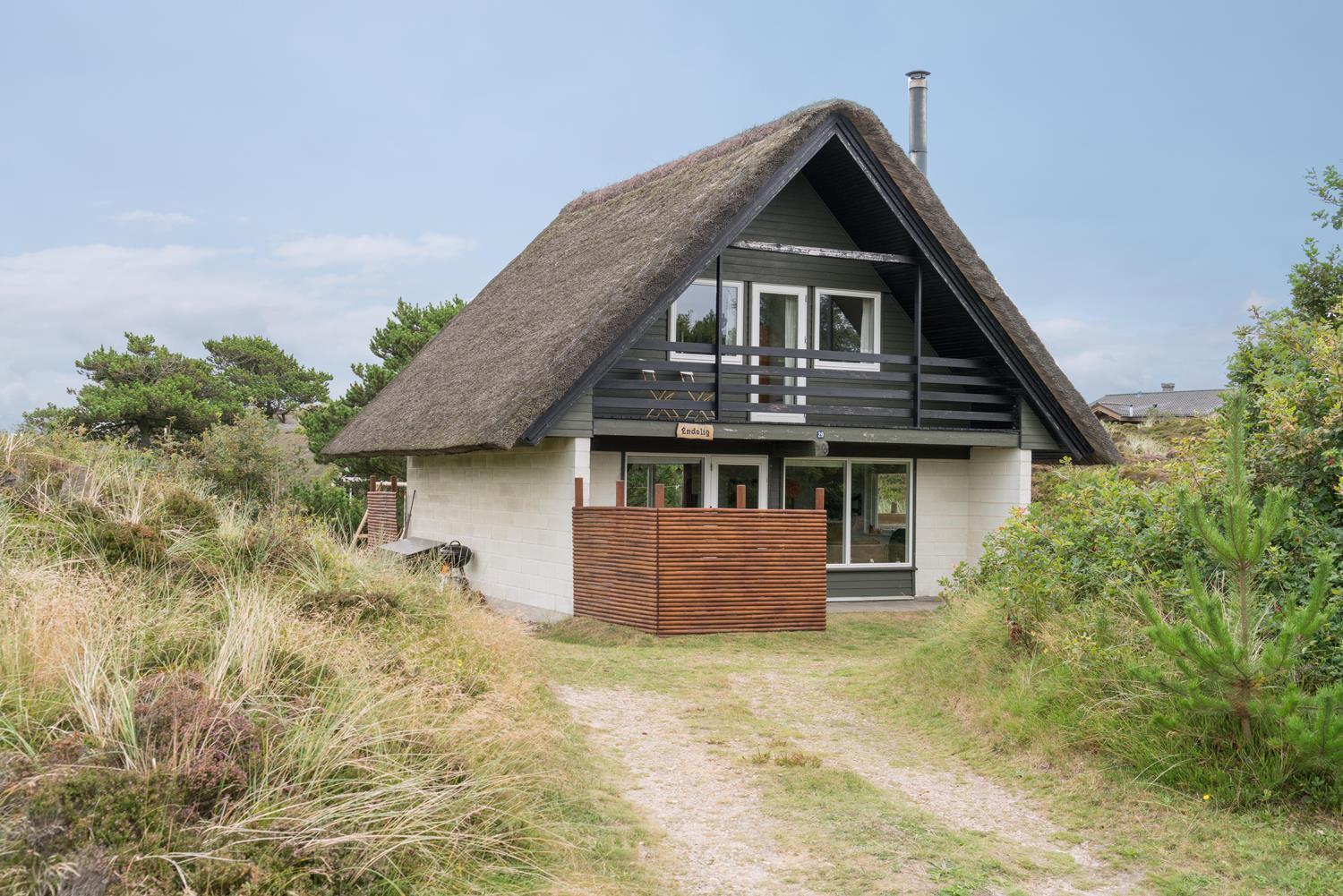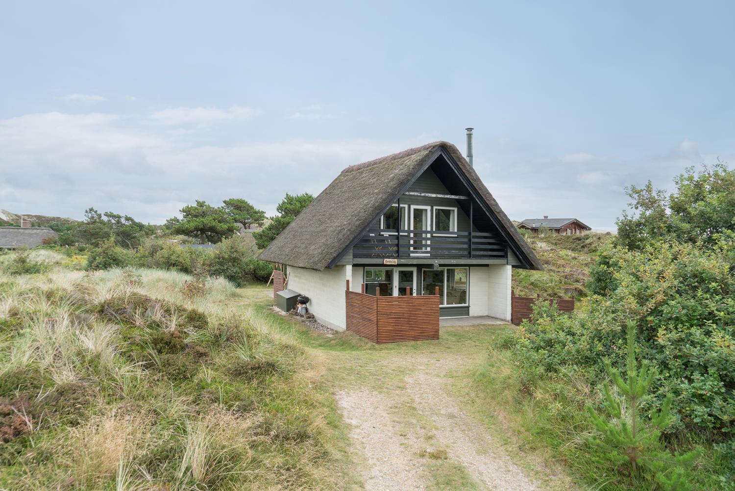 Hyggeligt, stråtækt feriehus på ugeneret klitgrund nær Henne Strand med moderne køkken og flere terrasser.