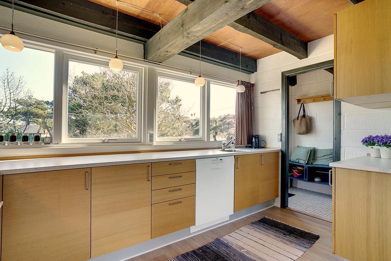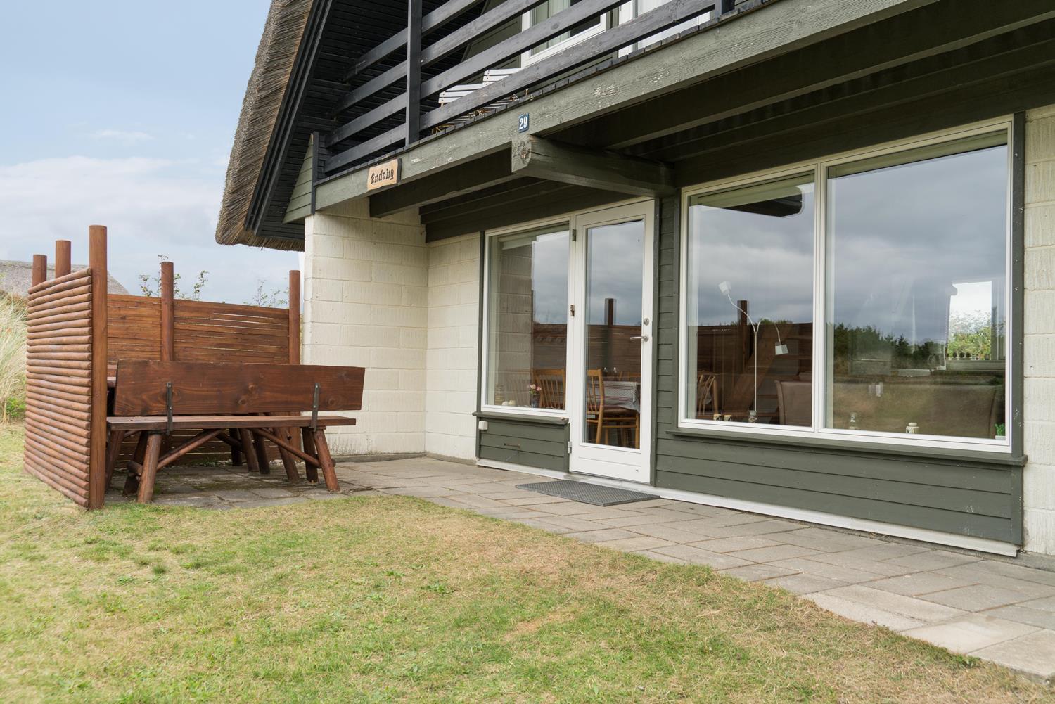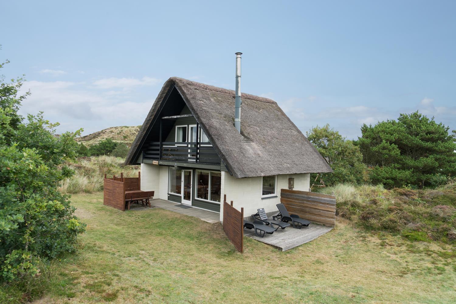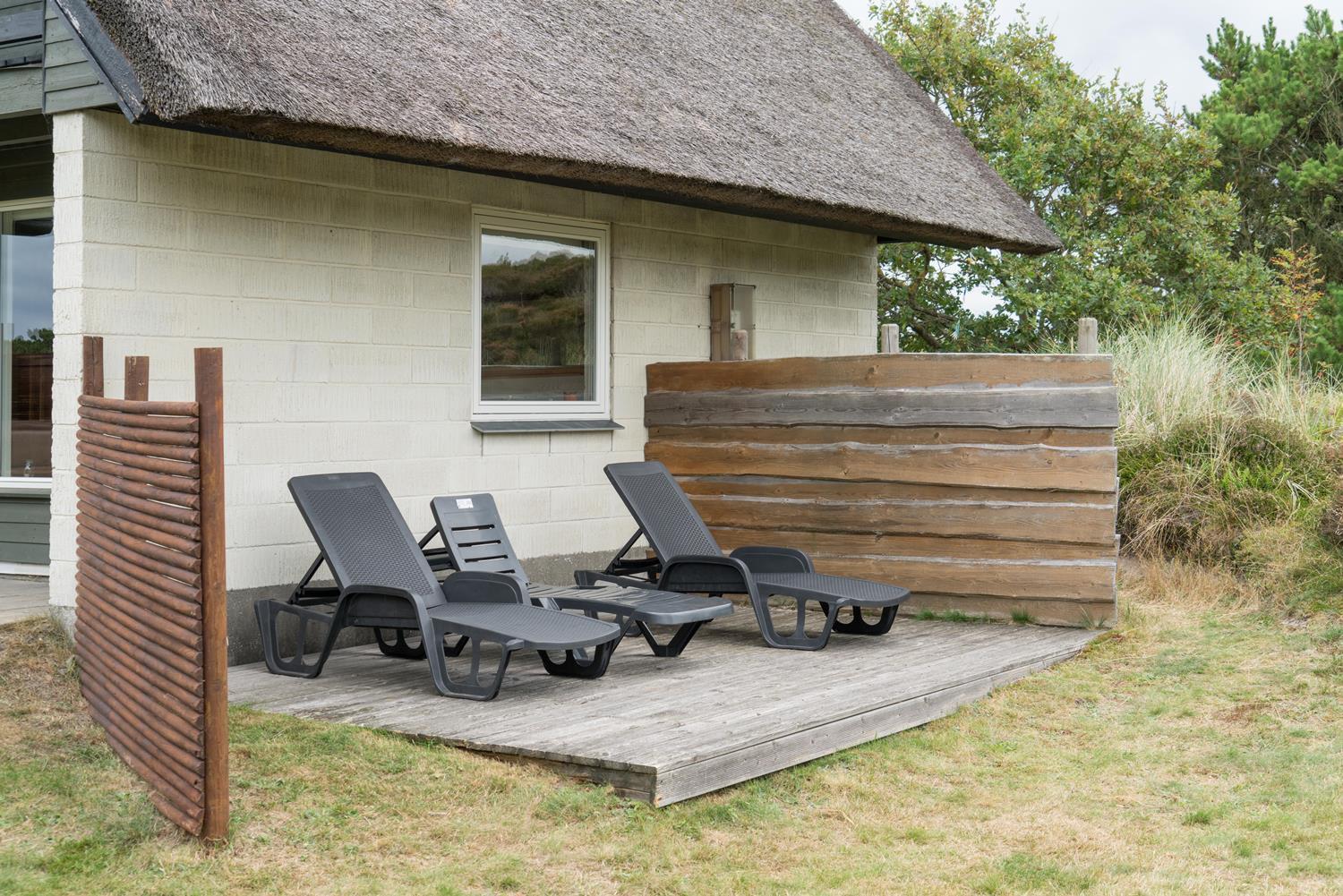 Hyggeligt, stråtækt feriehus på ugeneret klitgrund nær Henne Strand med moderne køkken og flere terrasser.