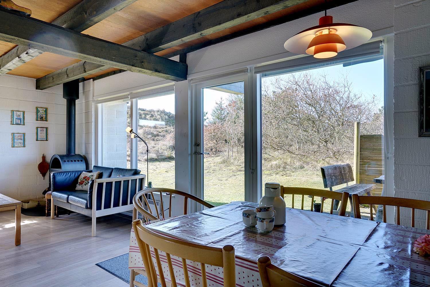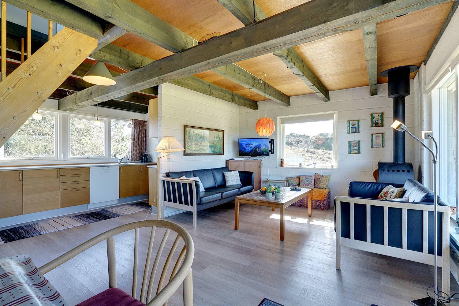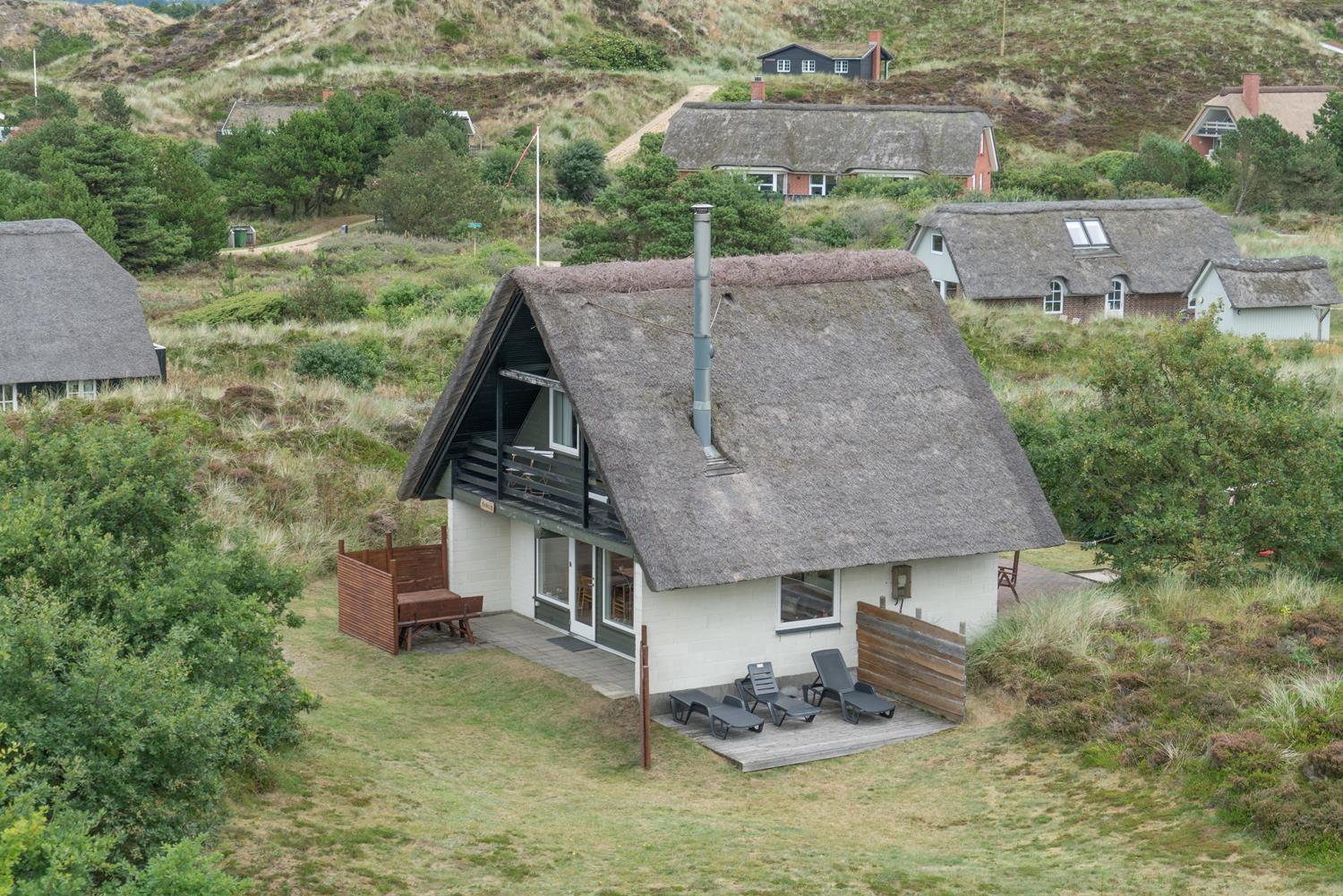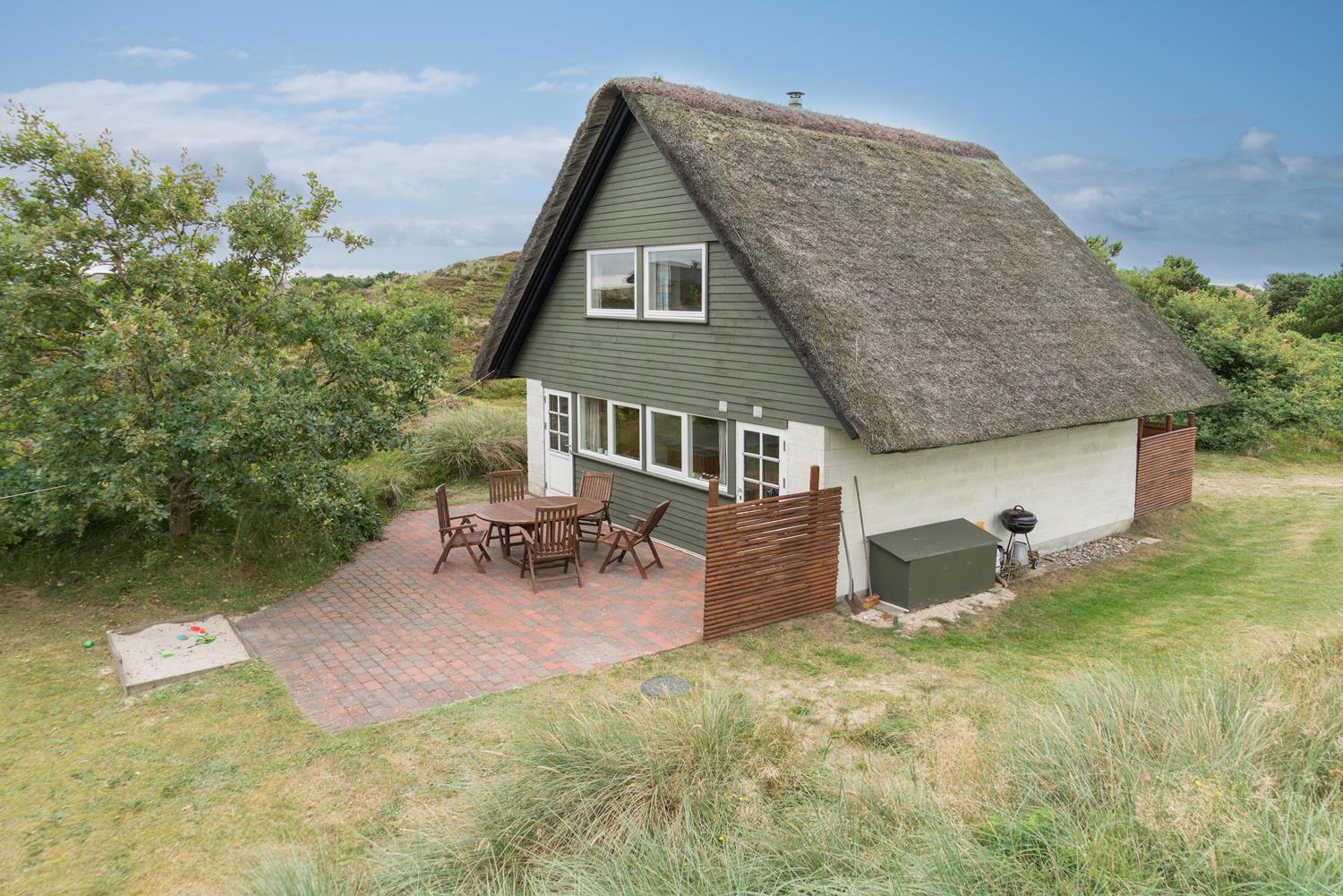 Lille, hyggeligt stråtækt feriehus beliggende på en ugeneret klitgrund for enden af blind vej. Huset er løbende blevet moderniseret bl.a. med nyere køkken. Hyggelig indrettet stue med brændeovn og spisekrog. Ældre badeværelse i stueetagen. På 1 sal finde I husets 4 soverum. Der er på grunden en sandkasse og gynge til de små gæster. Flere gode terrasser og en balkon. Trådløs internet findes også i huset.