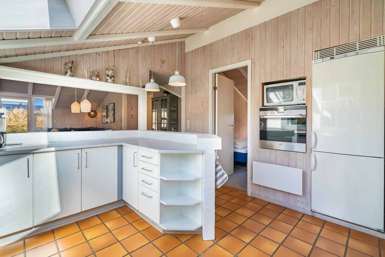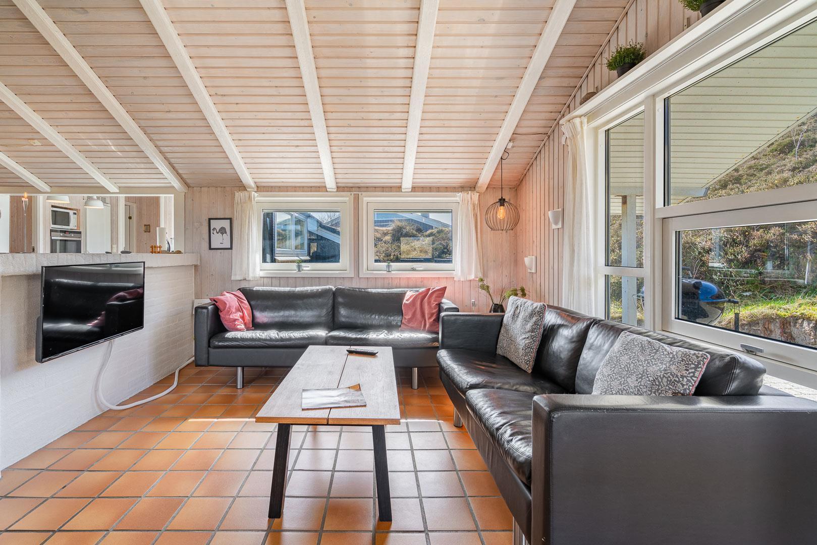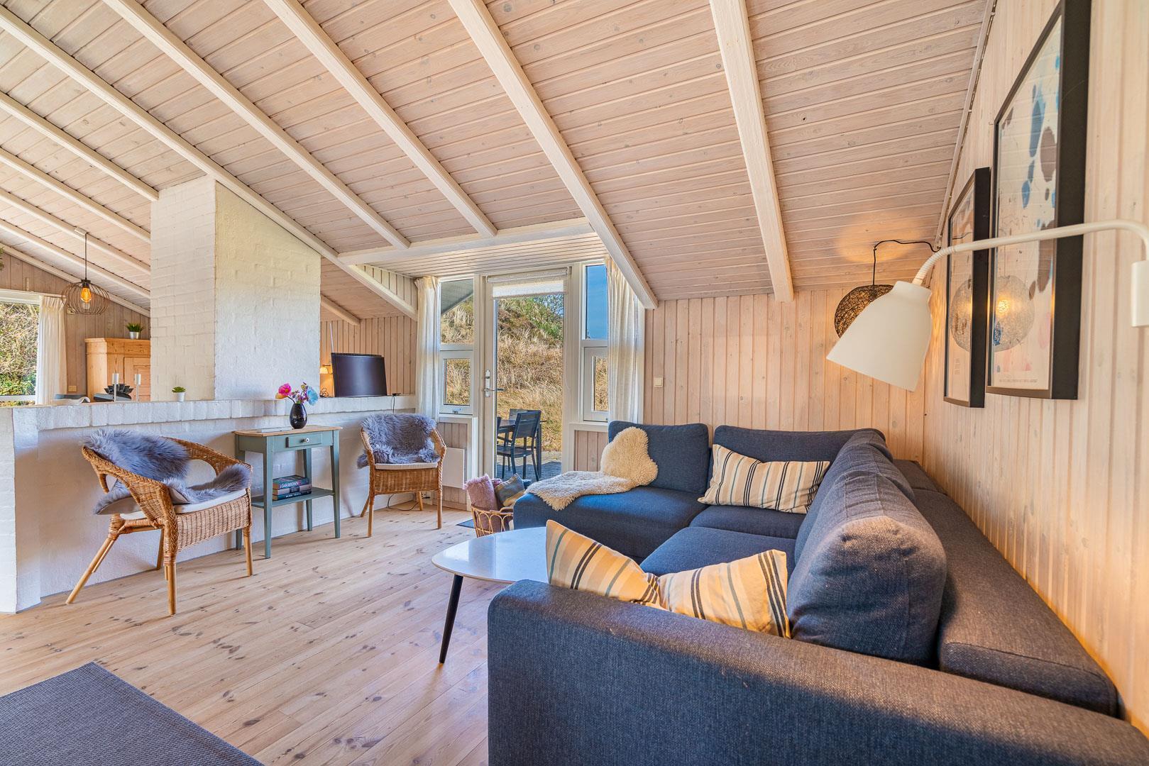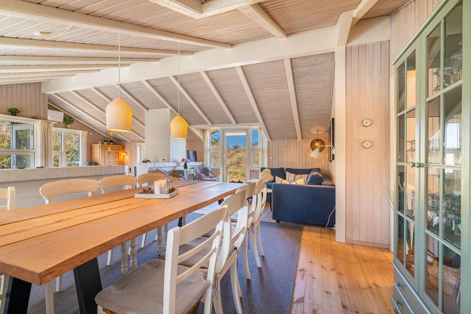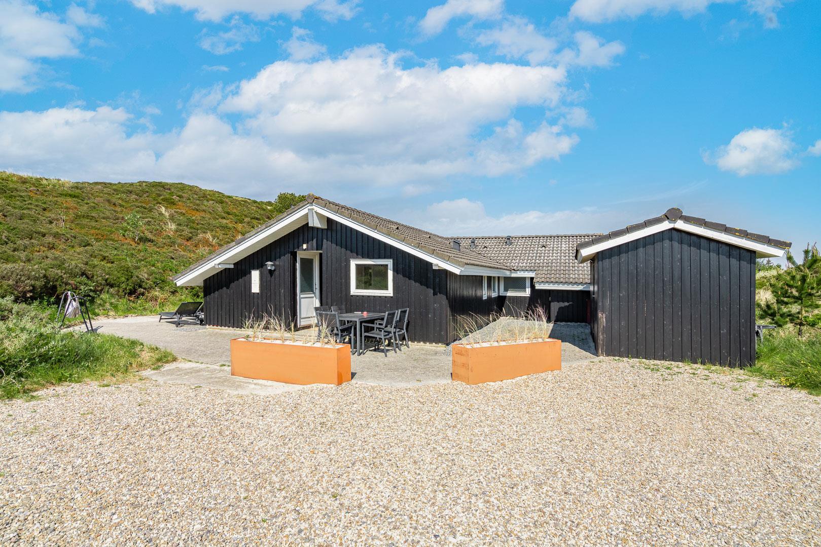 I rolige omgivelser for enden af blind stikvej finder I dette velholdte og velindrettede feriehus. Huset er omgivet af klitter, så der er gode læ muligheder på den delvis overdækkede terrasse. Der er et bryggers med vaskemaskine og tørretumbler, samt 2 badeværelser, hvoraf den ene er med spabad og sauna. Feriehuset råder over 4 soverum, 3 med dobbeltseng og et rum med 2 enkeltsenge. I åben forbindelse med husets køkken finder I spisepladsen og opholdsstuen, som er delt i 2 via et trappetrin. Der er også en brændeovn og energivenlig varmepumpe til rådighed. Den delvist overdækkede terrasse omkranser næsten hele huset, så I altid kan finde et læfyldt sted.