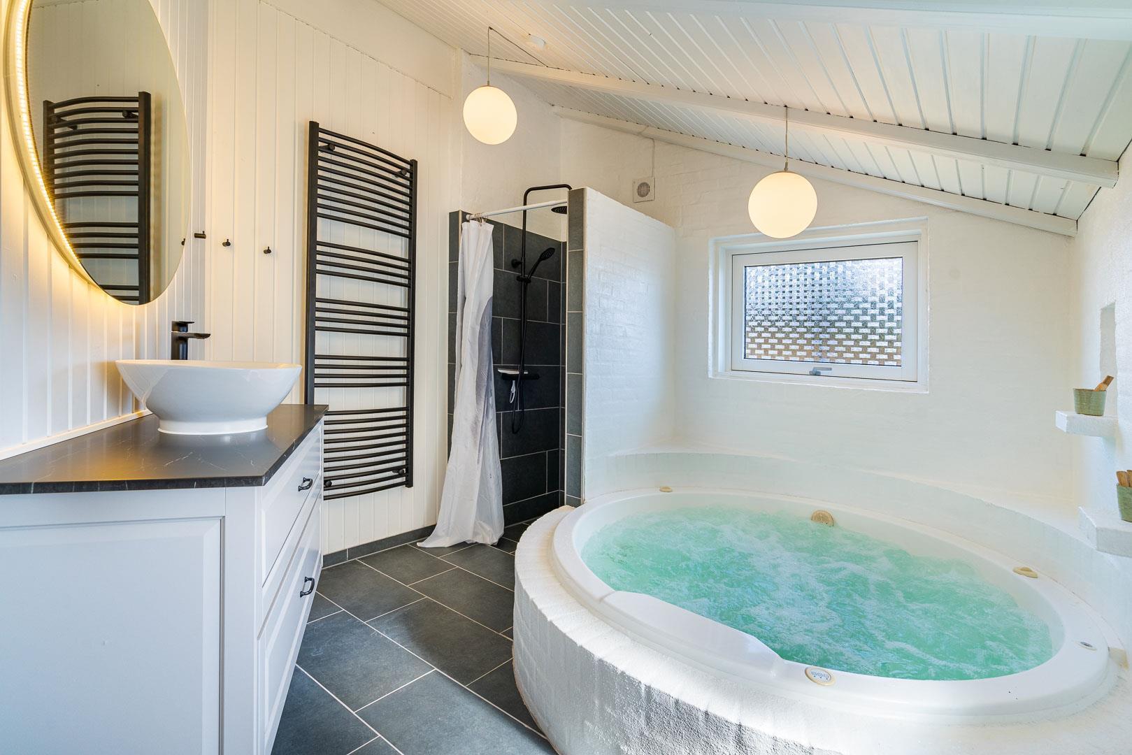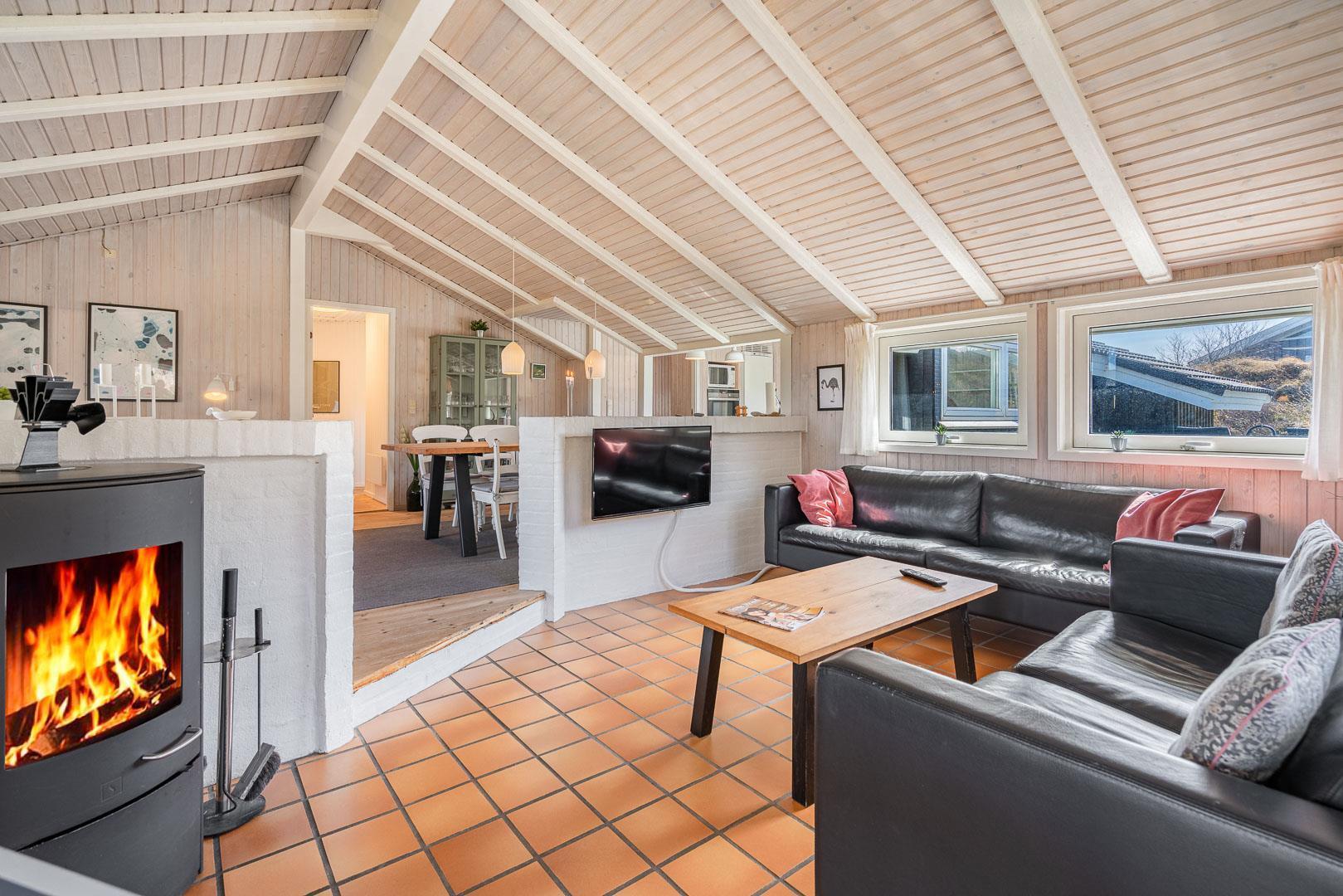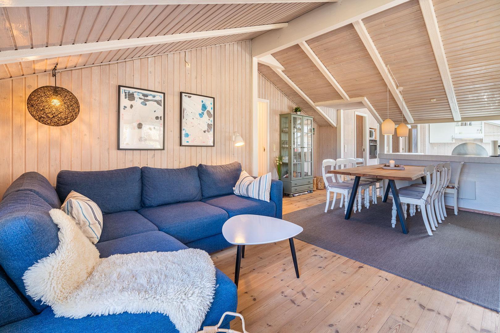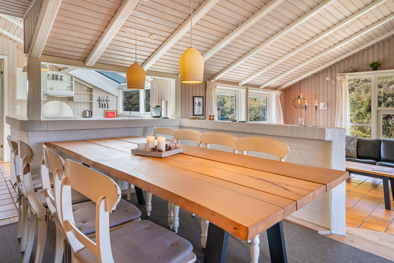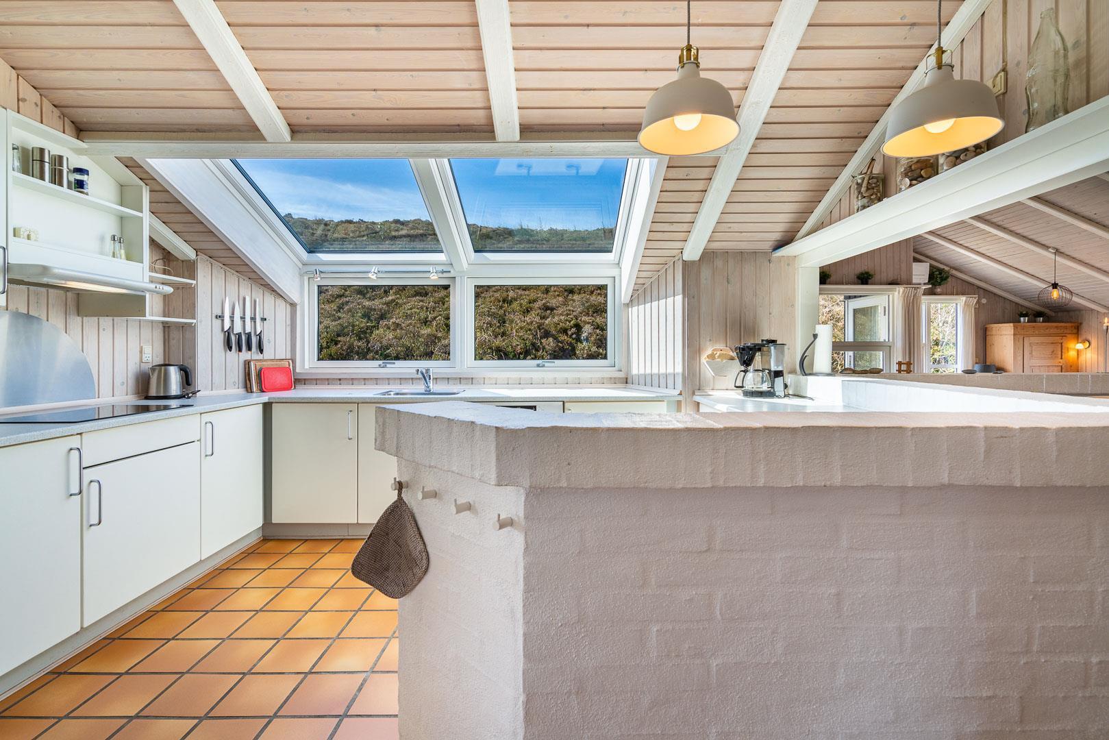 I rolige omgivelser for enden af blind stikvej finder I dette velholdte og velindrettede feriehus. Huset er omgivet af klitter, så der er gode læ muligheder på den delvis overdækkede terrasse. Der er et bryggers med vaskemaskine og tørretumbler, samt 2 badeværelser, hvoraf den ene er med spabad og sauna. Feriehuset råder over 4 soverum, 3 med dobbeltseng og et rum med 2 enkeltsenge. I åben forbindelse med husets køkken finder I spisepladsen og opholdsstuen, som er delt i 2 via et trappetrin. Der er også en brændeovn og energivenlig varmepumpe til rådighed. Den delvist overdækkede terrasse omkranser næsten hele huset, så I altid kan finde et læfyldt sted.