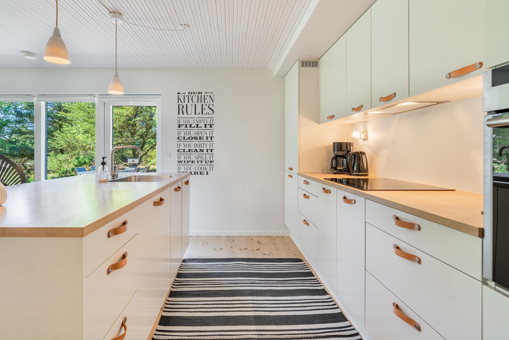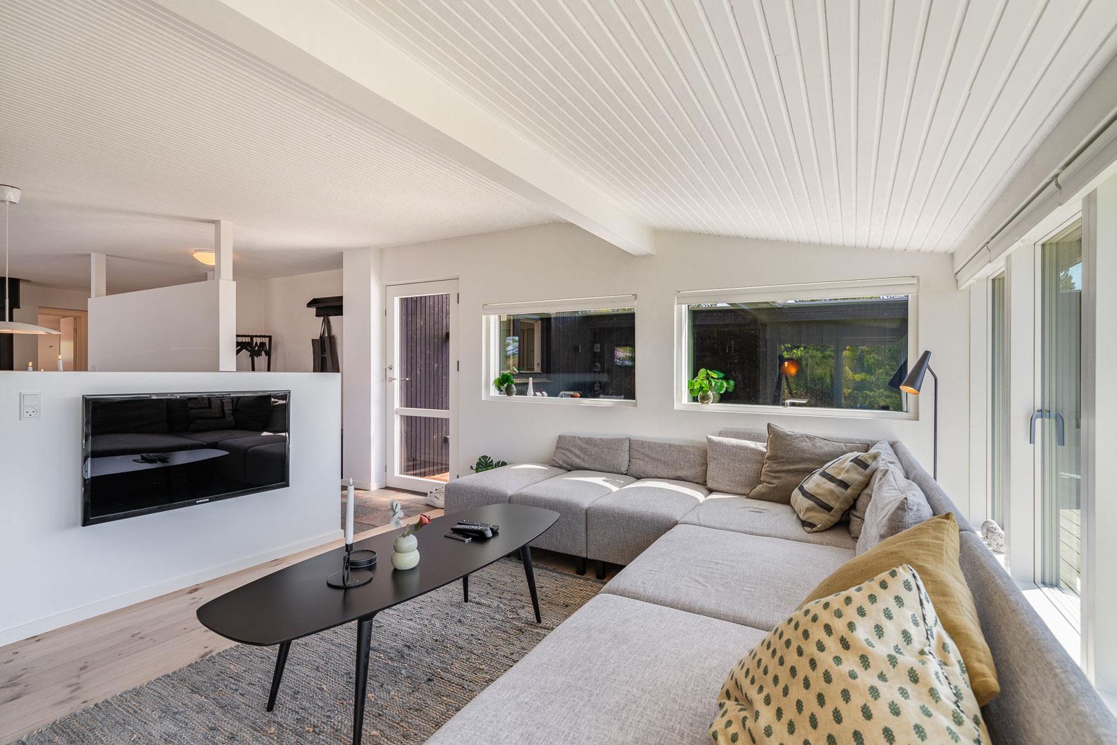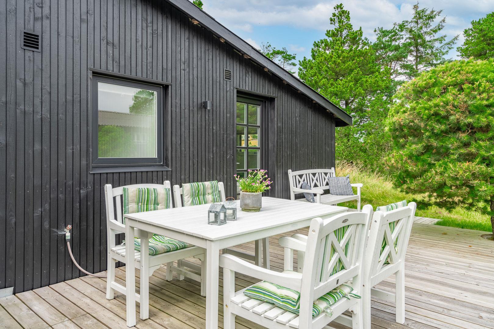 Sommerhuset ligger på en stor og dejlig naturgrund, og det fantastiske udendørs miljø byder på flere indbydende træterrasser, udstyret med alt hvad hjertet begærer af havemøbler og endda en udebruser til de varme sommerdage. En af terrasserne ligger direkte ved indgangen og er delvist overdækket, mens de andre to terrasser fordeler sig omkring sommerhuset og er forbundet med en charmerende gangbro af træ. Her finder du mange hyggekroge og gode læ forhold, som gør at du har rig mulighed for at til at ligge og slappe af og fordybe dig i en god bog eller sidde og spille et spil med resten af familien.