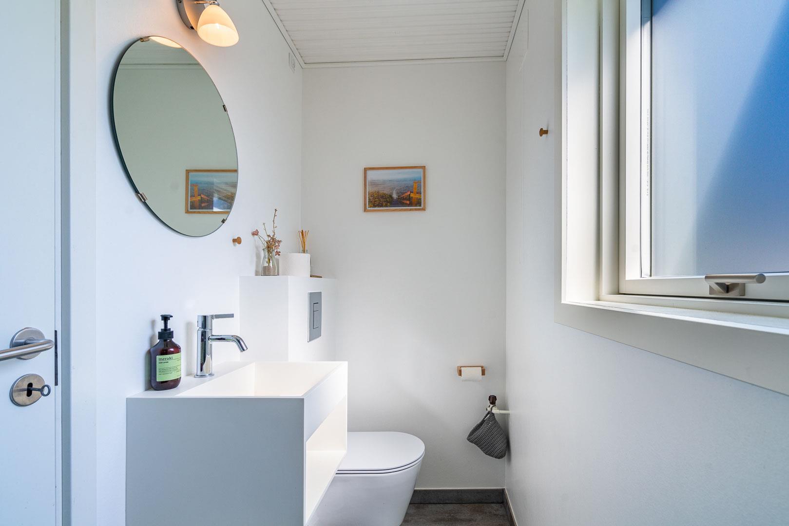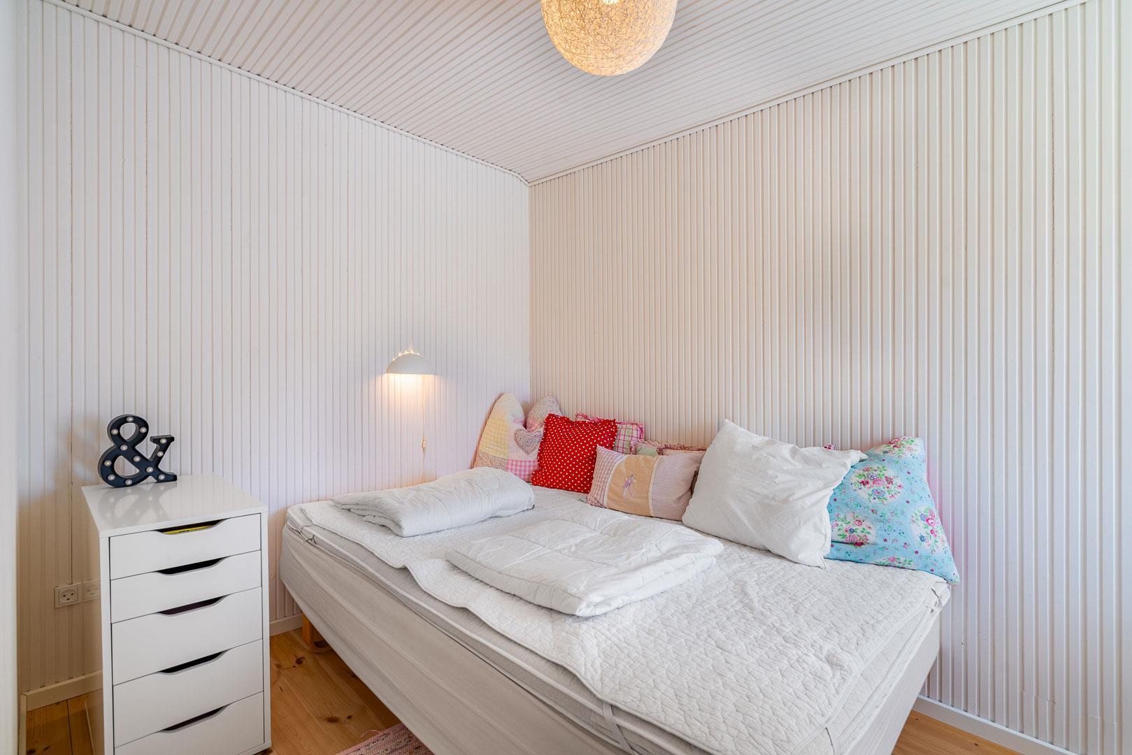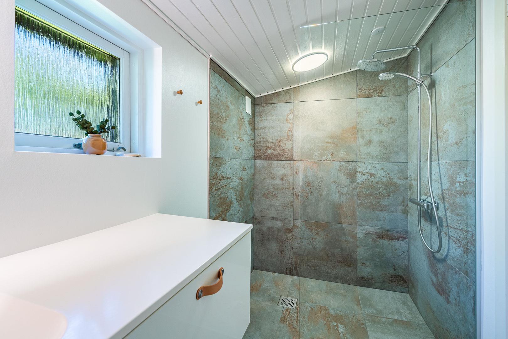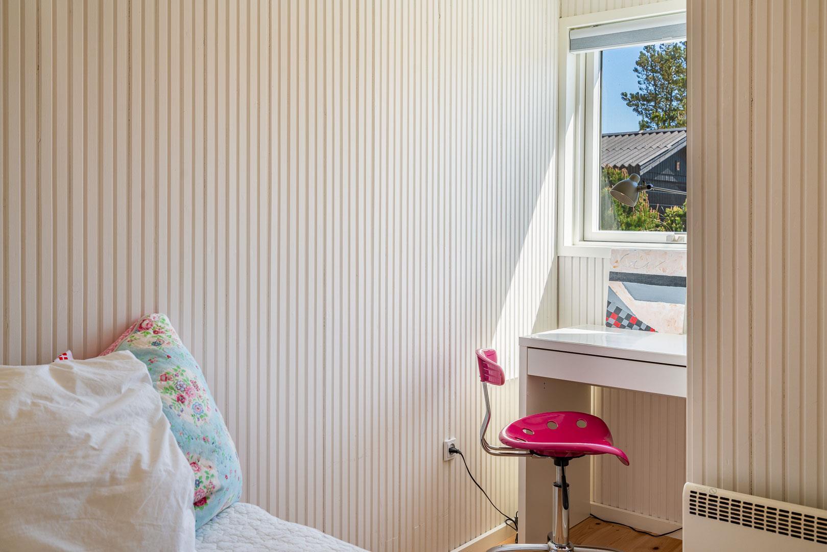 Sommerhuset ligger på en stor og dejlig naturgrund, og det fantastiske udendørs miljø byder på flere indbydende træterrasser, udstyret med alt hvad hjertet begærer af havemøbler og endda en udebruser til de varme sommerdage. En af terrasserne ligger direkte ved indgangen og er delvist overdækket, mens de andre to terrasser fordeler sig omkring sommerhuset og er forbundet med en charmerende gangbro af træ. Her finder du mange hyggekroge og gode læ forhold, som gør at du har rig mulighed for at til at ligge og slappe af og fordybe dig i en god bog eller sidde og spille et spil med resten af familien.