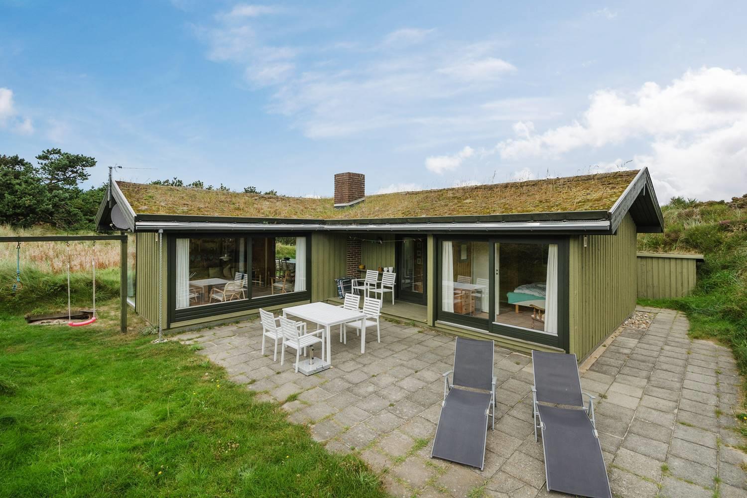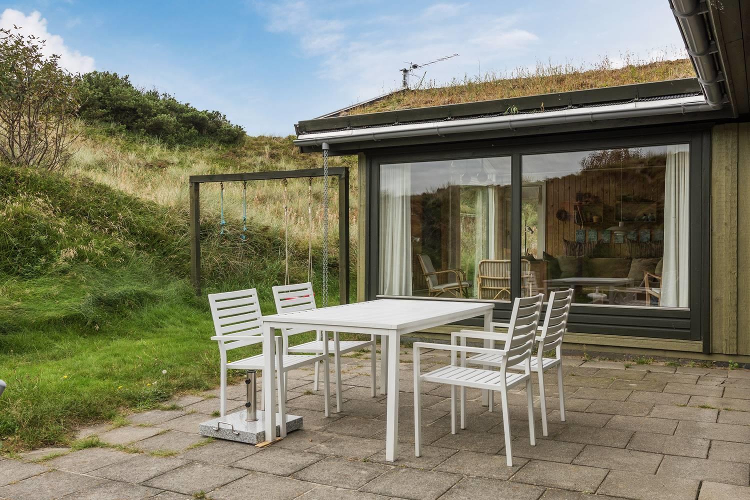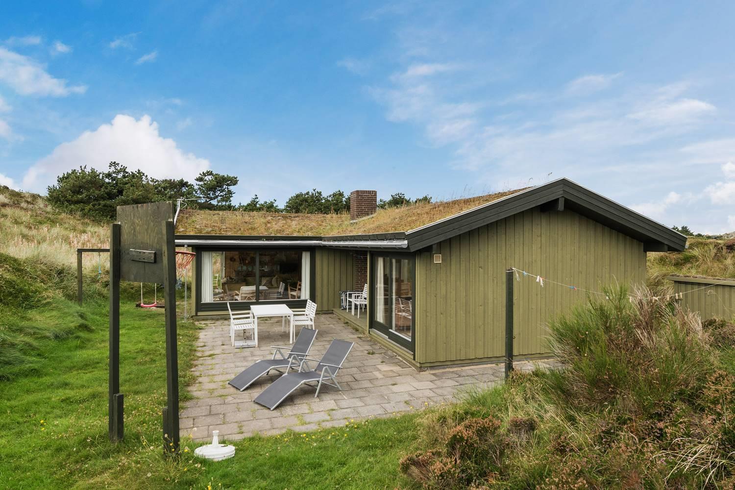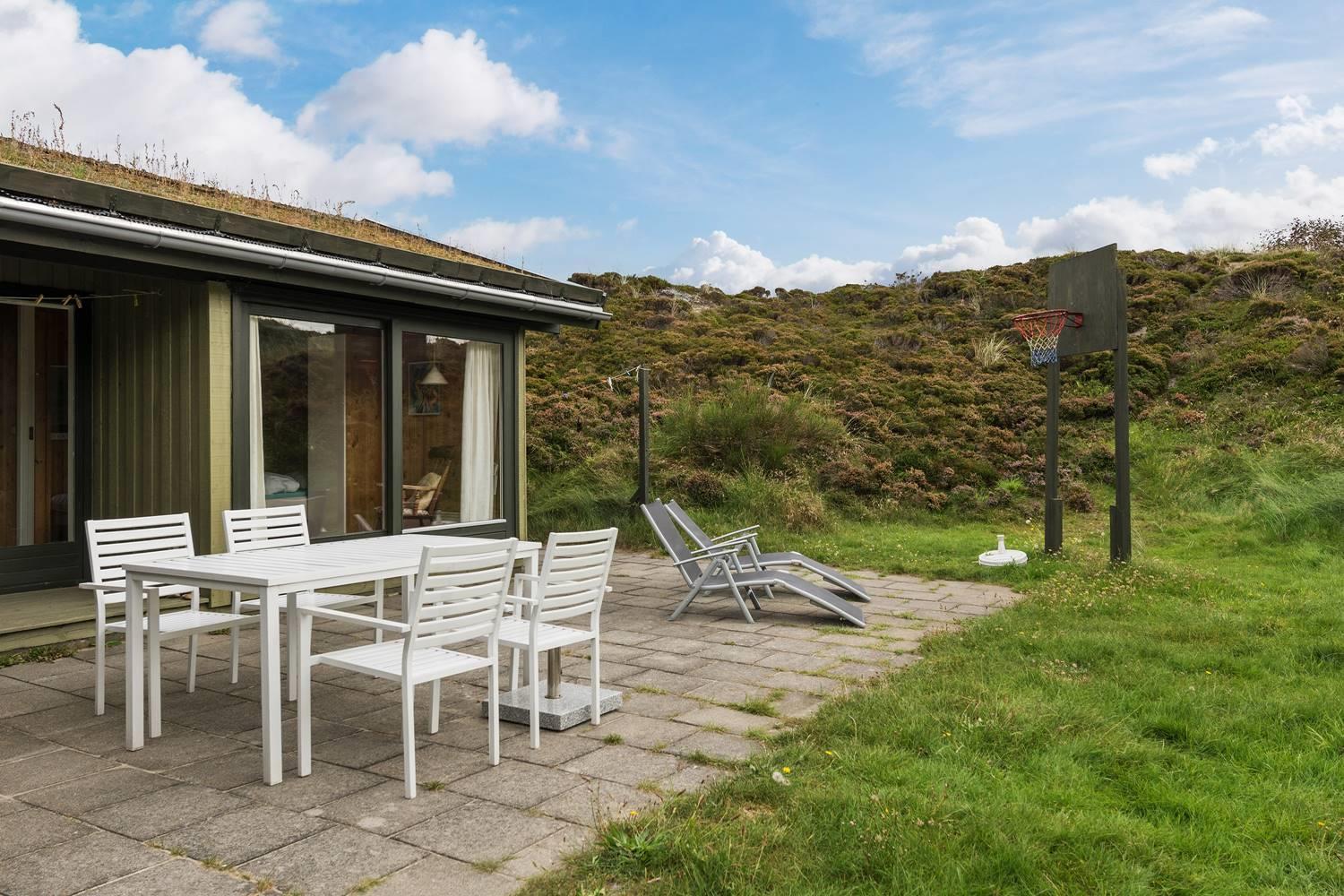 Feriehuset Storkenæbvej 12 ligger ugeneret på klitgrund tæt ved Henne Strand med dejlig terrasse og moderne faciliteter.