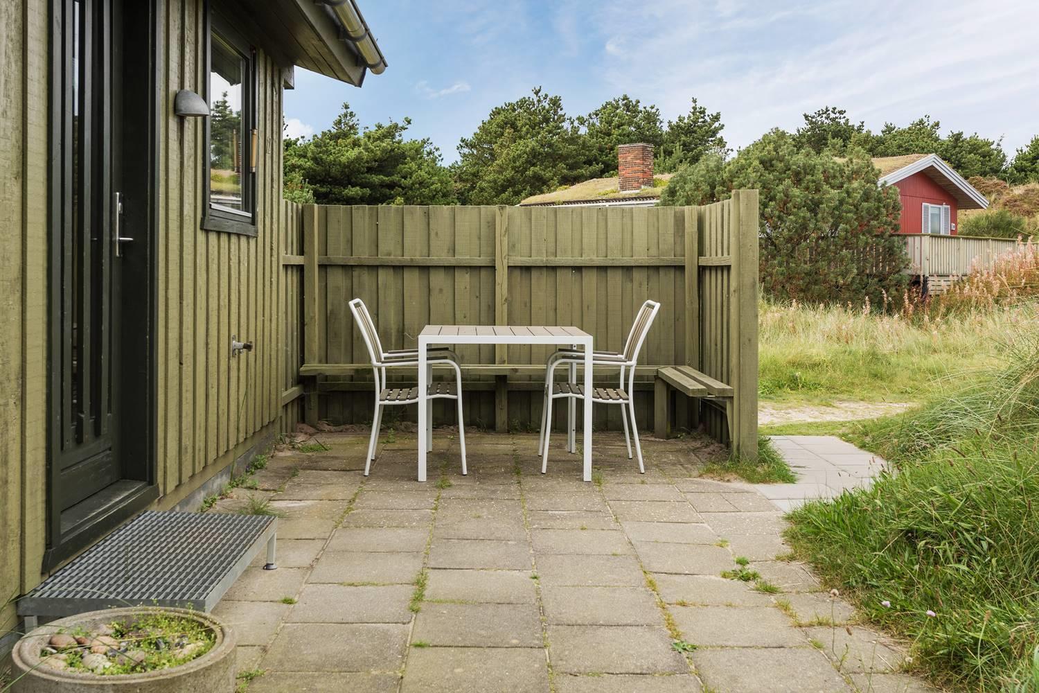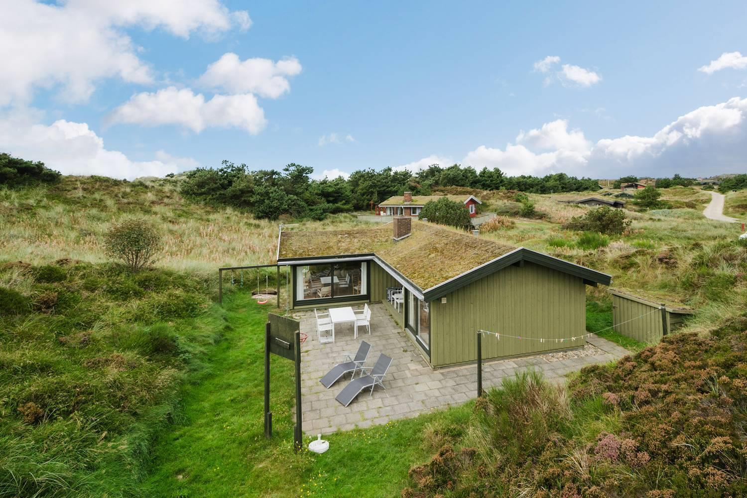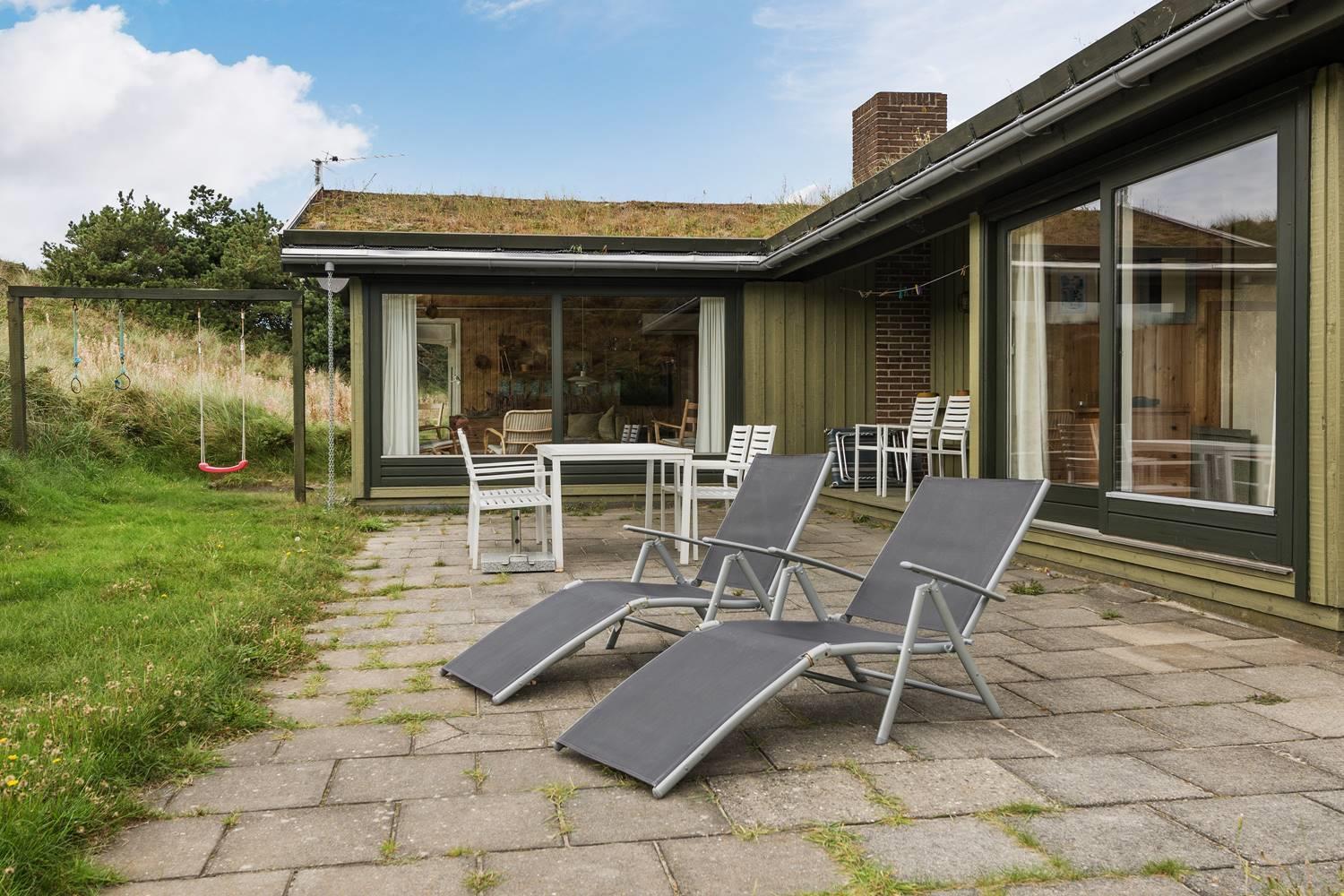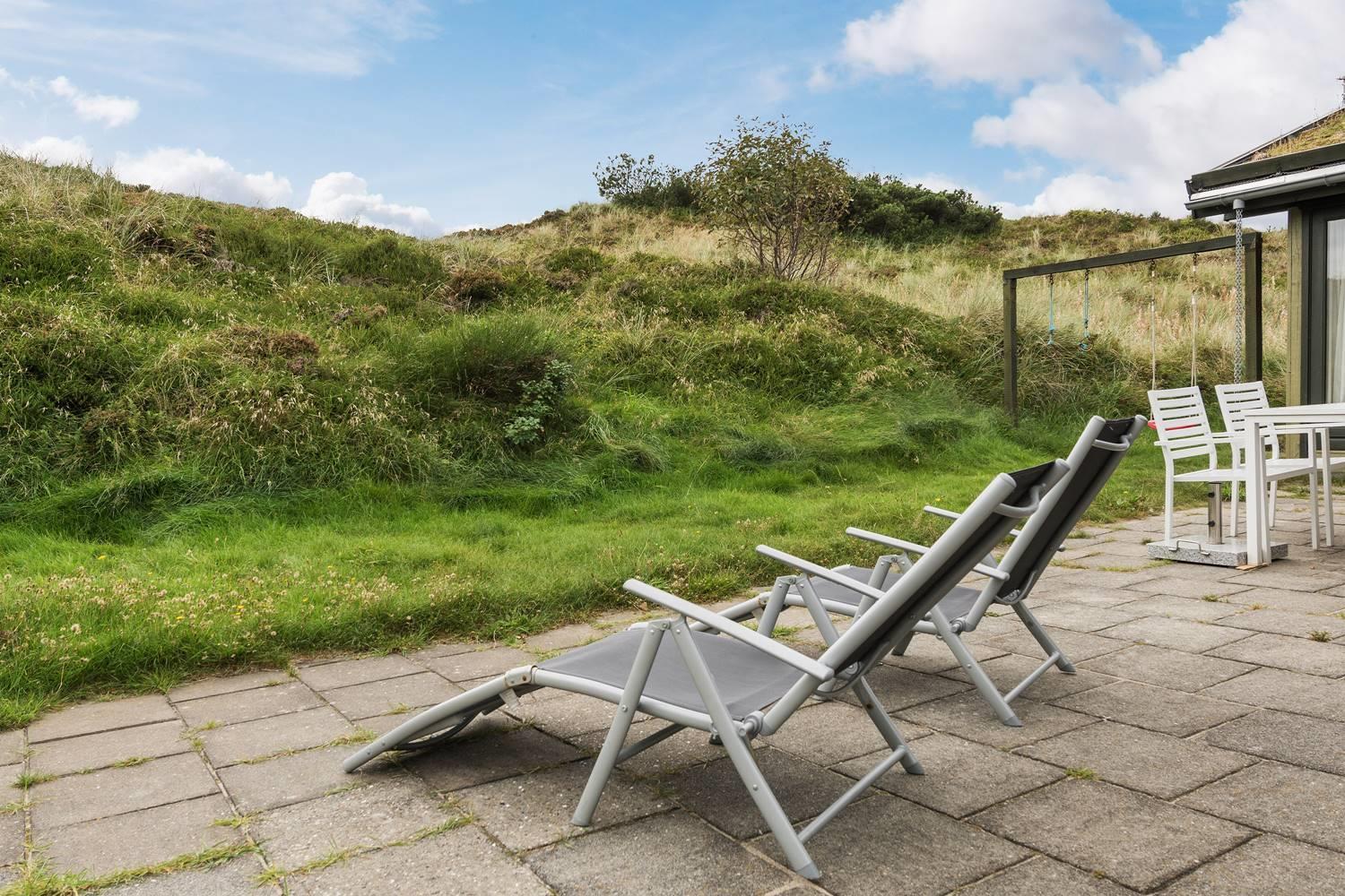 Feriehuset Storkenæbvej 12 ligger ugeneret på klitgrund tæt ved Henne Strand med dejlig terrasse og moderne faciliteter.