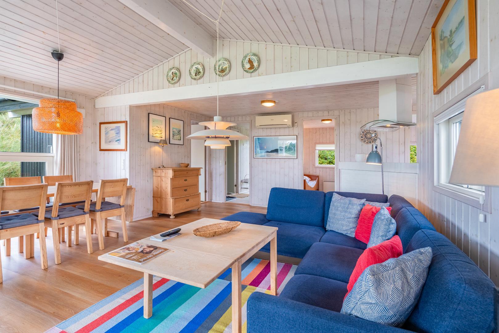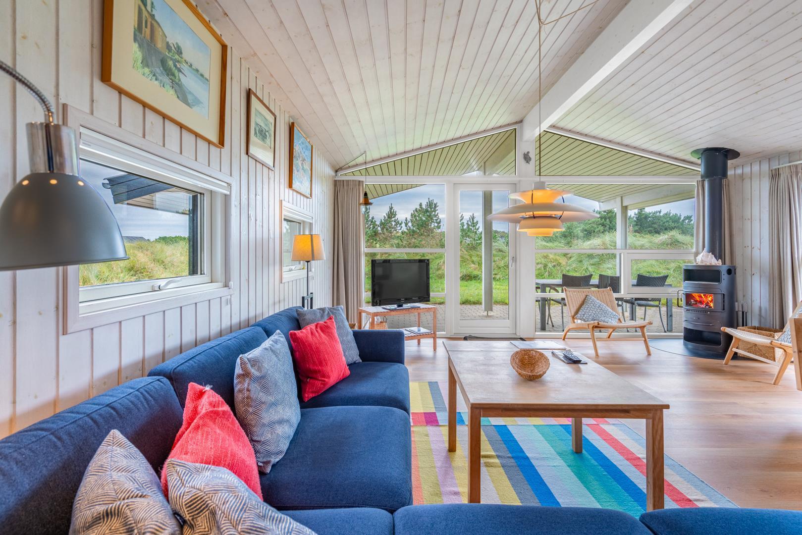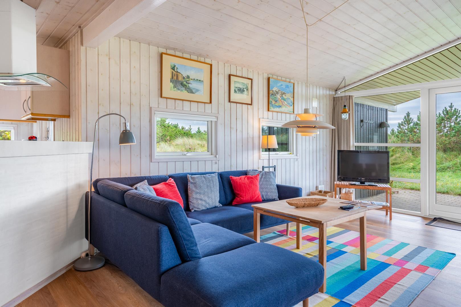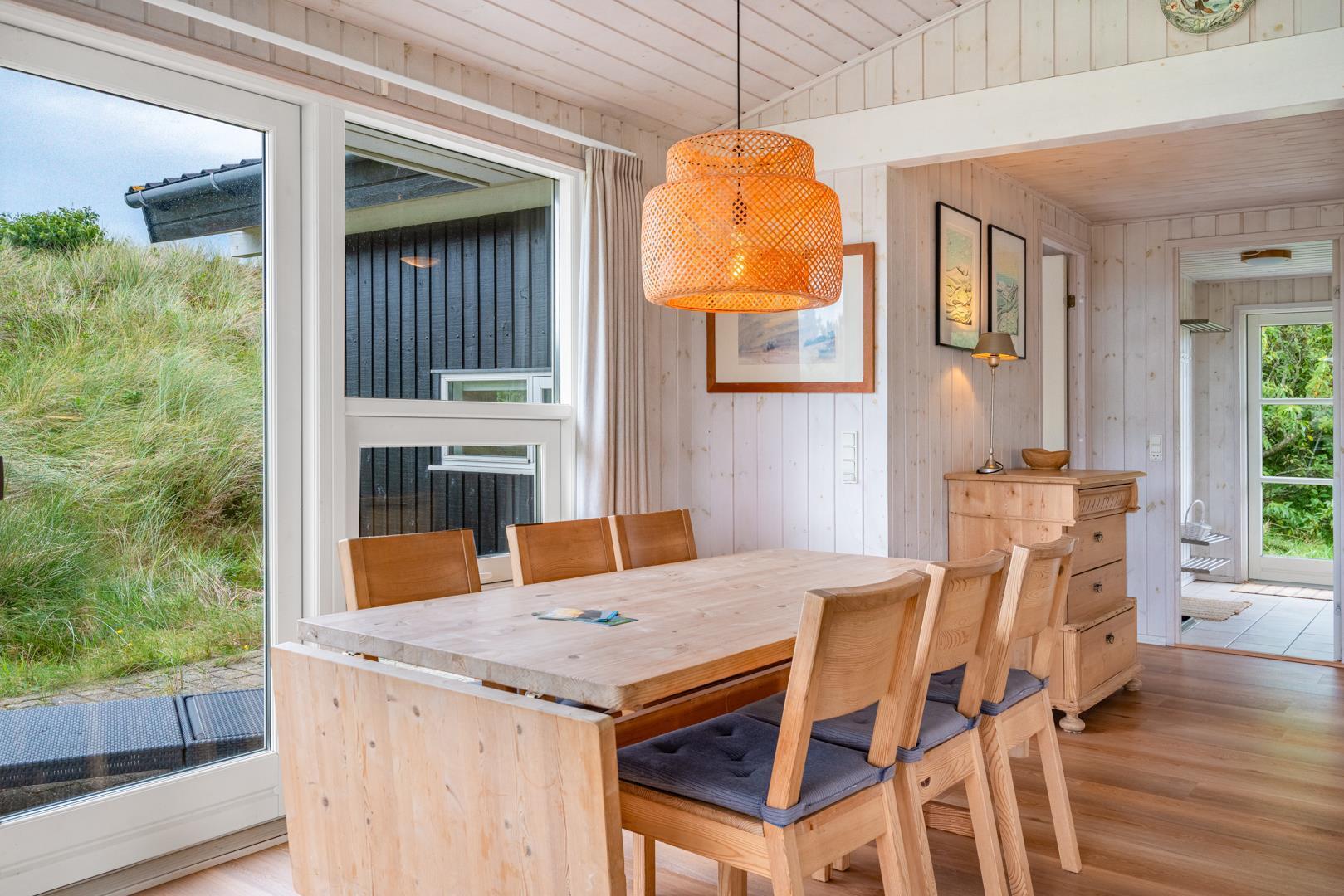 Charmerende feriehus nær Vesterhavet med sauna, smuk klitudsigt og flere terrasser i fredelige omgivelser.