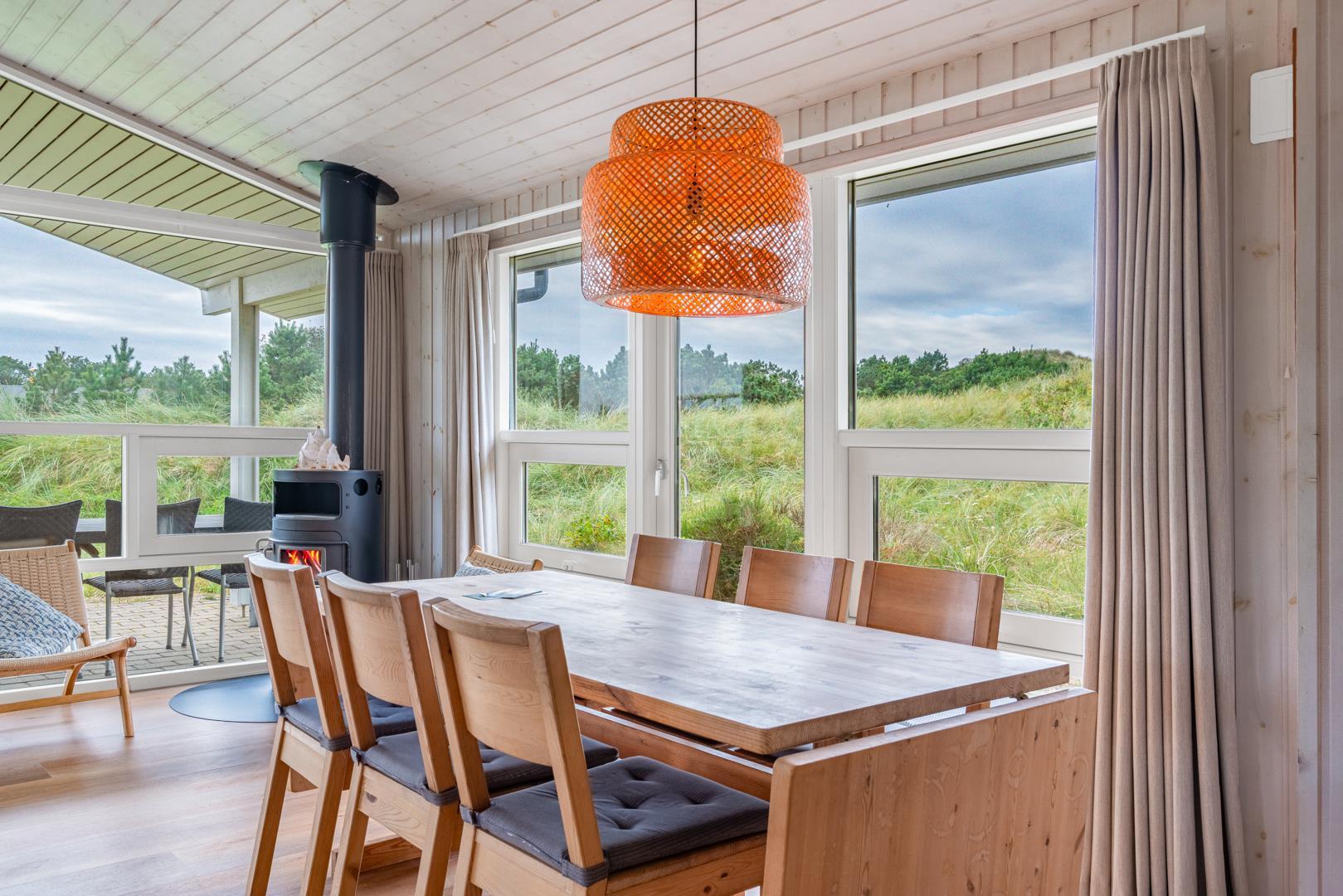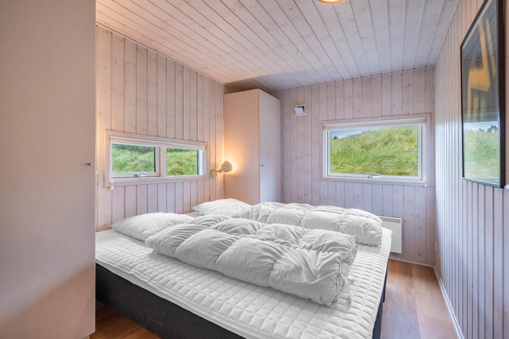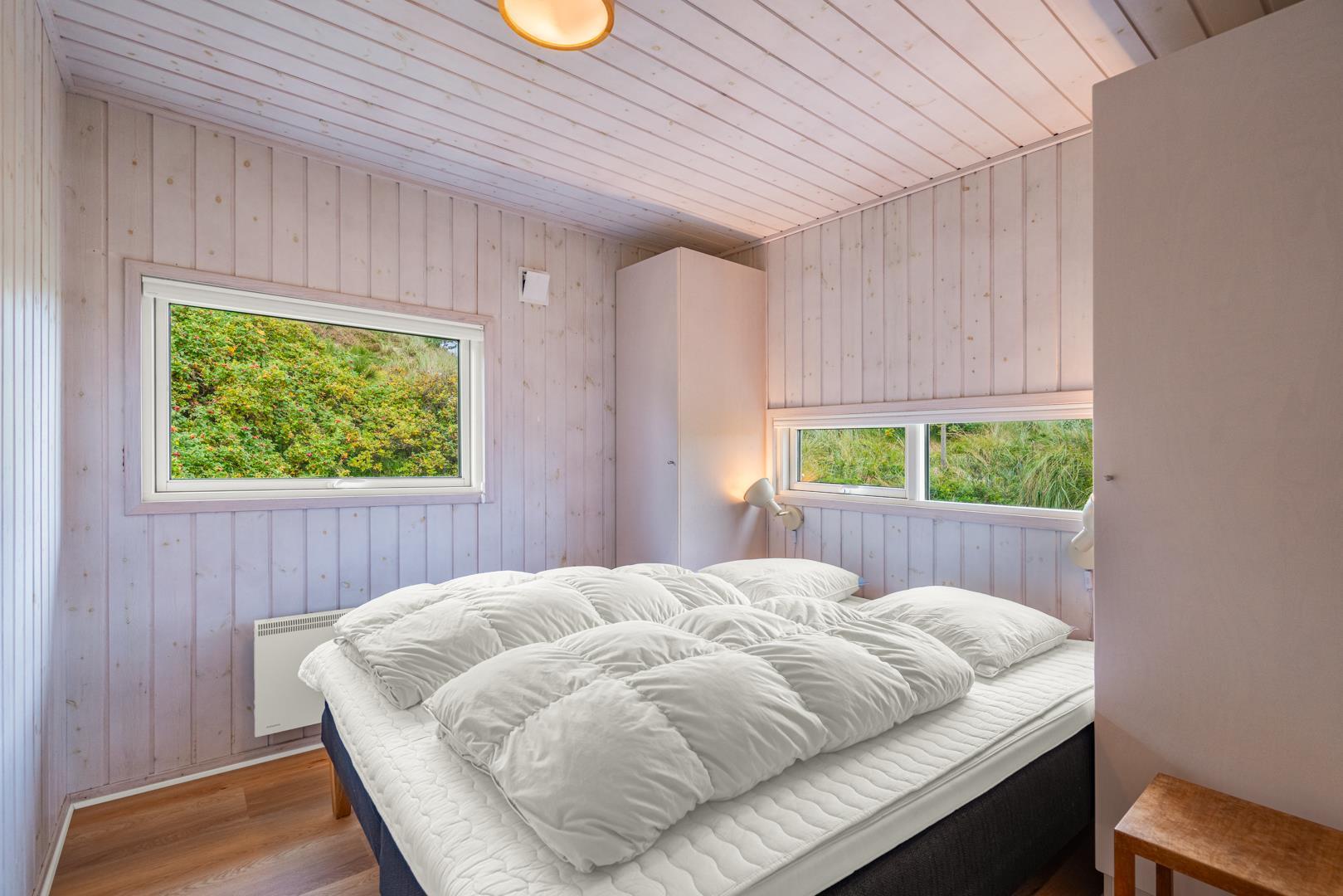 Fantastisk feriehus beliggende i første klitrække ud til stort, fredet naturområde på en blind vej, kun 200 m fra vesterhavet. Flere dejlige terrasser hvoraf en er delvis overdækket. Dejligt badeværelse med sauna. Den velindrettede køkkenafdeling er bl.a. udstyret med mikrobølgeovn og opvaskemaskine. Fra den hyggelige og smagfuldt indrettede opholdsstue er der udsigt til flotte klitarealer. 2 værelser med dobbeltsenge og 1 værelse med 2 enkeltsenge til 2 børn. Et lækkert hus i naturskønne omgivelser.