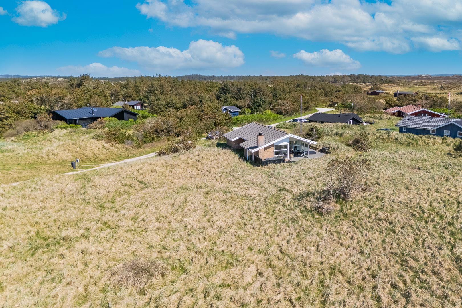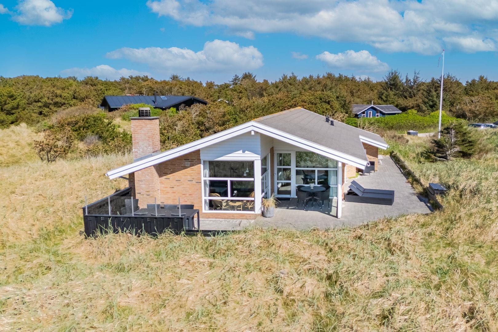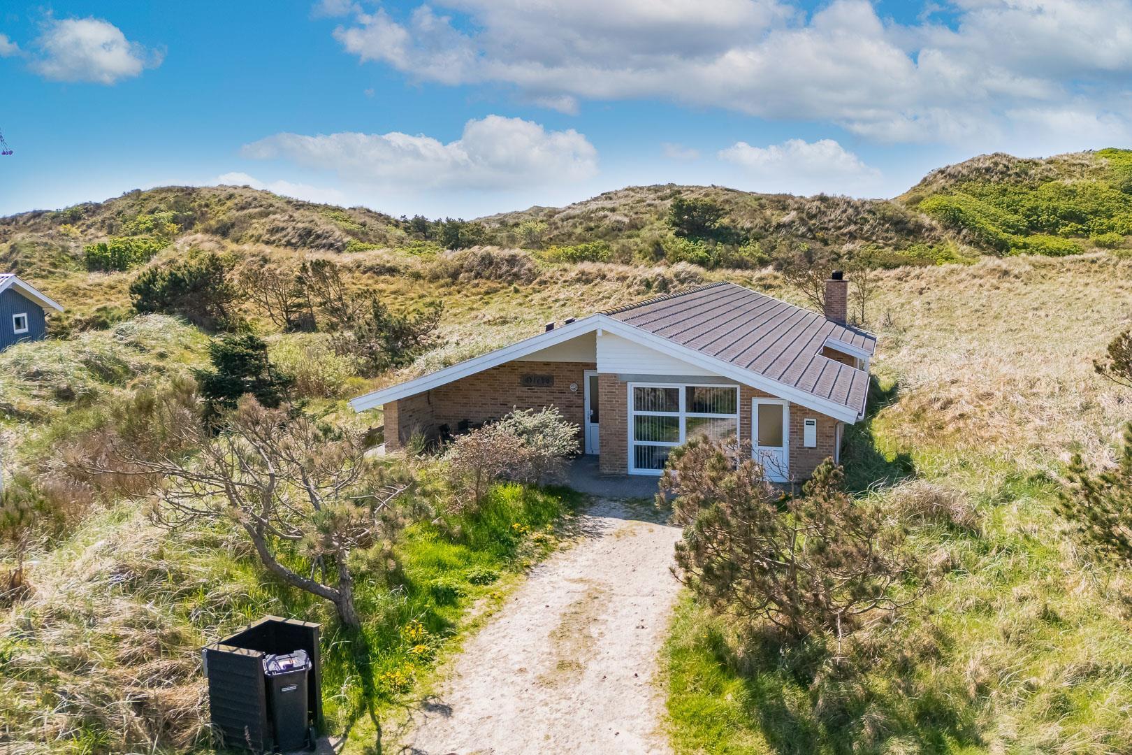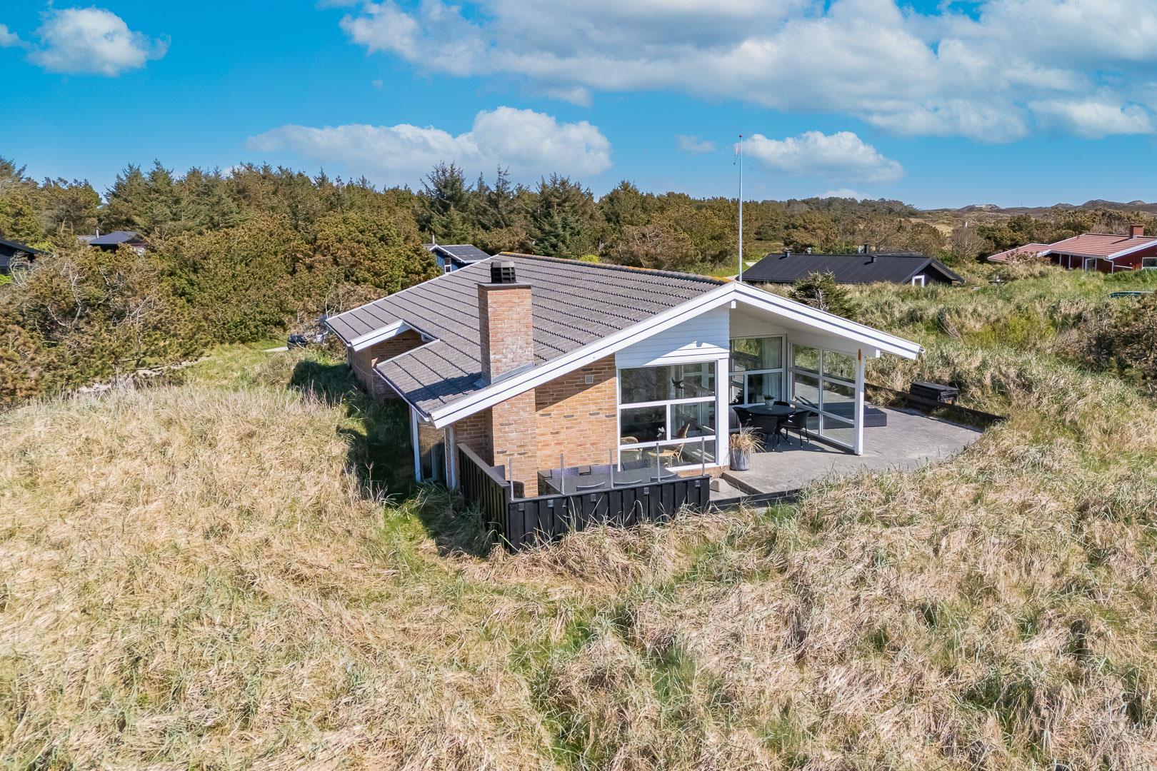 På en stor flot naturgrund ligger dette velpassede feriehus helt ugeneret og med pragtfuld udsigt over det fredede klitområde. Nyere køkken med åben forbindelse til den velmøblerede stue. 3 gode soverum som er udstyrede med boksmadrasser. Nyt flot badeværelse med badekar og sauna, samt ekstra WC i forbindelse med det ene soverum. Tre terrasser omkranser huset, så udelivet og den skønne udsigt kan nydes hele dagen. Fra køkken/spiseafdeling er der direkte udgang til terrasse hvoraf den ene er overdækket. . Et 'super-hus', hvor rammerne er til stede for en rigtig god ferie - hele året.