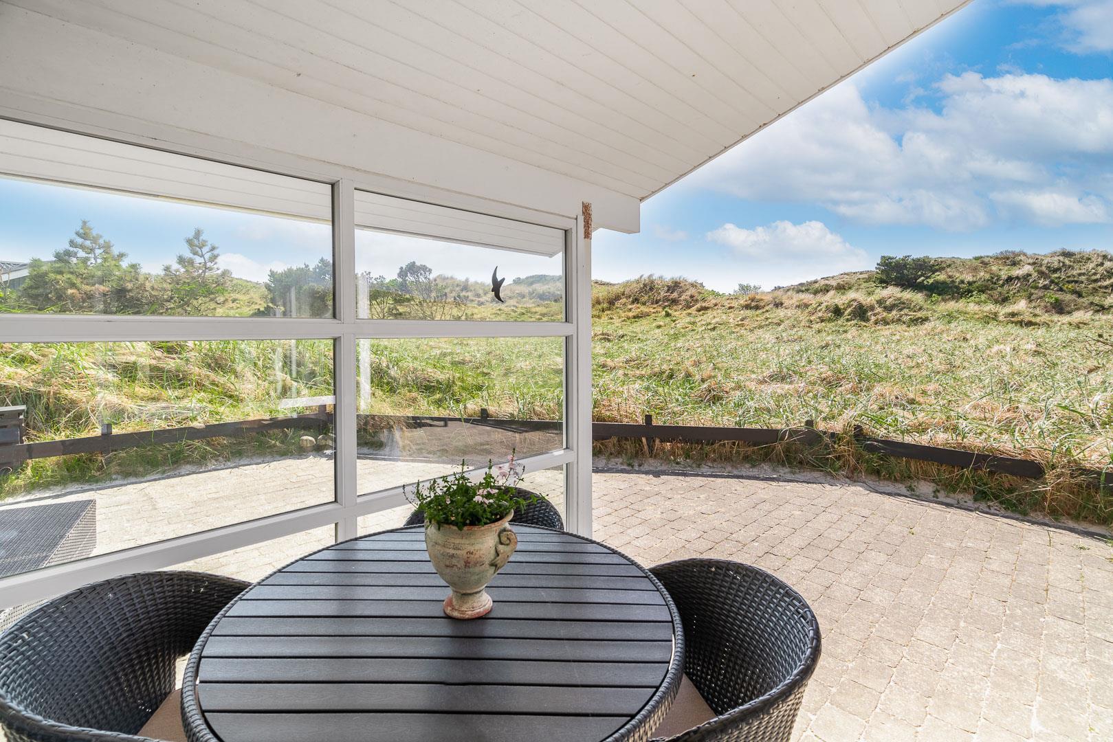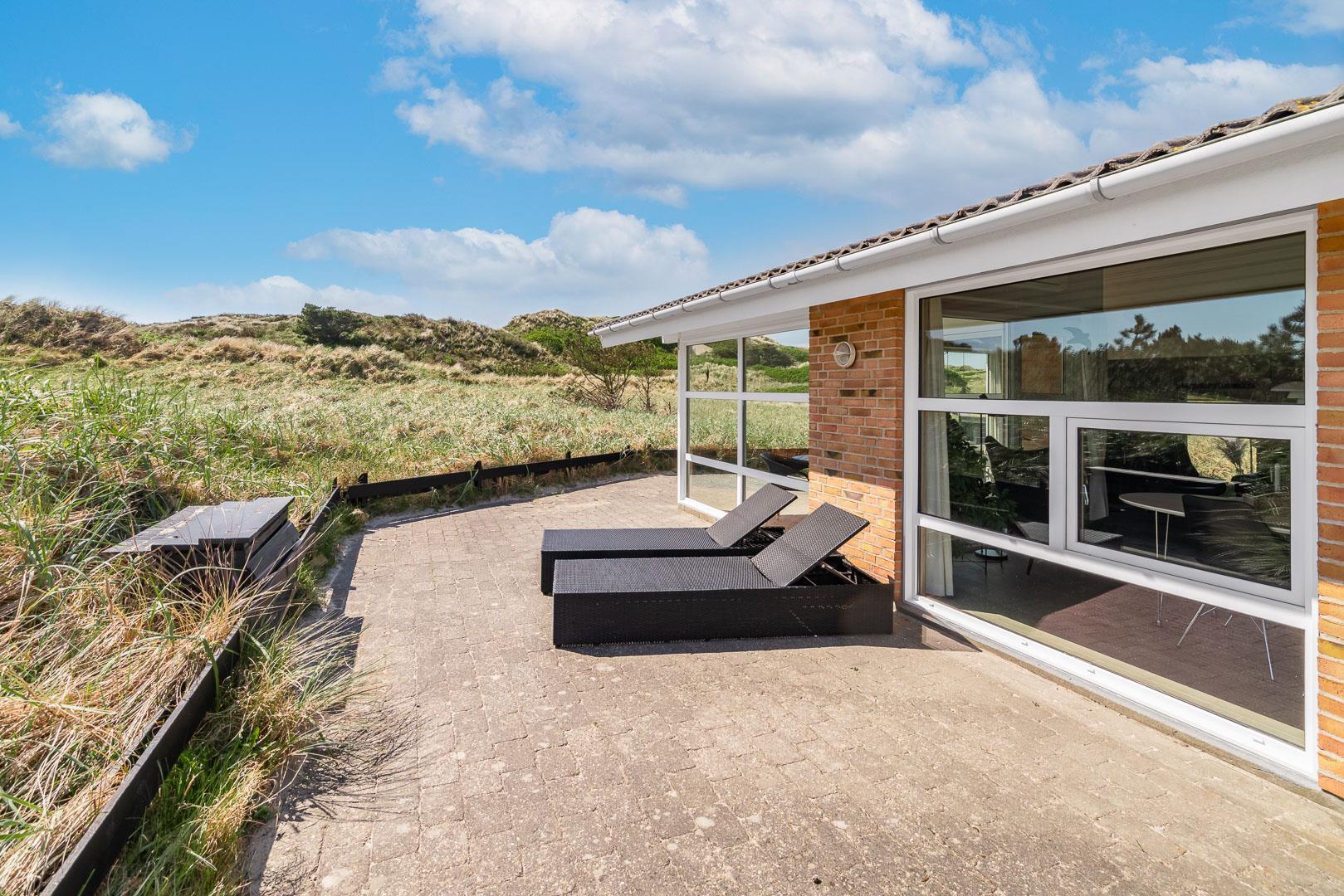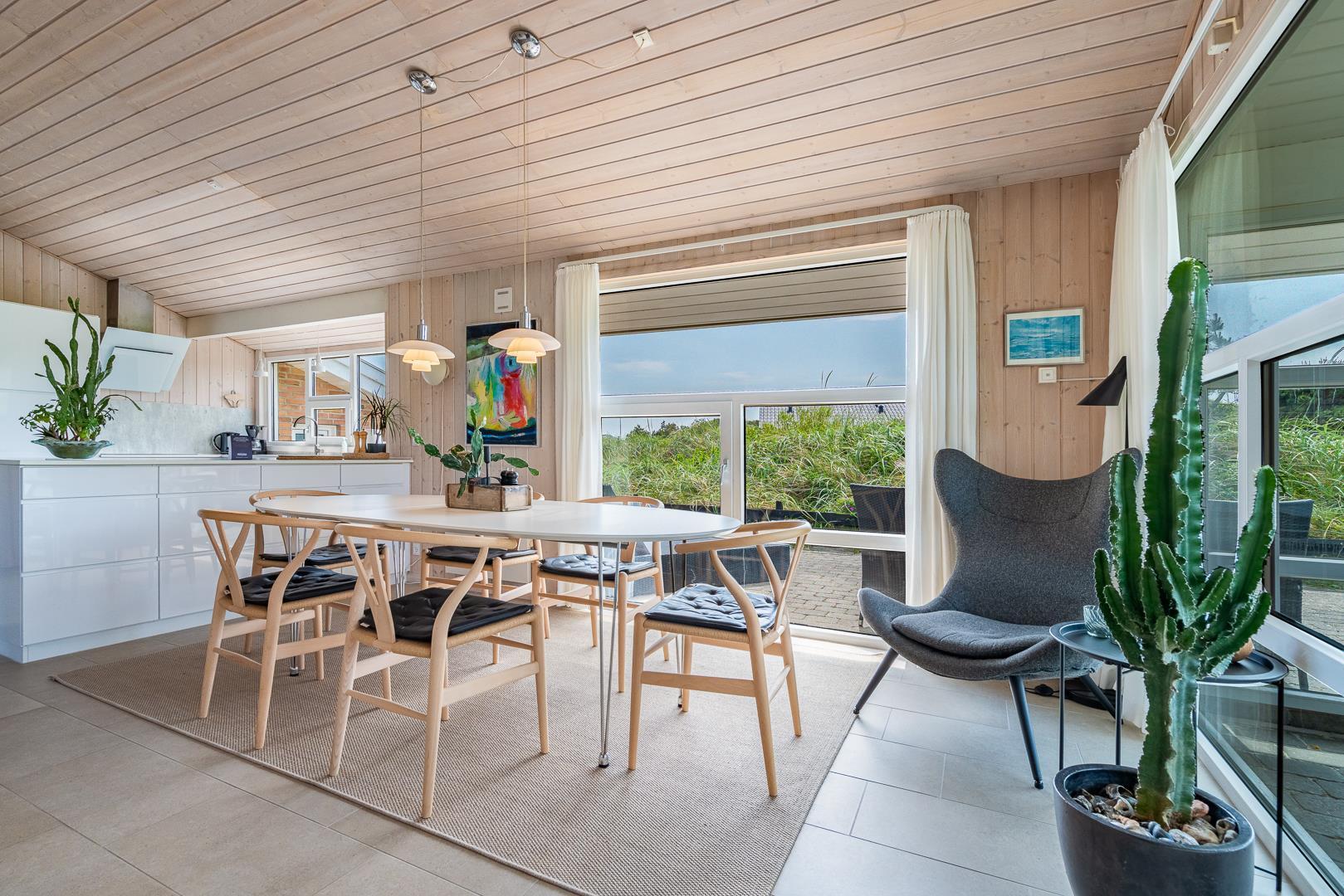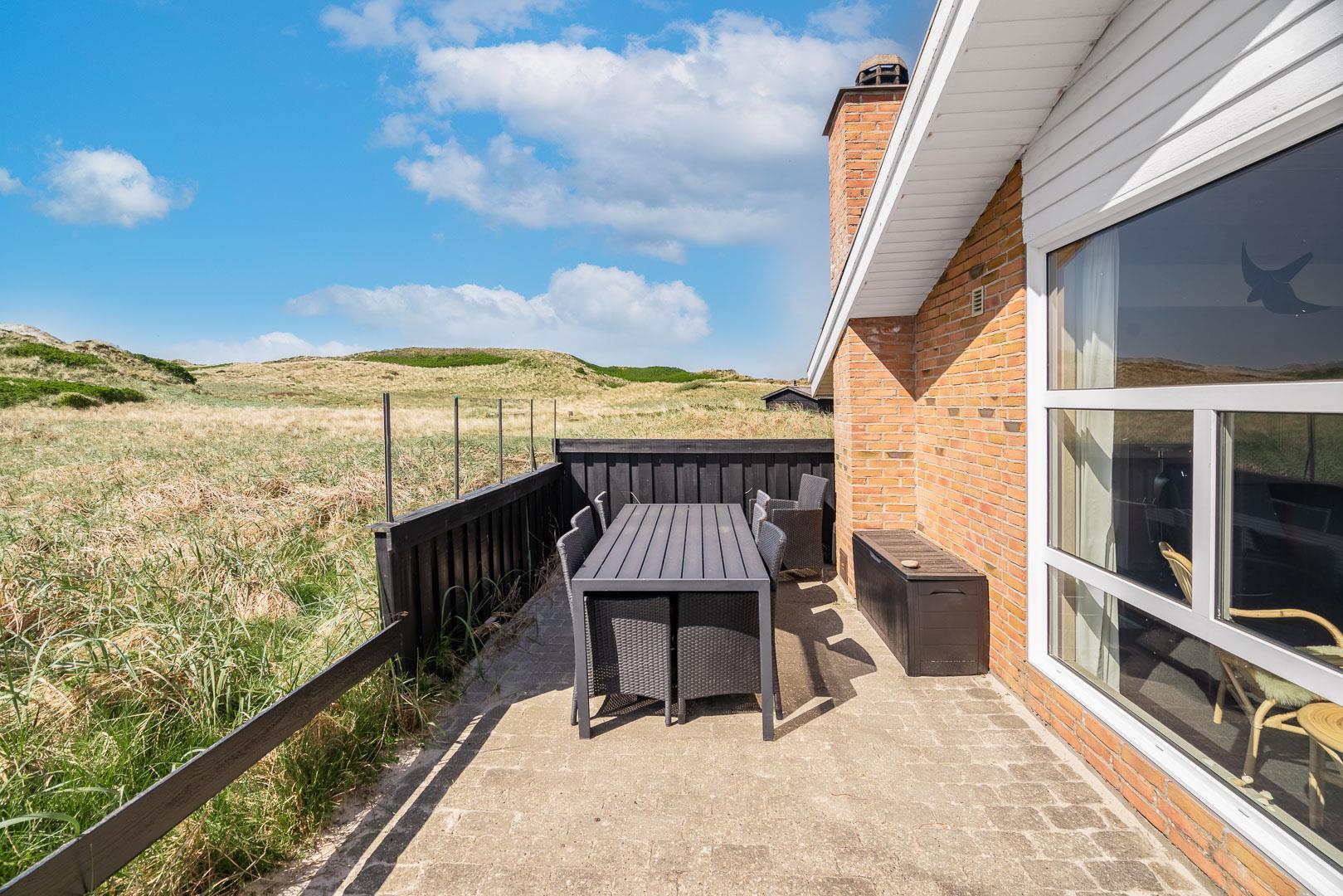 På en stor flot naturgrund ligger dette velpassede feriehus helt ugeneret og med pragtfuld udsigt over det fredede klitområde. Nyere køkken med åben forbindelse til den velmøblerede stue. 3 gode soverum som er udstyrede med boksmadrasser. Nyt flot badeværelse med badekar og sauna, samt ekstra WC i forbindelse med det ene soverum. Tre terrasser omkranser huset, så udelivet og den skønne udsigt kan nydes hele dagen. Fra køkken/spiseafdeling er der direkte udgang til terrasse hvoraf den ene er overdækket. . Et 'super-hus', hvor rammerne er til stede for en rigtig god ferie - hele året.