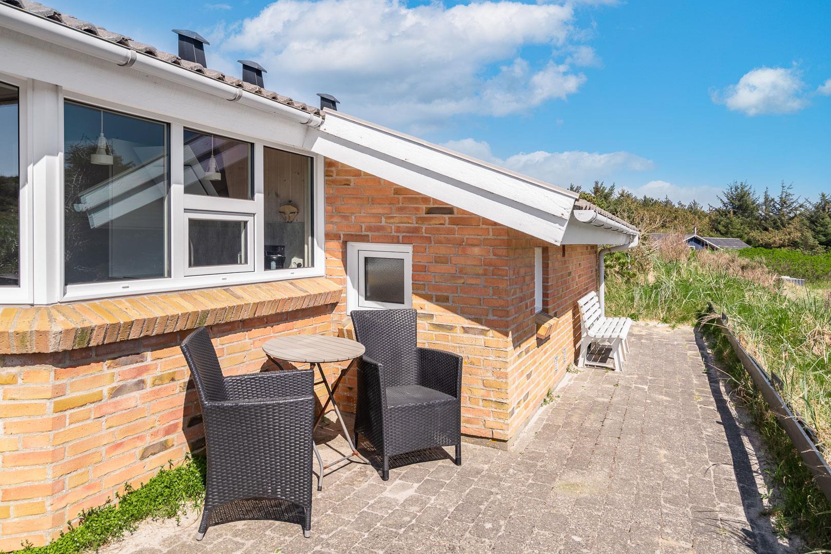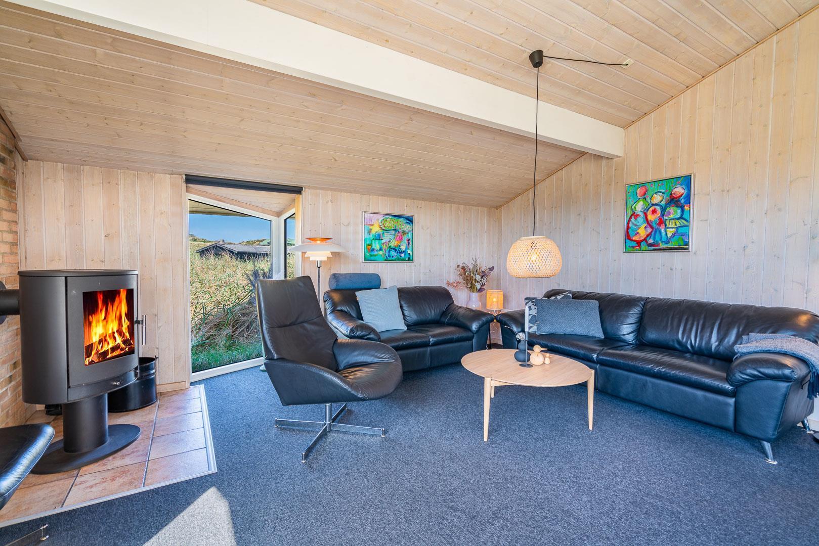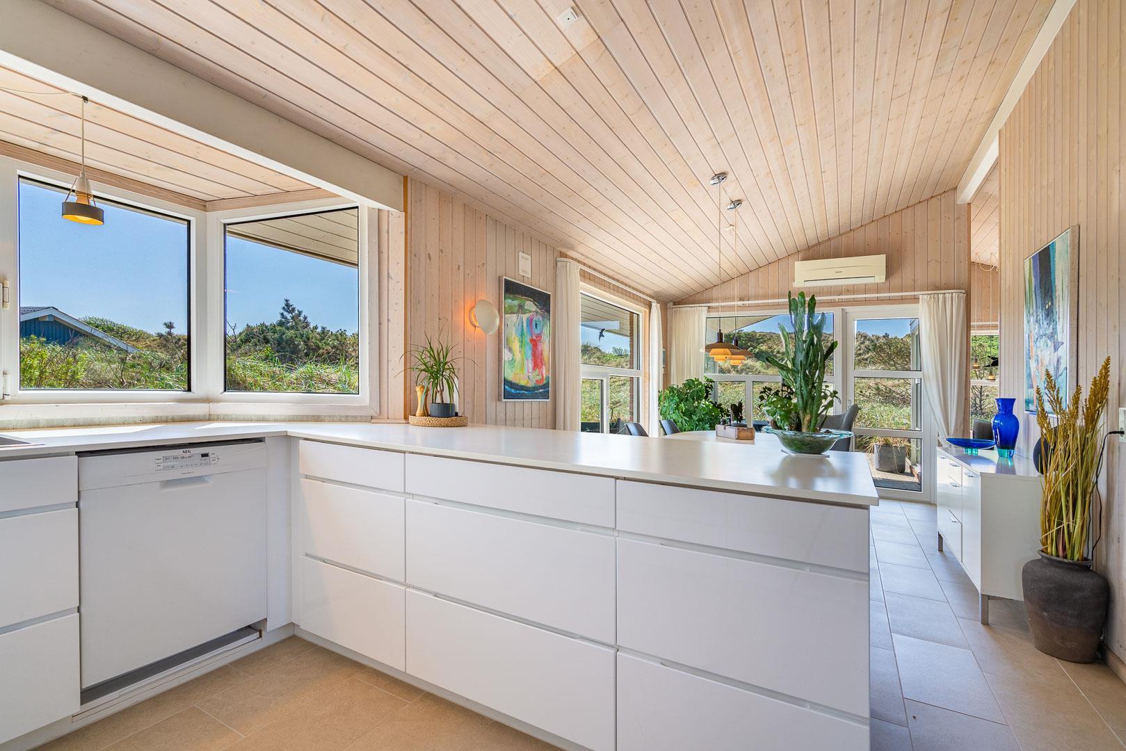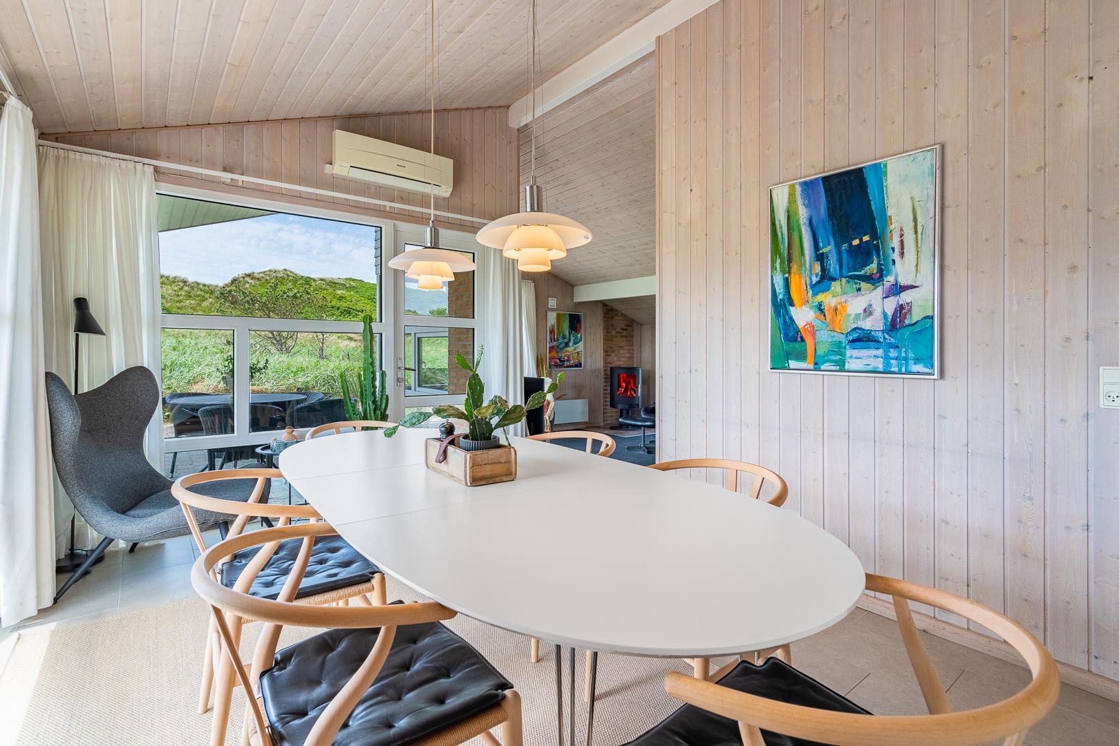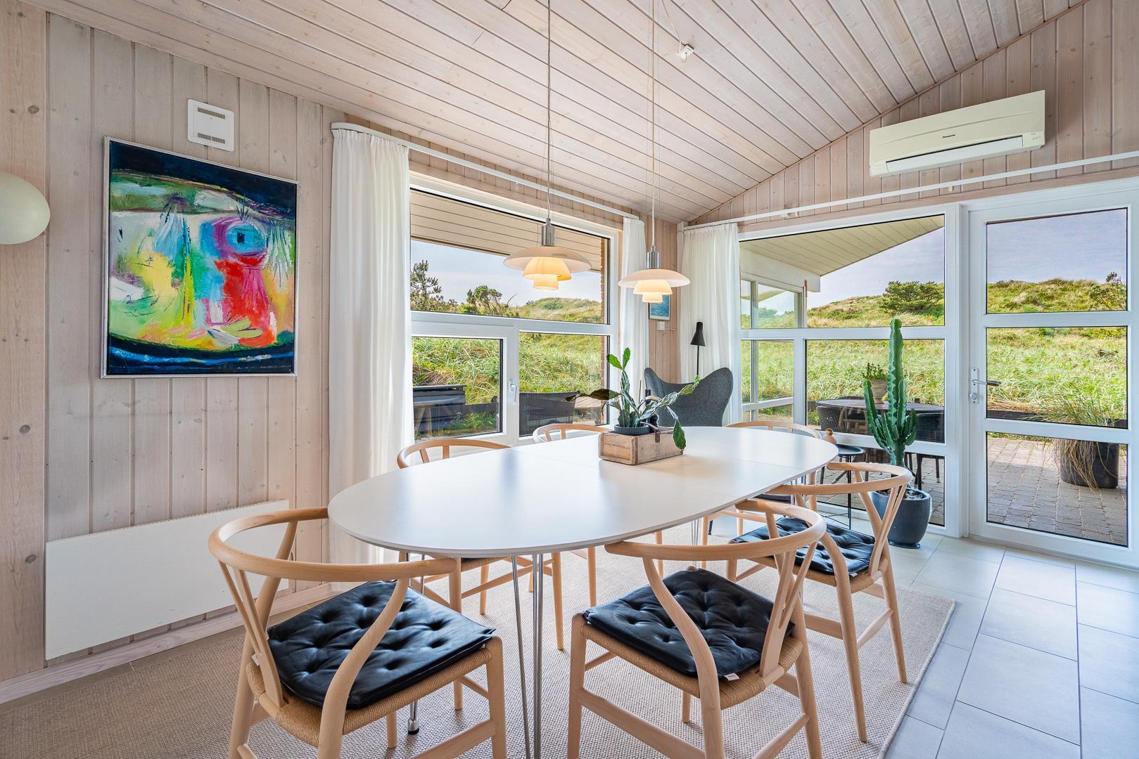 På en stor flot naturgrund ligger dette velpassede feriehus helt ugeneret og med pragtfuld udsigt over det fredede klitområde. Nyere køkken med åben forbindelse til den velmøblerede stue. 3 gode soverum som er udstyrede med boksmadrasser. Nyt flot badeværelse med badekar og sauna, samt ekstra WC i forbindelse med det ene soverum. Tre terrasser omkranser huset, så udelivet og den skønne udsigt kan nydes hele dagen. Fra køkken/spiseafdeling er der direkte udgang til terrasse hvoraf den ene er overdækket. . Et 'super-hus', hvor rammerne er til stede for en rigtig god ferie - hele året.