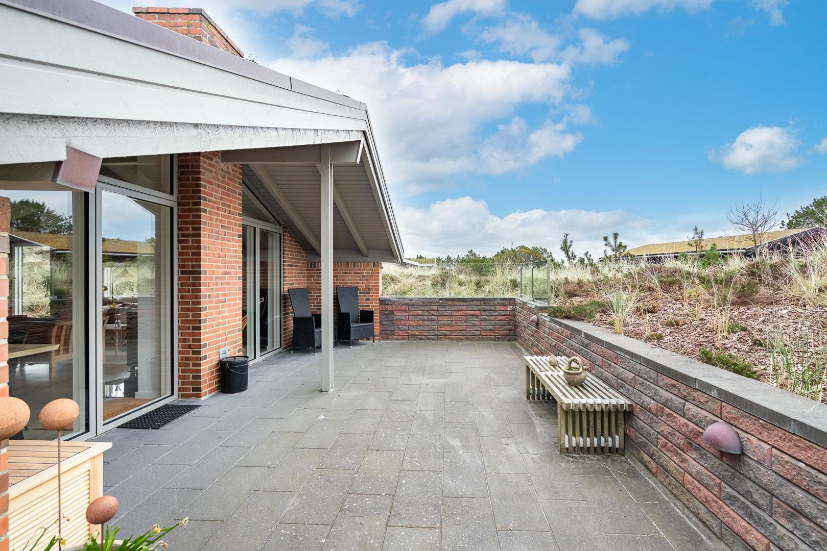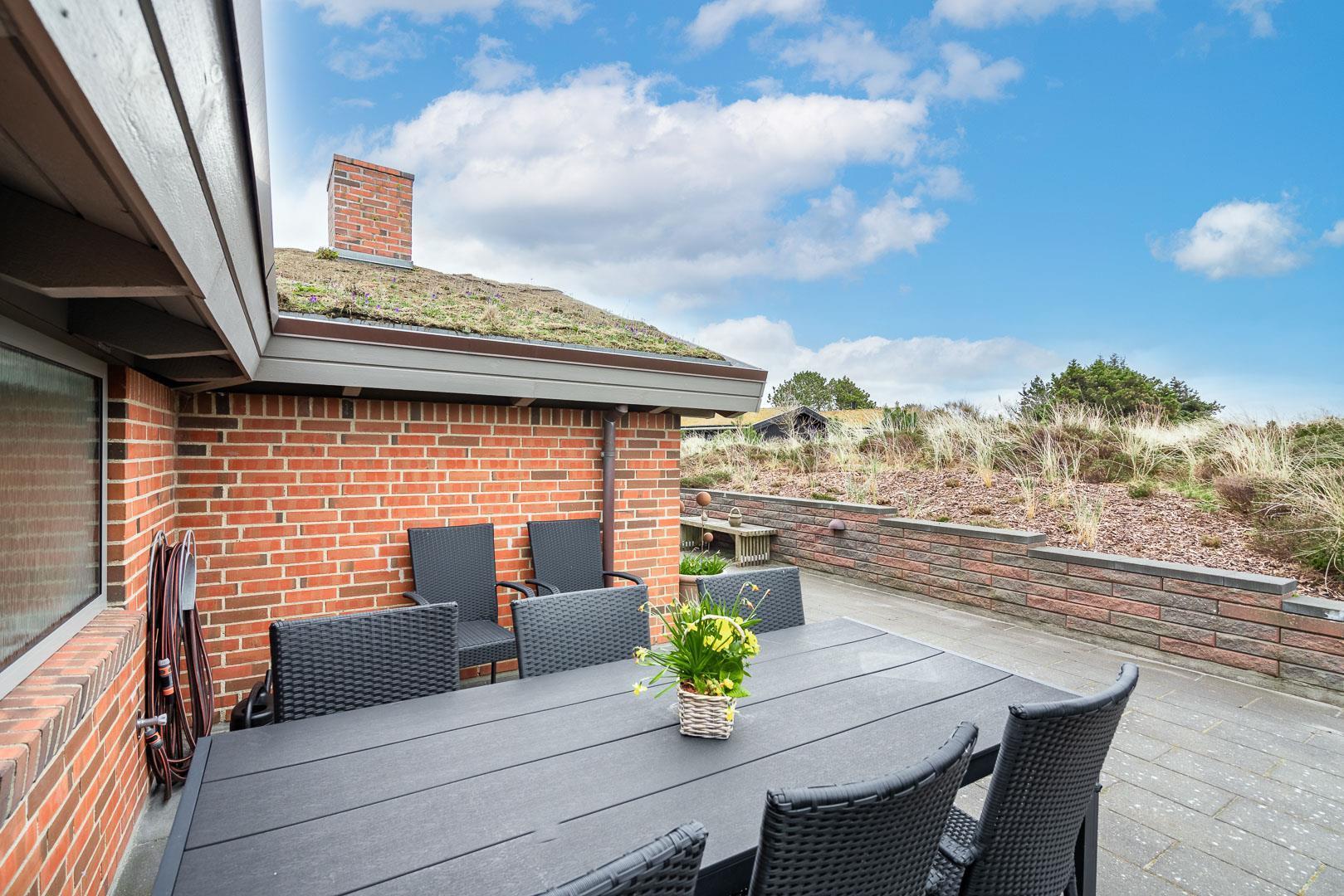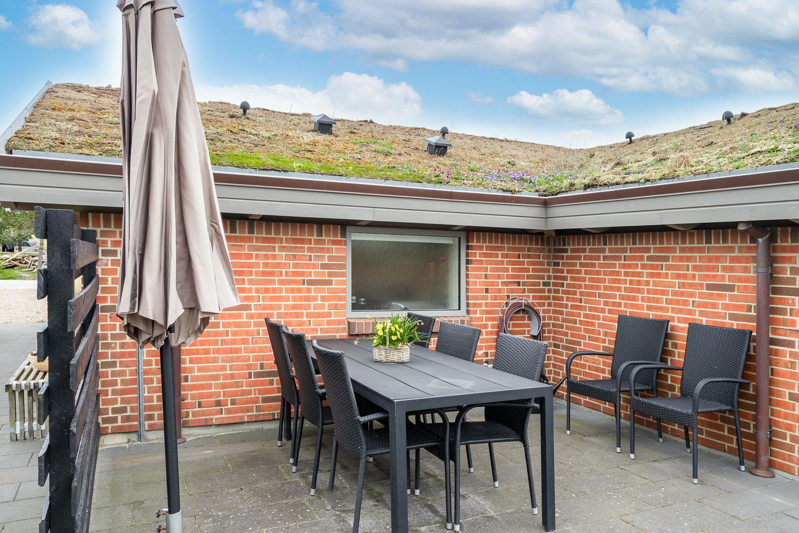 På den store terrasse finder du havemøbler, liggestole, parasol og grill, så du kan nyde sommerdage og lune aftener i det fri.