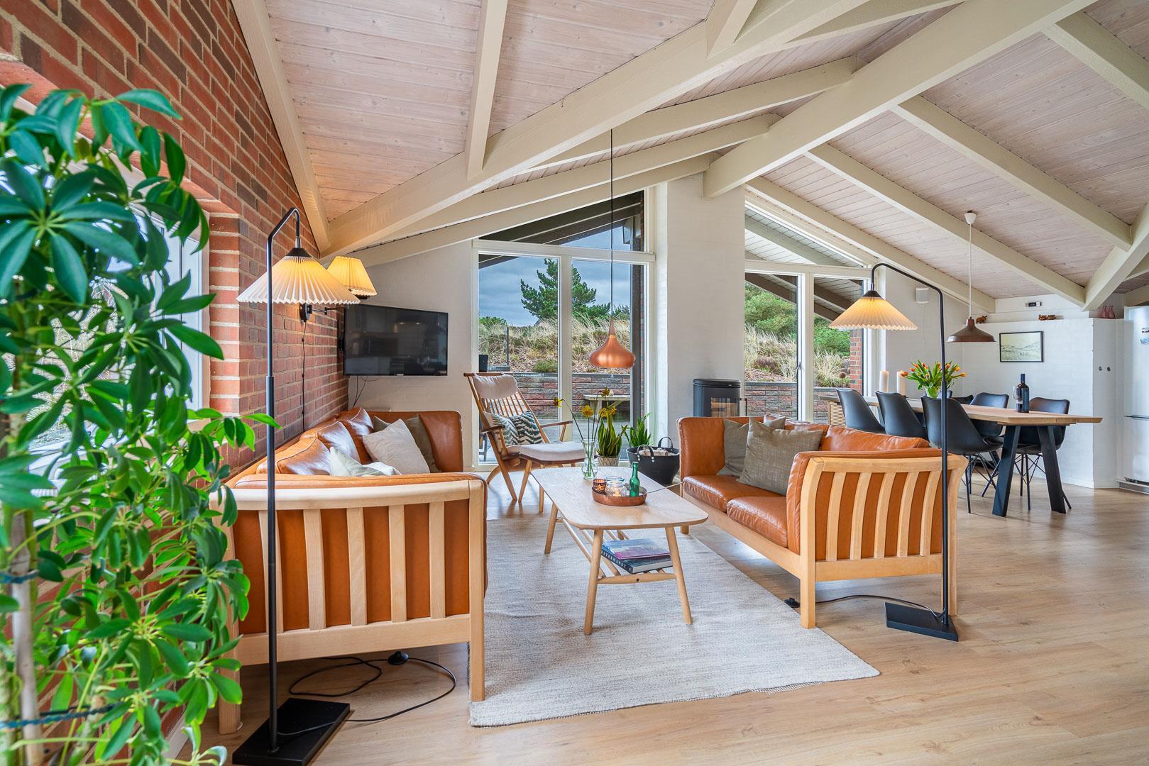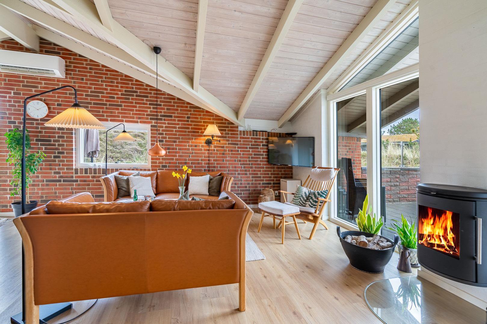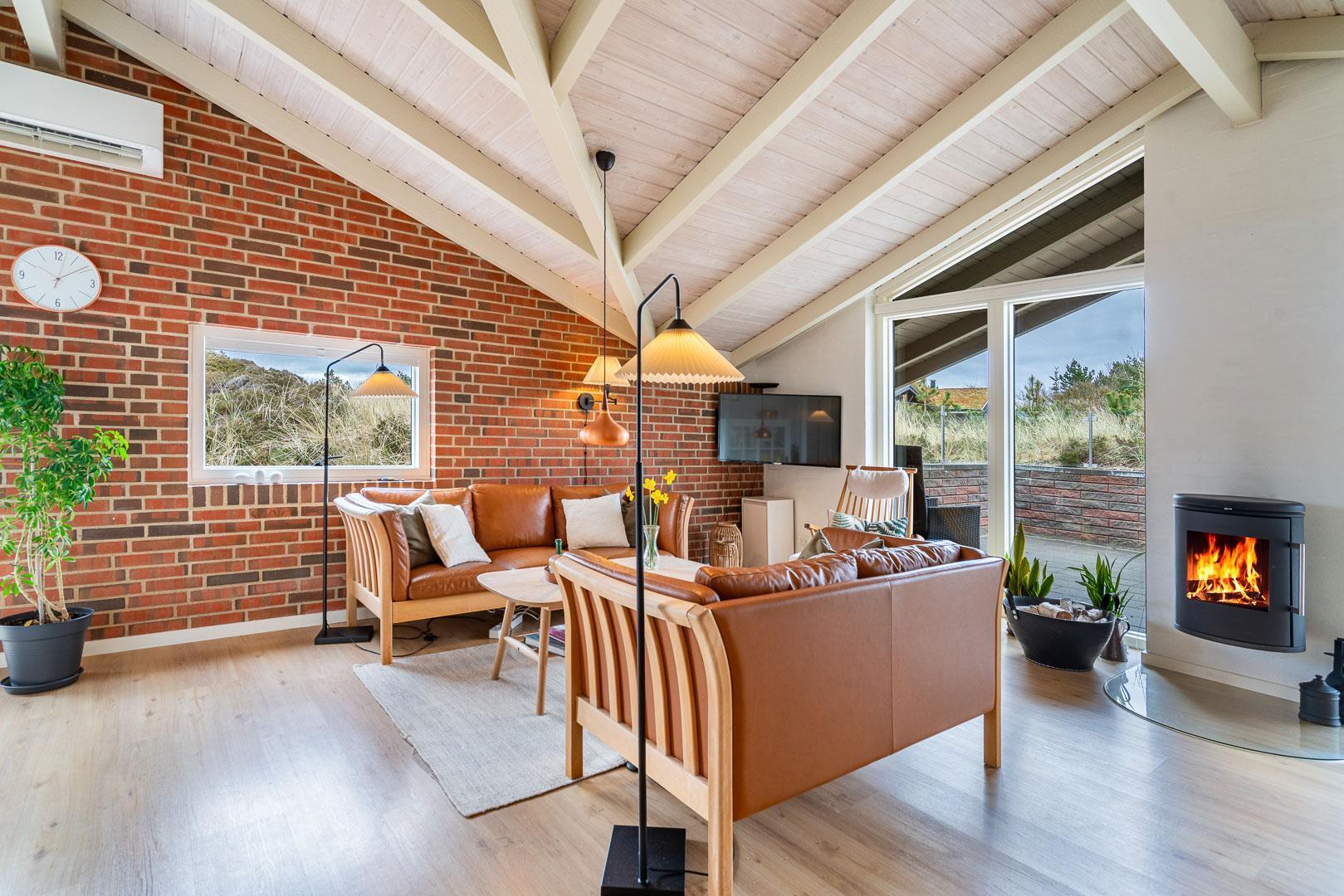 Indenfor mødes du af lyse lofter og gulve, et skønt lysindfald og en åben opholdsstue, hvor brændeovnen bidrager med varme og ægte feriehygge.