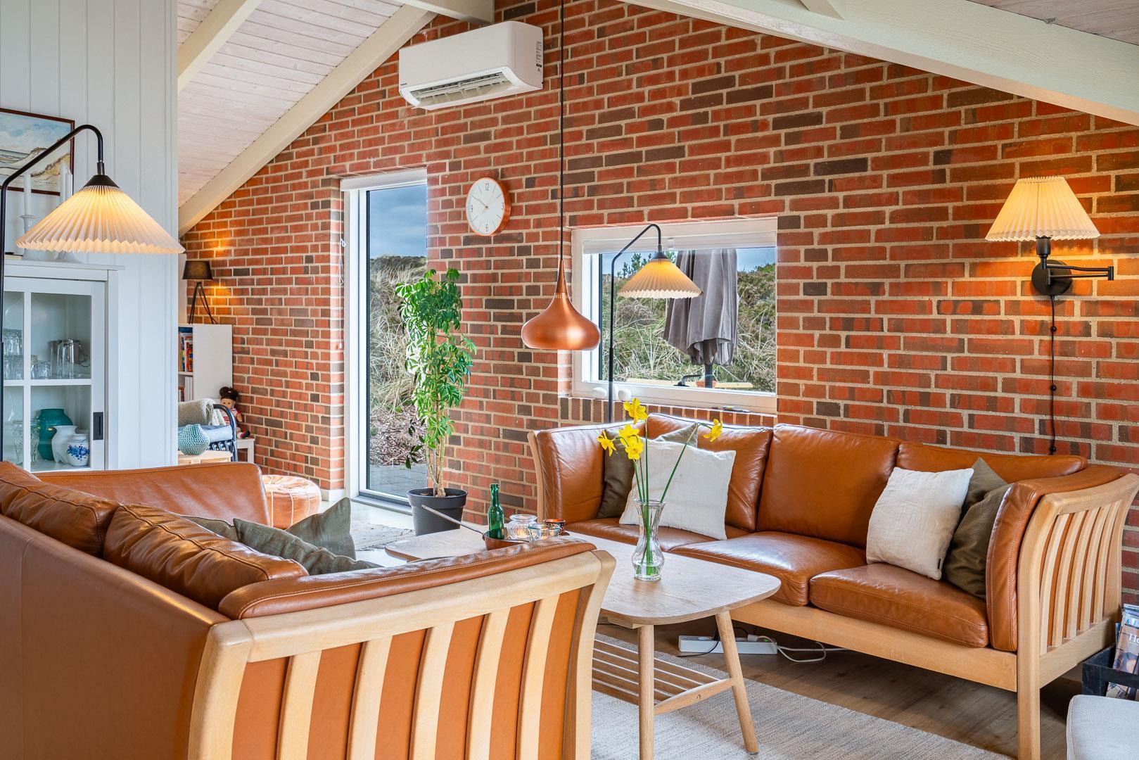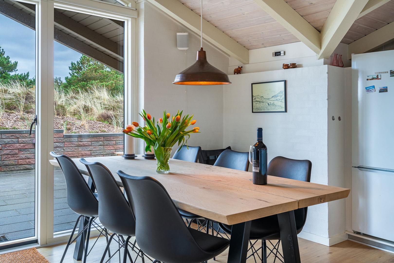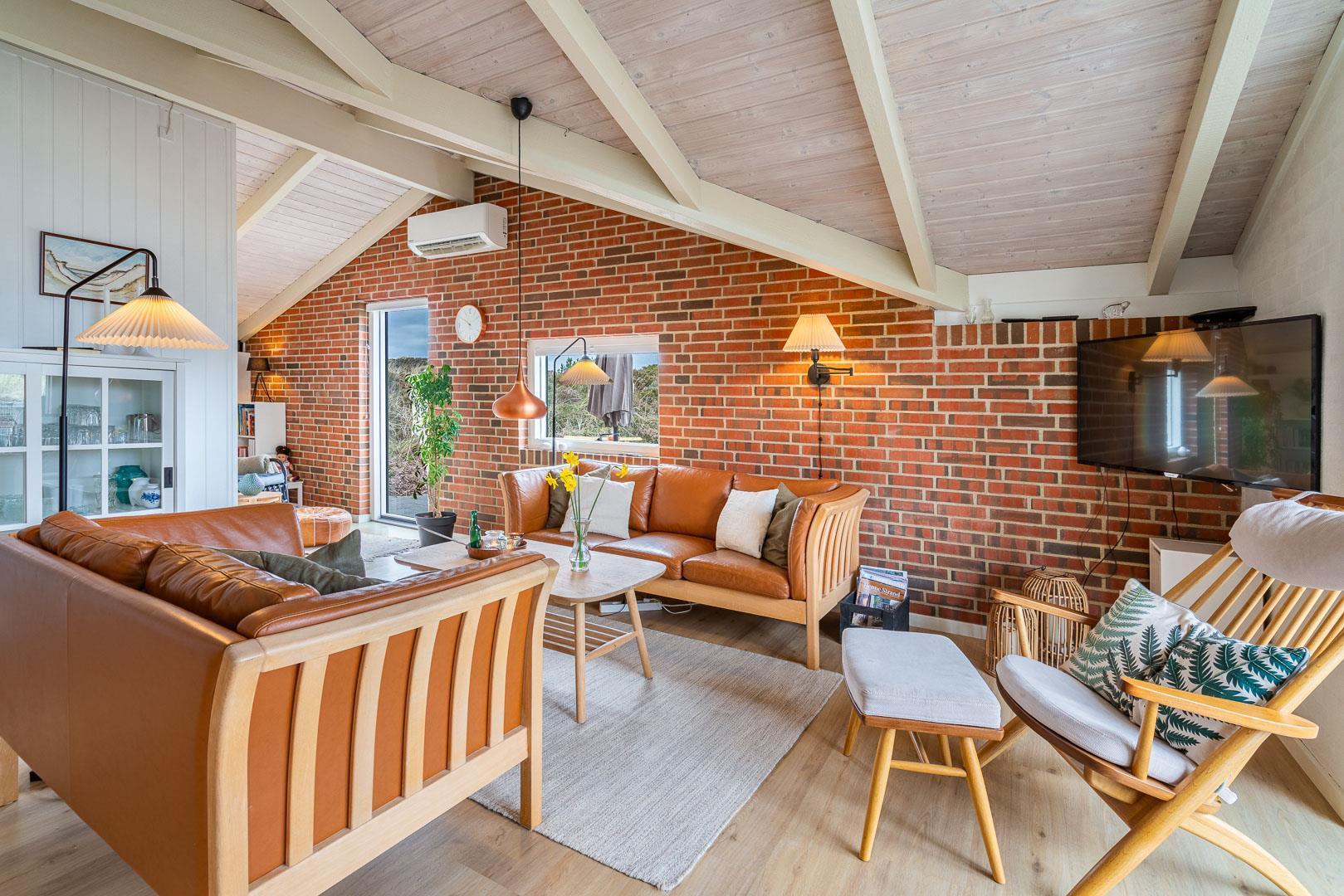 Indenfor mødes du af lyse lofter og gulve, et skønt lysindfald og en åben opholdsstue, hvor brændeovnen bidrager med varme og ægte feriehygge.