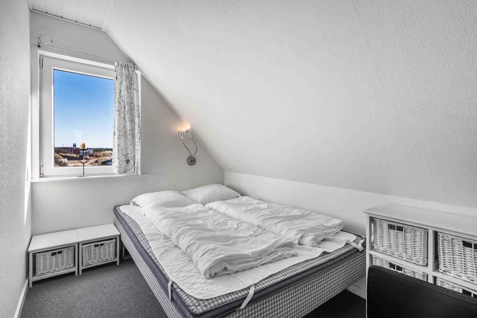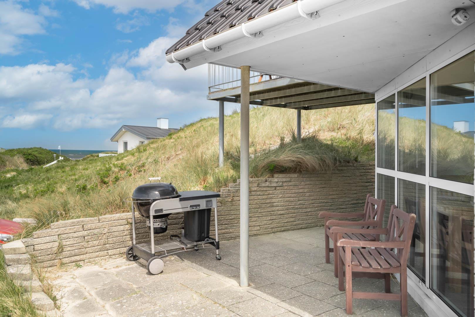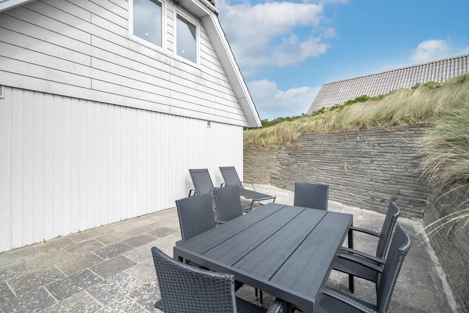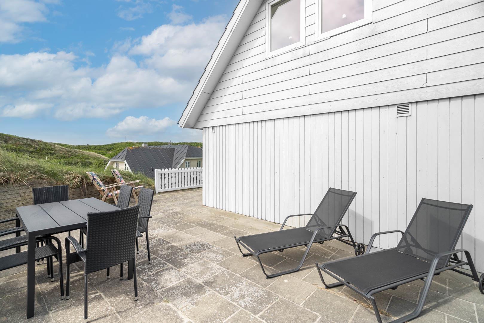Huset har i alt tre soveværelser, som alle er udstyret med dobbeltsenge. Huset ligger på en rolig klitgrund med en stor delvist overdækket terrasse.