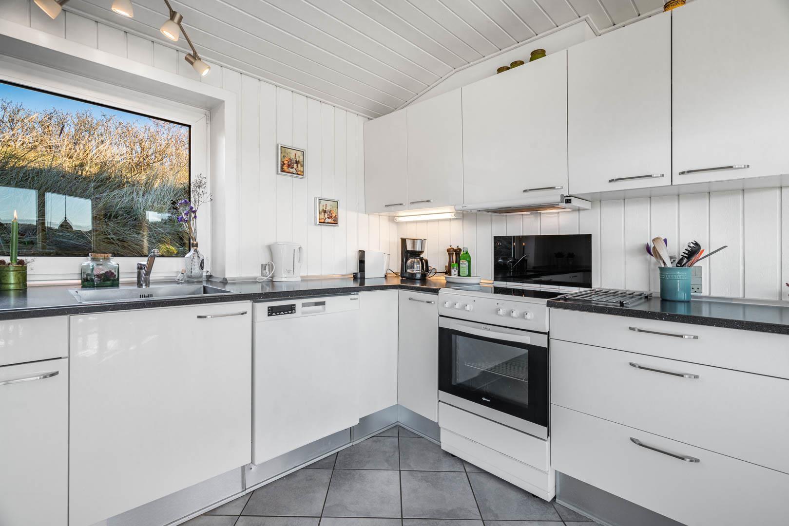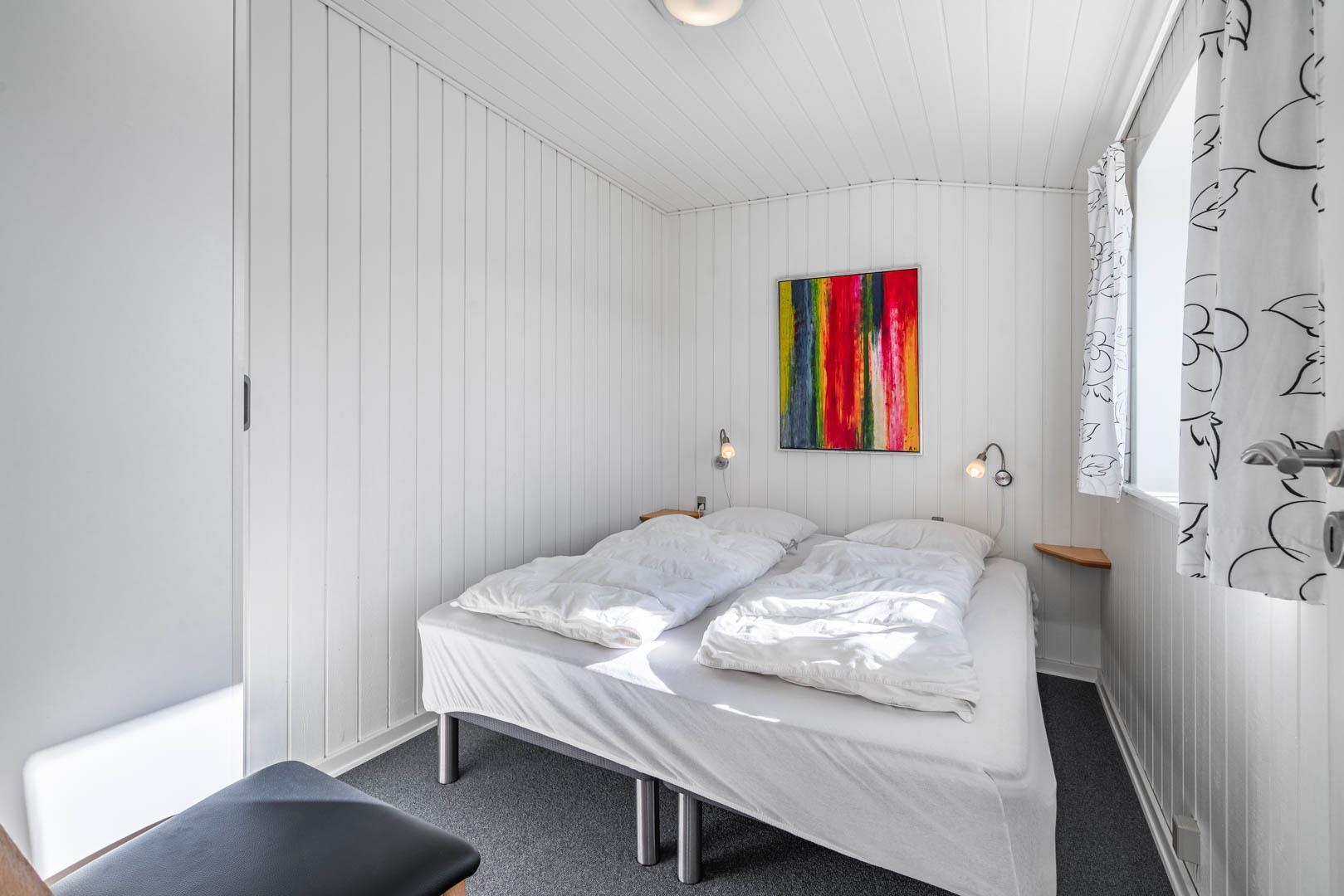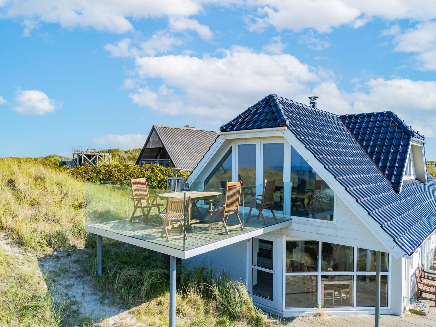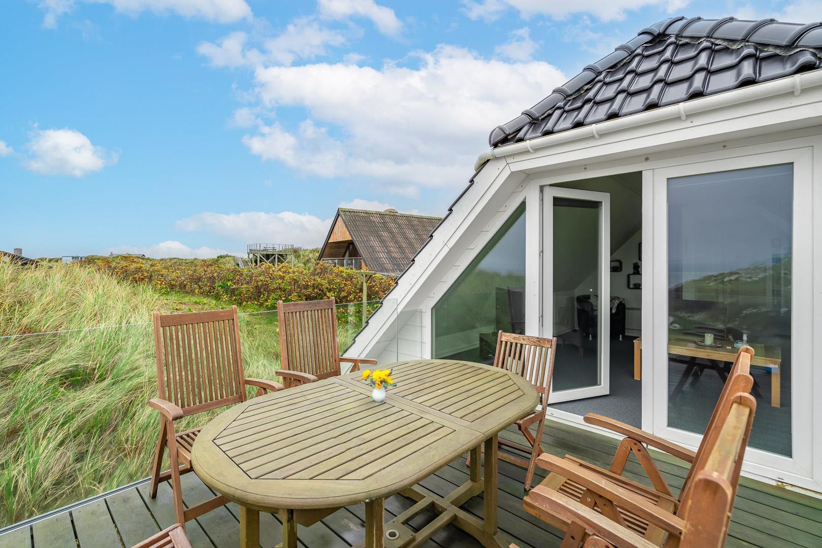 Huset har i alt tre soveværelser, som alle er udstyret med dobbeltsenge. Huset ligger på en rolig klitgrund med en stor delvist overdækket terrasse.
