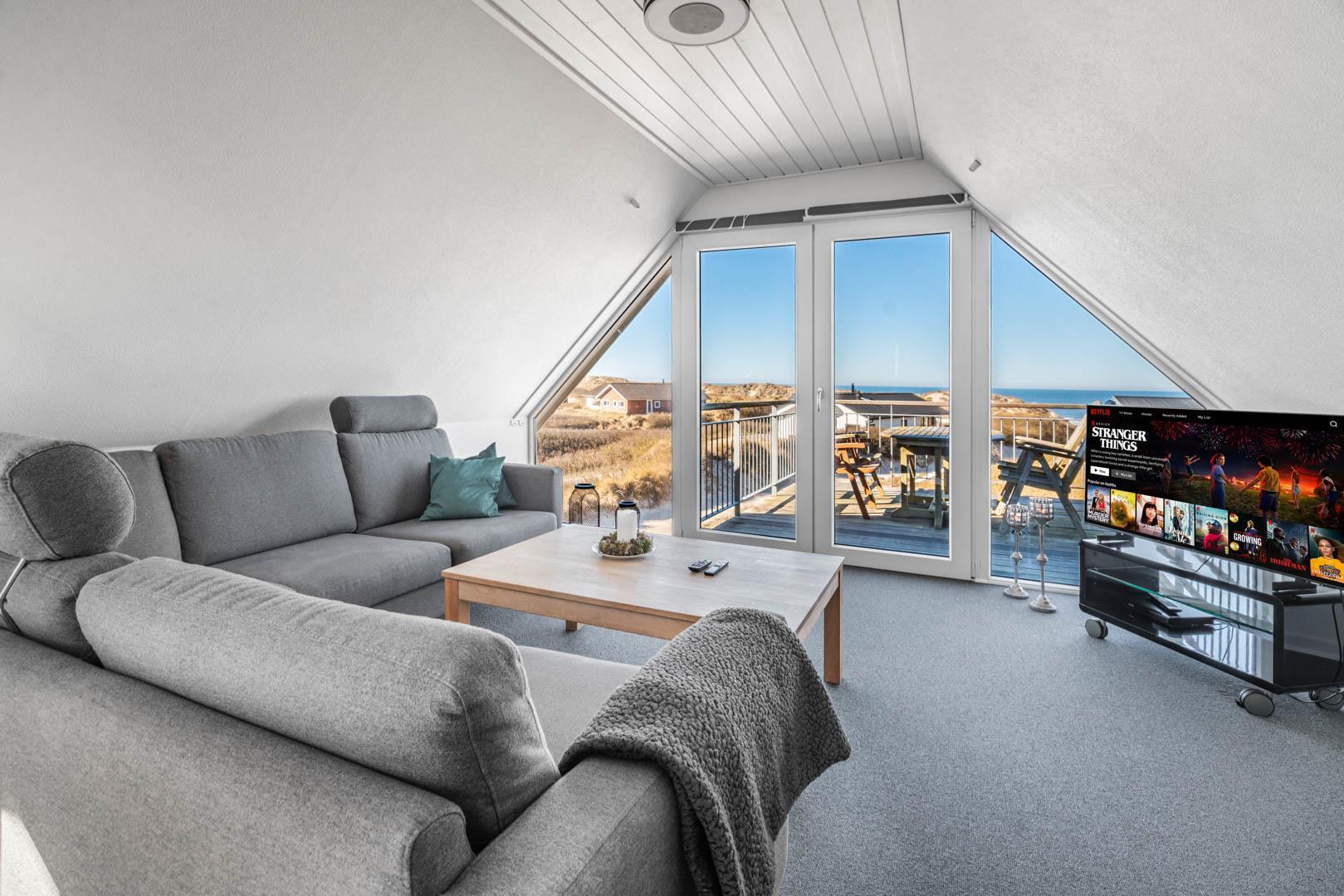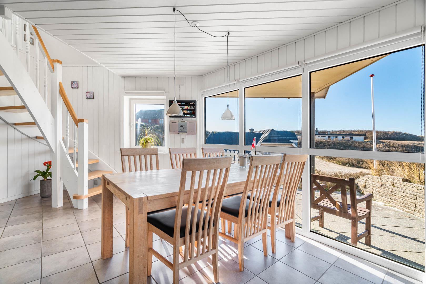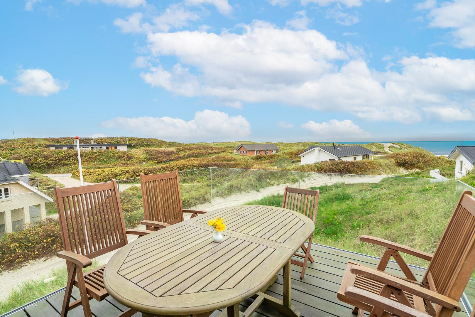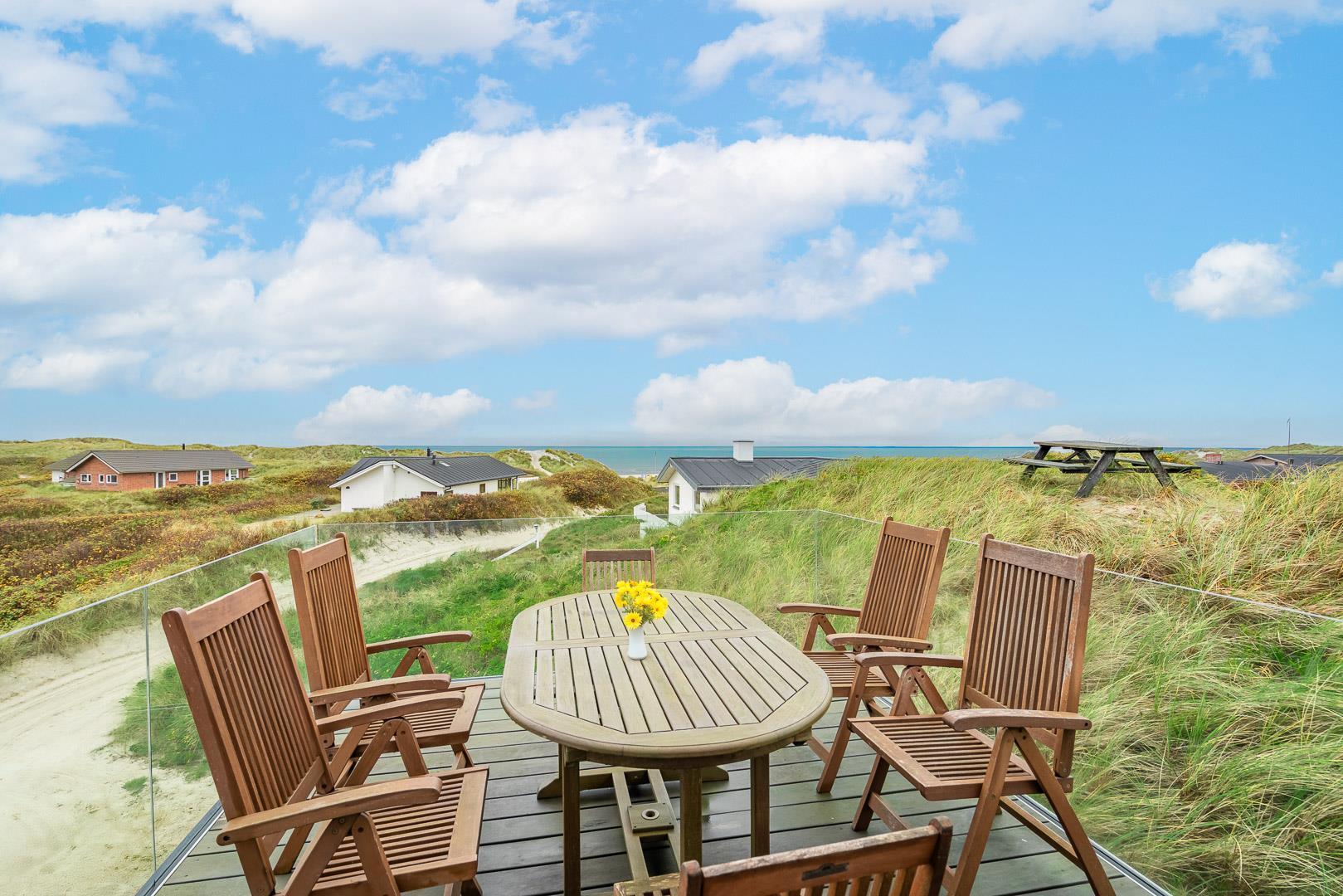 Nyd stilheden under stjernerne, mens I betragter solen, der synker ned i det aftenblanke Vesterhav. Sådan kan I tilbringe hver eneste ferieaften i dette feriehus ligger i tredje række til stranden, og hvis I på et tidspunkt får løsrevet dig fra den smukke udsigt, kan den sidste rest af hverdagsstress opløses i husets wellnessafdeling, som har både spa, dampbad og sauna.