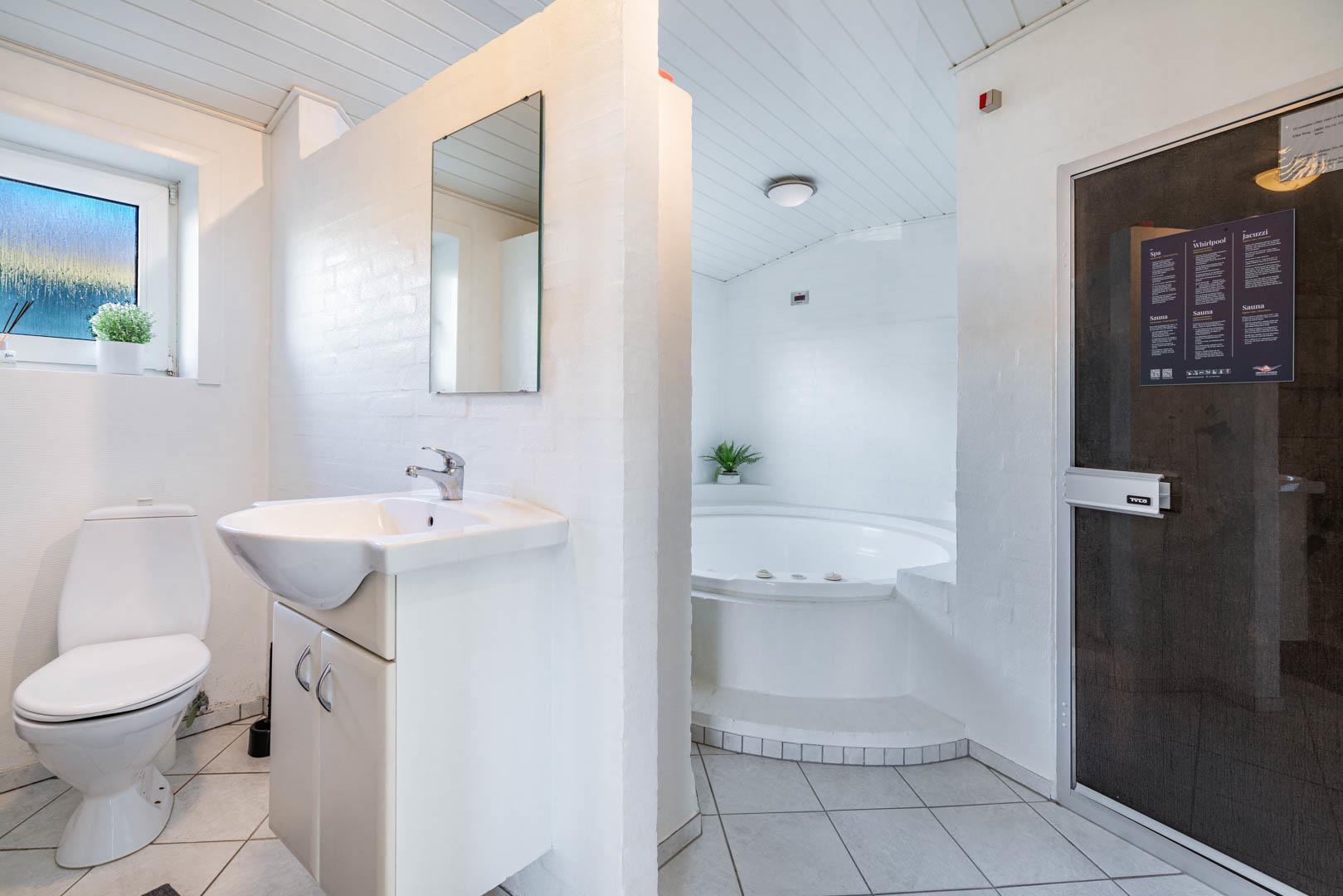 Madlavning, brætspil og hygge vil foregå i det skønne opholdsrum, som har lækkert køkken og en spisestue med en fabelagtig udsigt gennem kæmpestore glaspartier. Og når aftenen falder på, kan I nyde en kold drink i den store fempersoners spa eller med et dampbad inden sengetid. Foruden wellnessafdelingens bruseniche og toilet er der også et ekstra badeværelse på første sal.