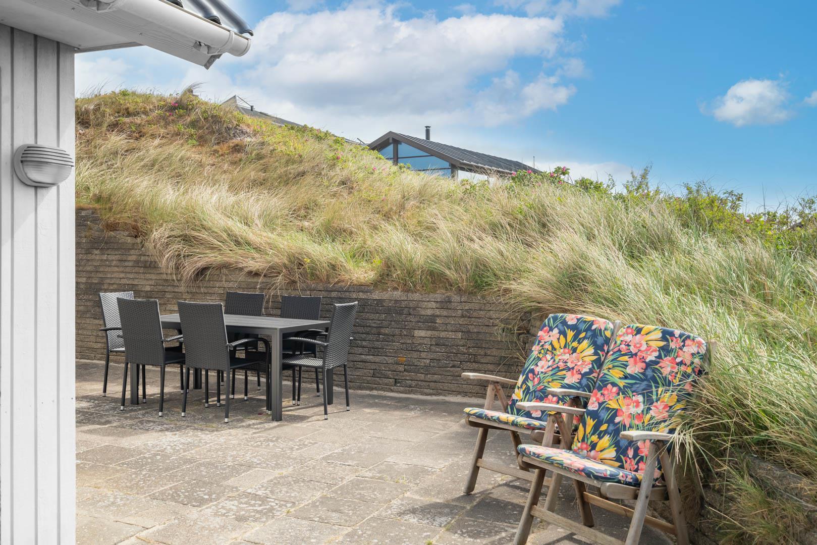 Det charmerende feriehus passer perfekt ind i de idylliske omgivelser. Det er nærmest bygget ind i en en klit, hvilket både skaber læ og gode udsigtspunkter på grunden.