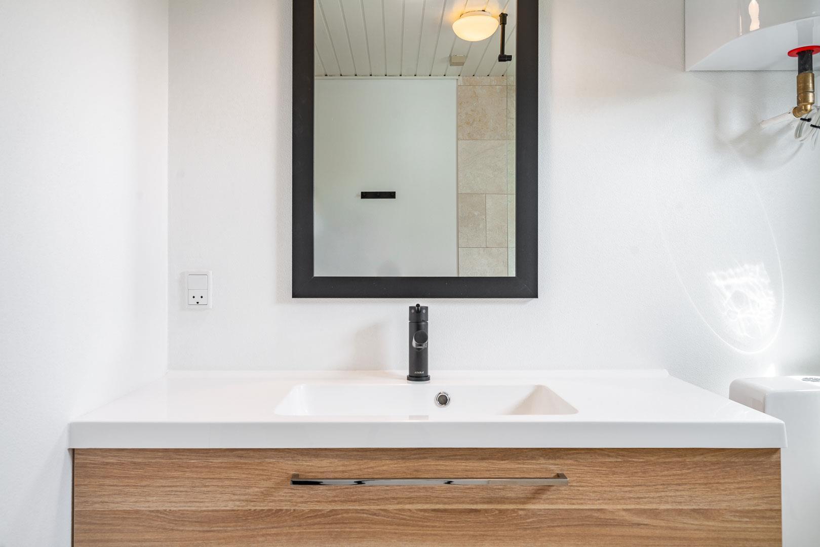 Det flotte badeværelse er med gulvvarme og moderne indretning – perfekt til både komfort og velvære.