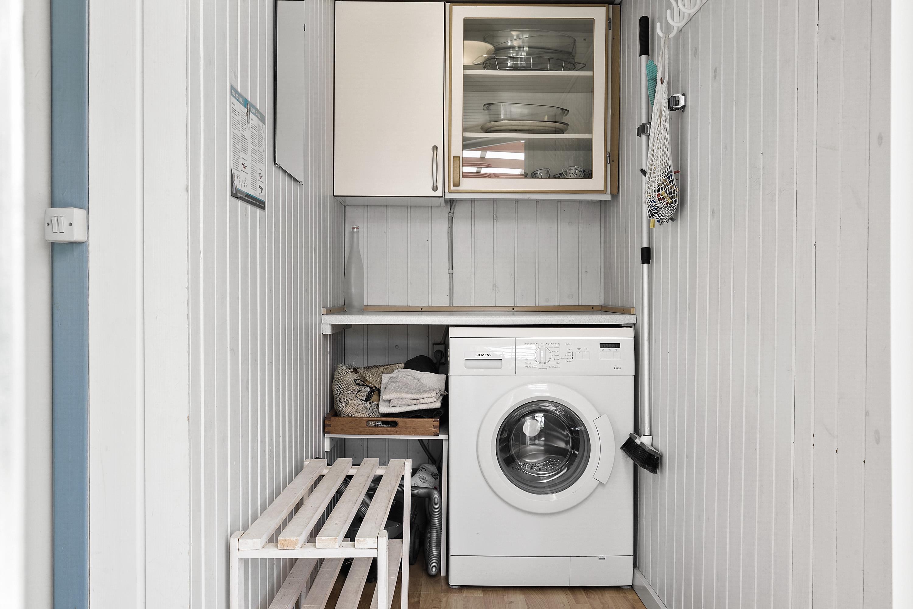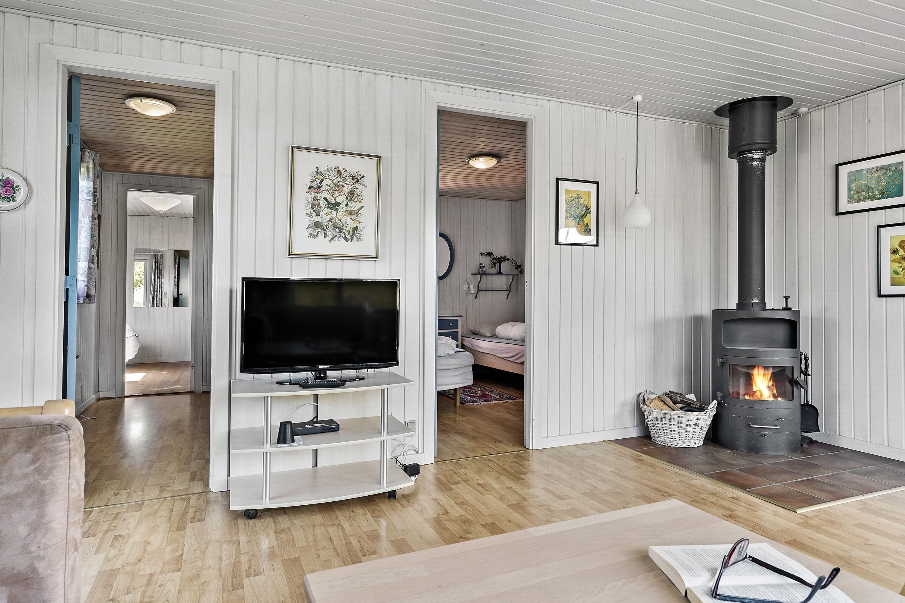 Sommerhuset har en funktionel indretning, hvor du fra entréen træder direkte ind i det lyse køkken, som smelter sammen med stuen og opholdsrummet. Selvom der ikke er loft til kip, er her en indbydende og venlig atmosfære. I stuen sørger brændeovnen for ekstra hygge på kølige aftener og vinterdage.
