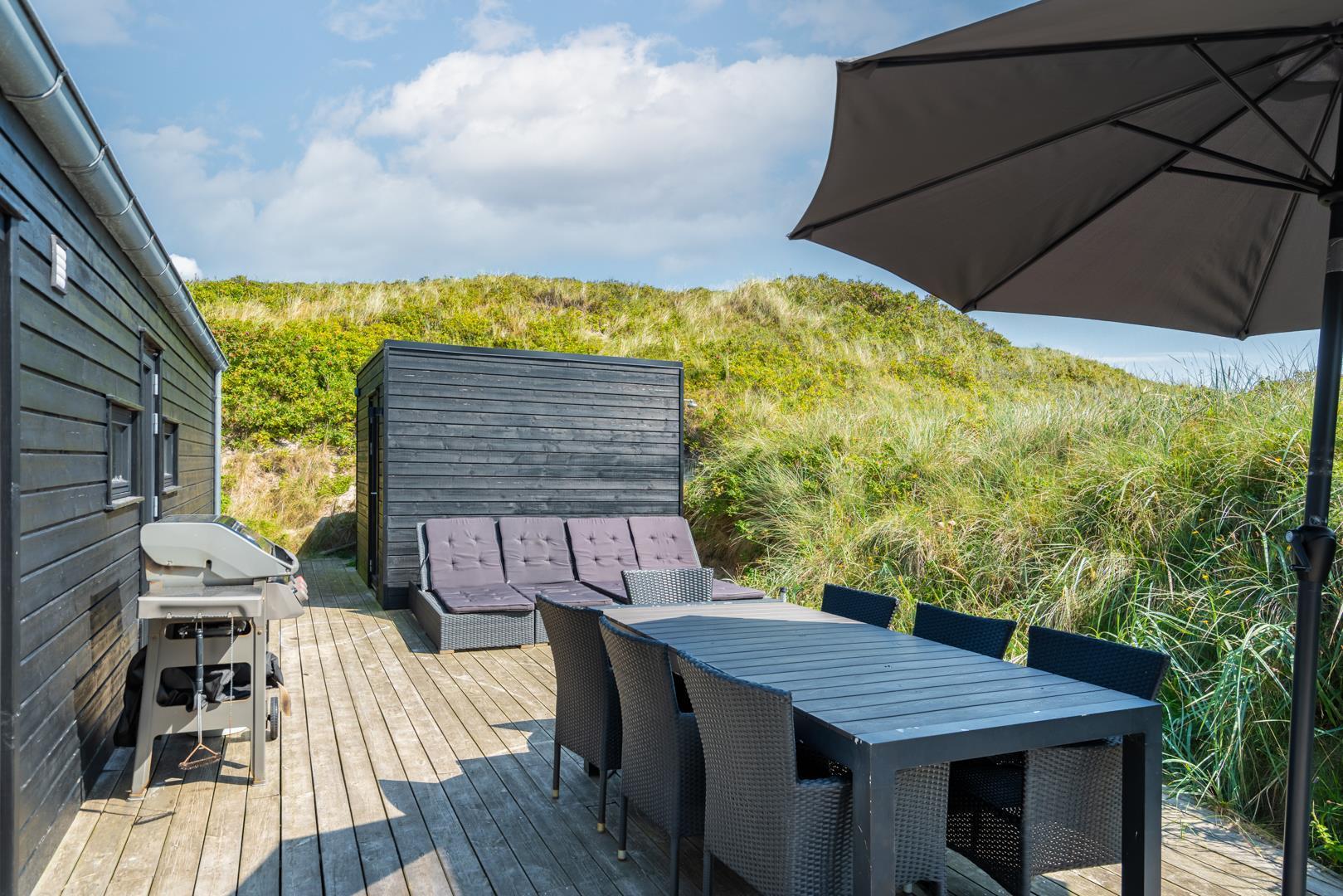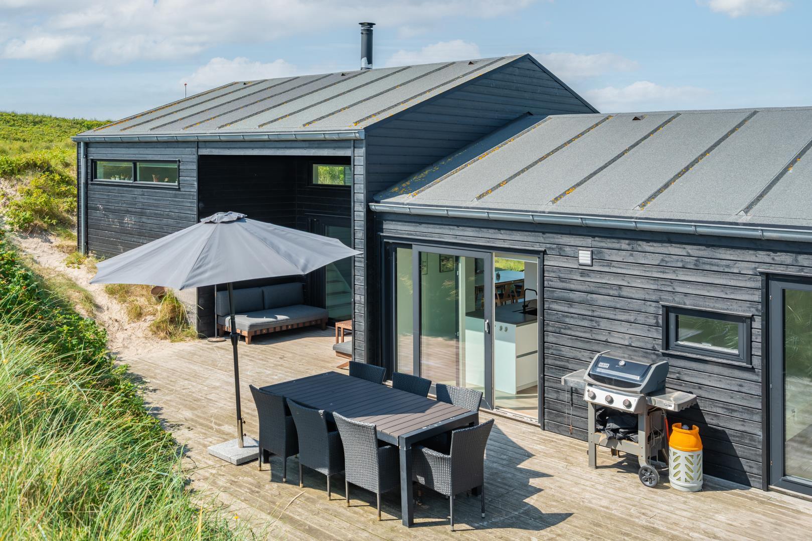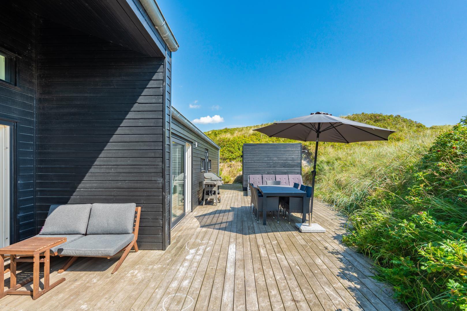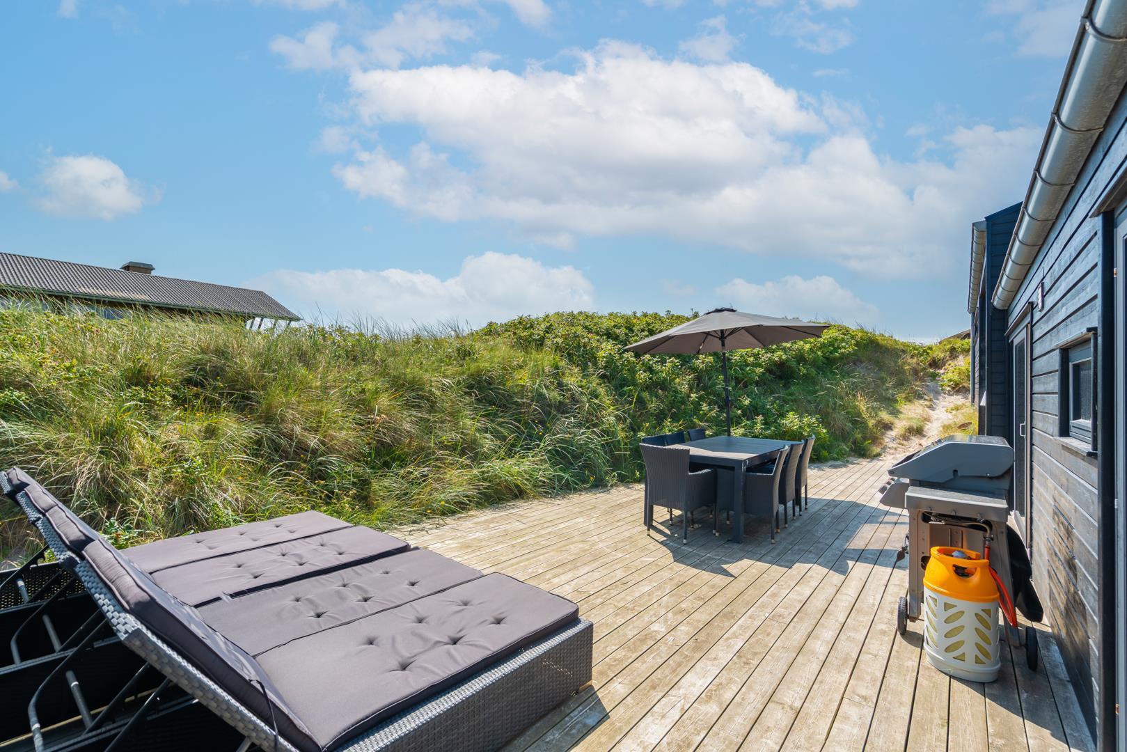 Grunden er en smuk, kuperet klitgrund, og der er gjort meget for, at I kan nyde de naturskønne omgivelser. Således danner et stort terrassedæk om huset masser af hyggekroge, hvor feriedagene kan udspille sig i liggestolene eller ved havebordet under overdækningen.