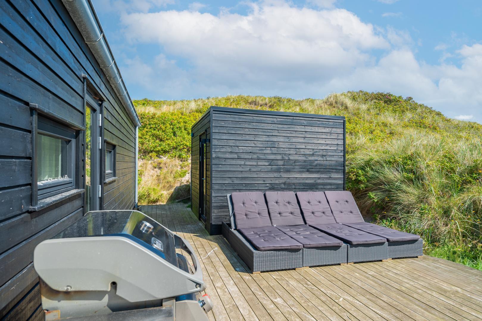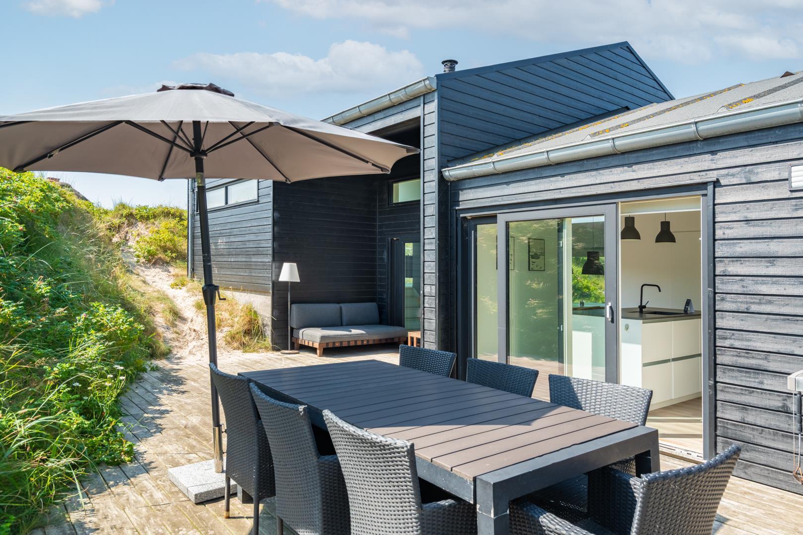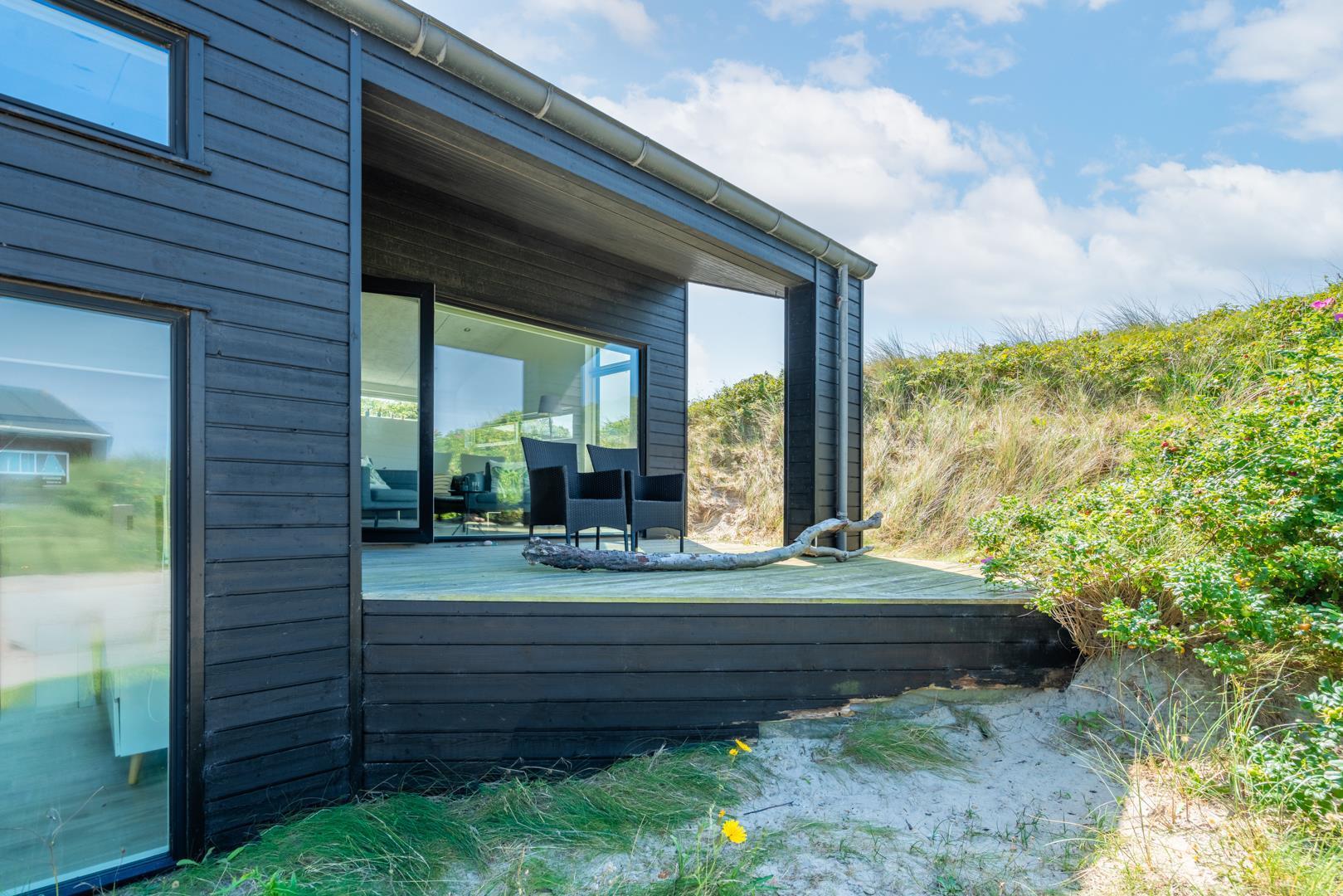 Grunden er en smuk, kuperet klitgrund, og der er gjort meget for, at I kan nyde de naturskønne omgivelser. Således danner et stort terrassedæk om huset masser af hyggekroge, hvor feriedagene kan udspille sig i liggestolene eller ved havebordet under overdækningen.