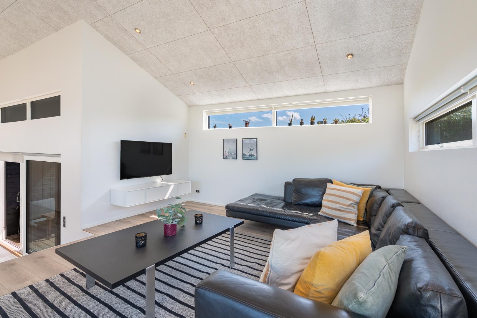 Indefra kan man ligeledes nye omgivelserne i særdeleshed gennem stuens store glasparti, som trækker farverne helt ind. Huset er opført i 2017, og man er ikke et sekund i tvivl om, at der er tale om et moderne hus, hvor komfort og æstetik er prioriteret. Højloftede, lyddæmpede rum i forskudte plan med flotte møbler og interiør bidrager til den venlige og indbydende atmosfære.