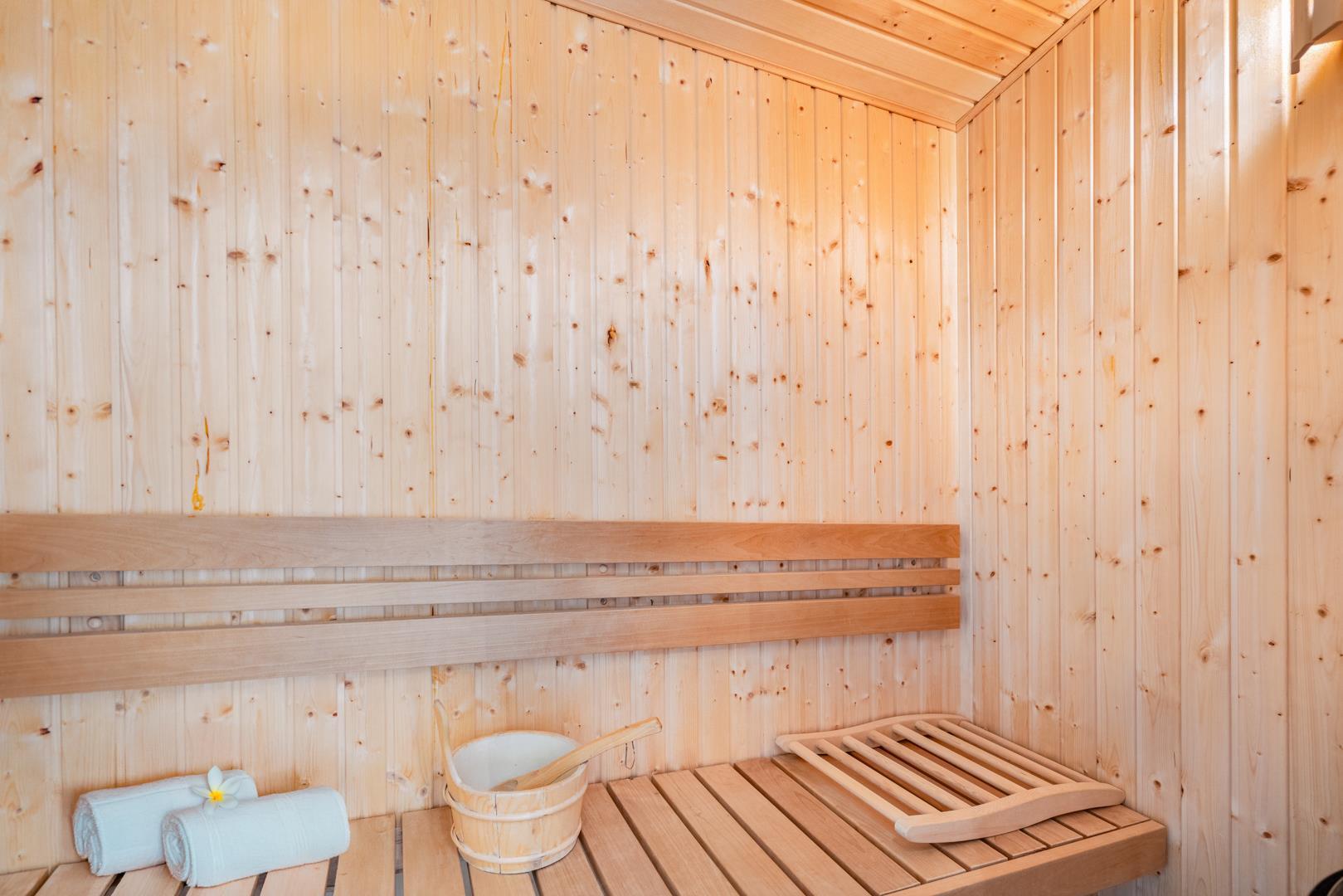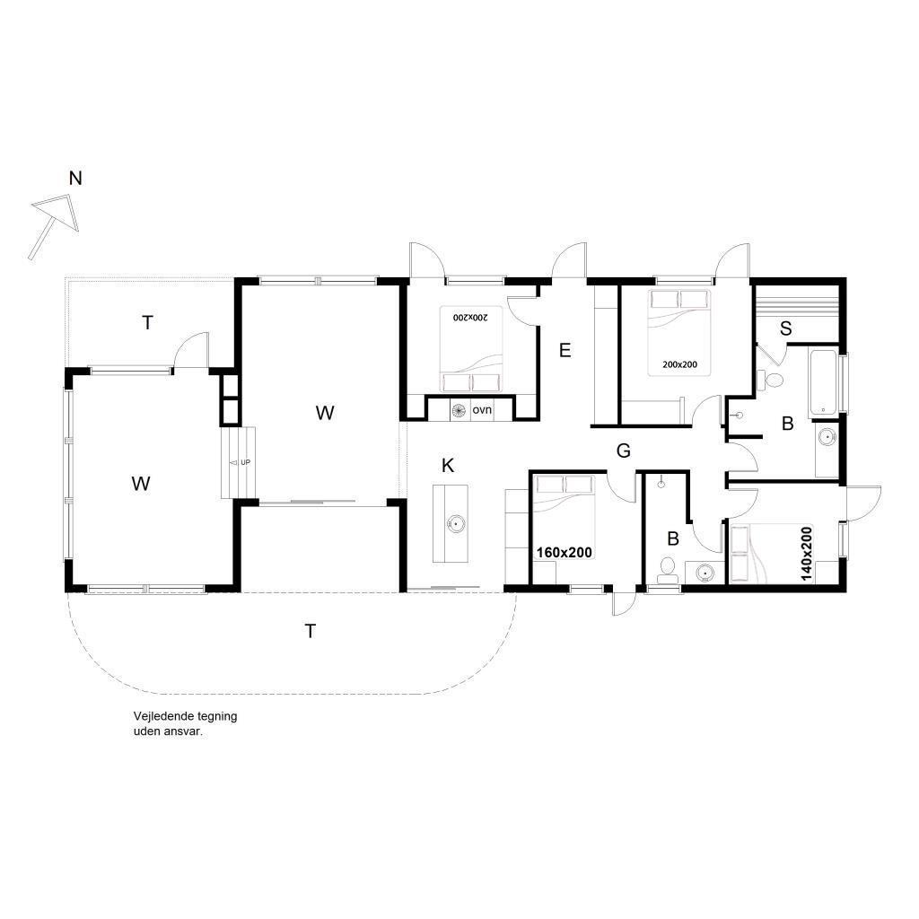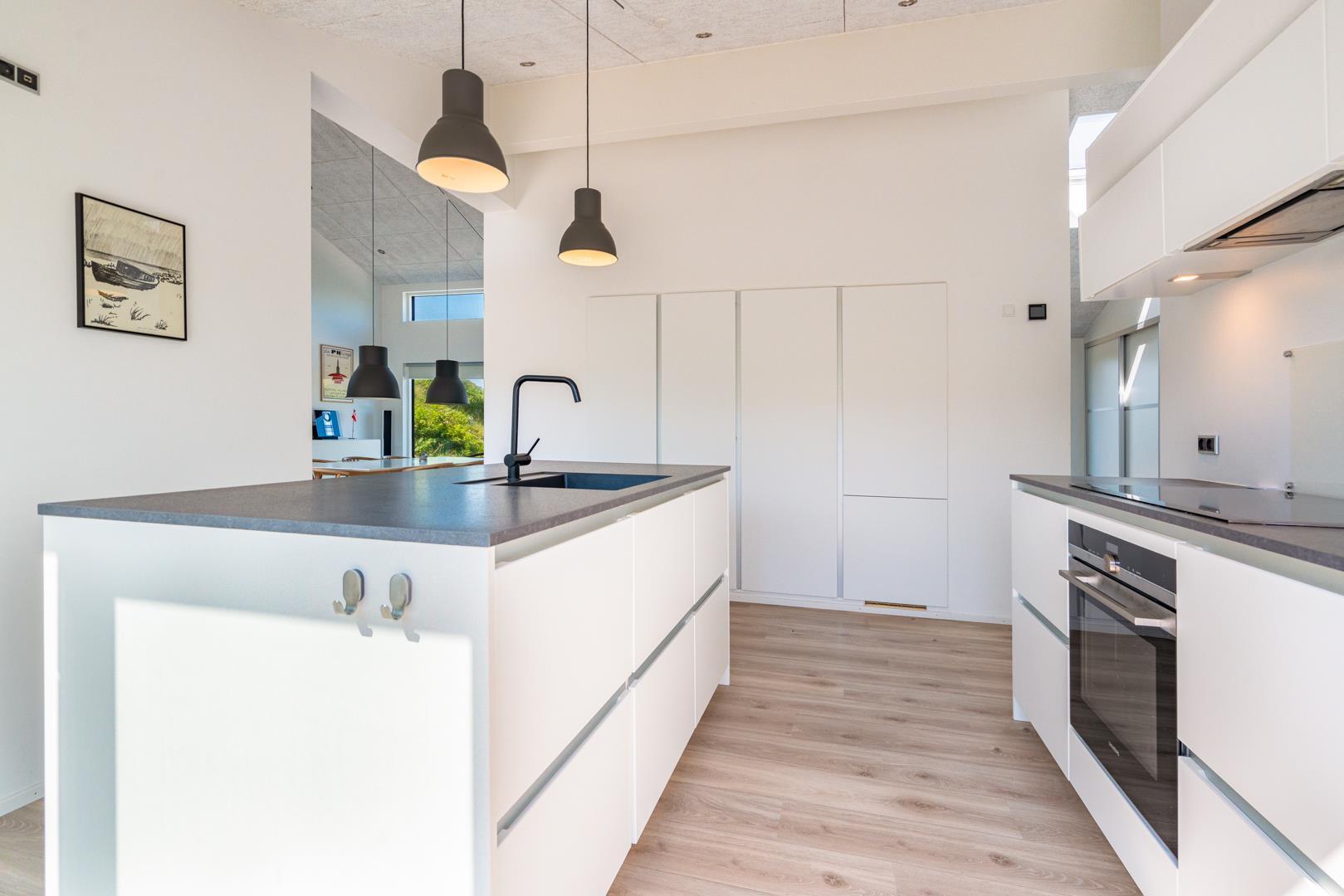 Stuen ligger i det øverste niveau, og herfra er der blot fem trin ned til køkken-alrummet, som har en stor spiseplads med brændeovn og skydedør ud til terrassen. Køkkenet er minimalistisk indrettet, og også herfra er der direkte udgang via en skydedør. Huset byder herudover på fire soverum med dobbeltsenge samt to badeværelser. Begge badeværelser har varme i gulvet, og det ene sætter trumf på med badekar og sauna.