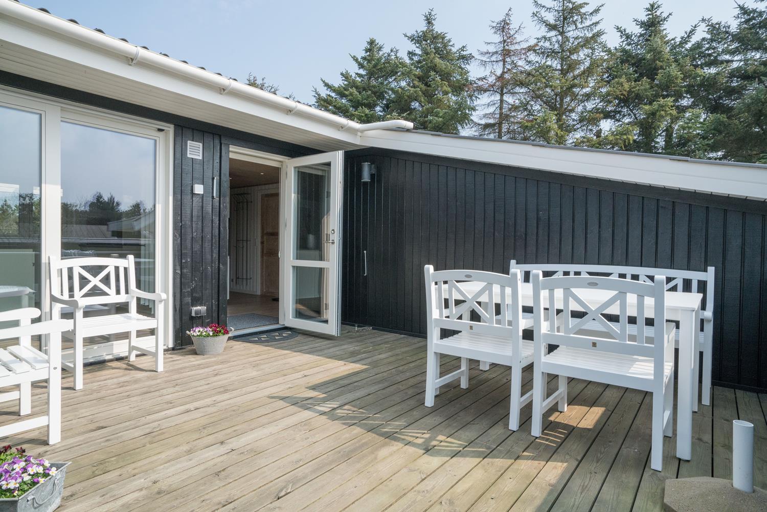 Få minutters gang fra Henne Strands centrum men i helt roligt område ligger dette skønne og renoverede feriehus. Huset er højtliggende for enden af en blind vej. Fra de pragtfulde, helt ugenerede og læfulde træterrasser kan solen og roen nydes i fulde drag. Huset har nyere køkken og badeværelse. Ekstra toilet i forbindelse med det ene værelse. Der er trin ned til 2 af soverummene.(forskudt plan). Der er også en overdækket terrasse.