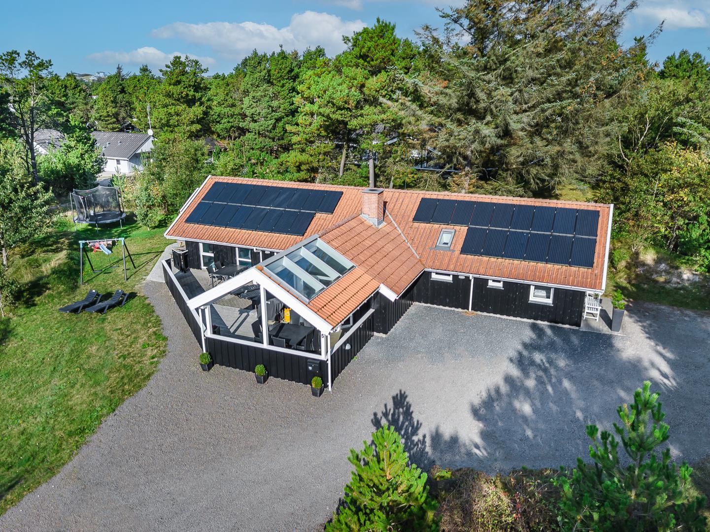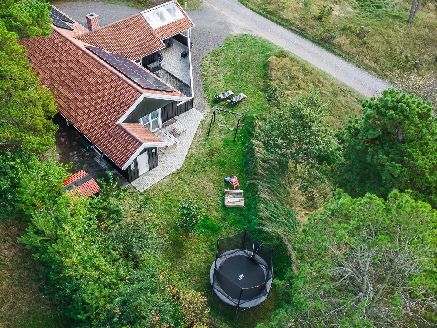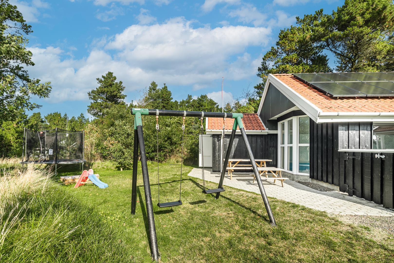 I det store swimmingpoolrum er den stor swimmingpool (4,0 x 6,0 m) Desuden er der en lille børnepool til de mindste, 6-pers. spa og direkte adgang til et af husets badeværelser, som er udstyret med bruser og sauna. Udenfor er der tænkt på husets små gæster, så her er der gynge og sandkasse.
