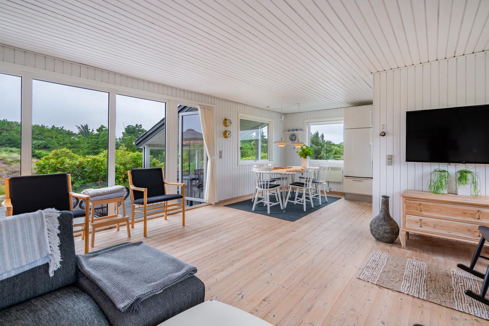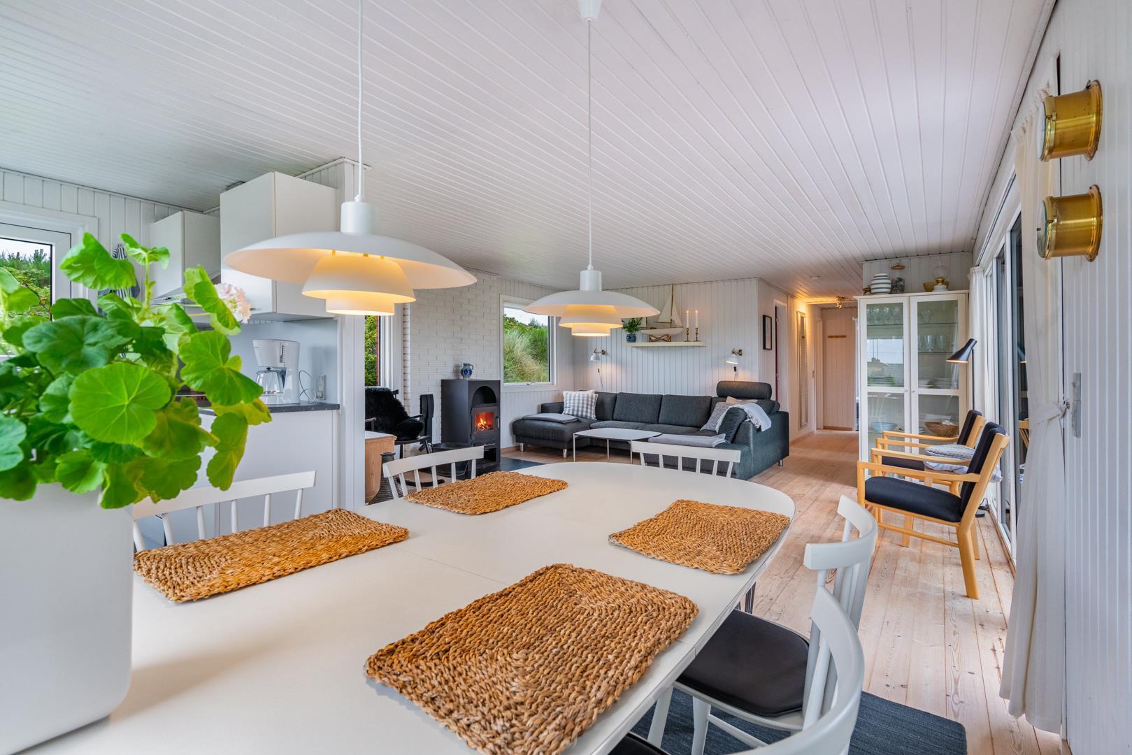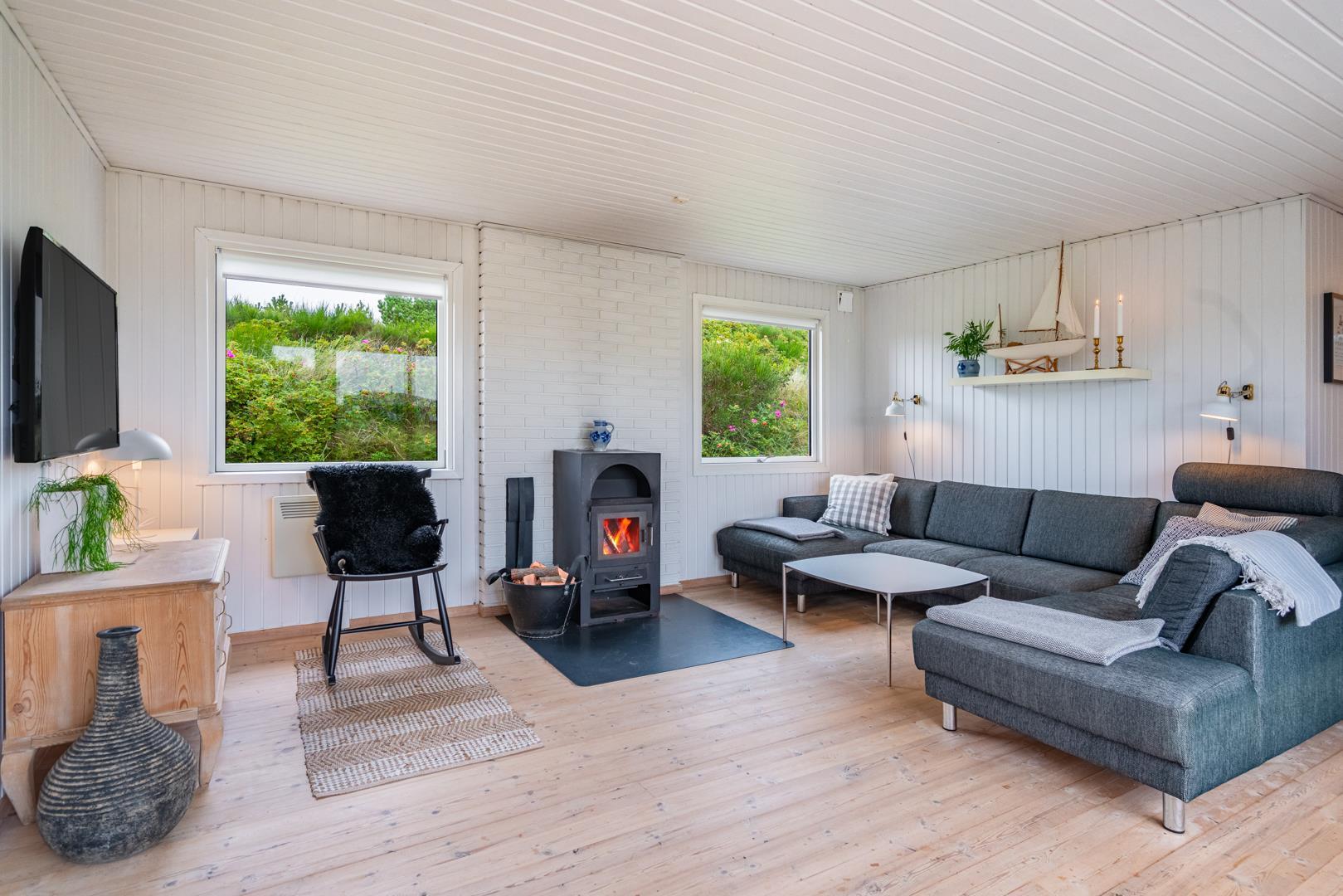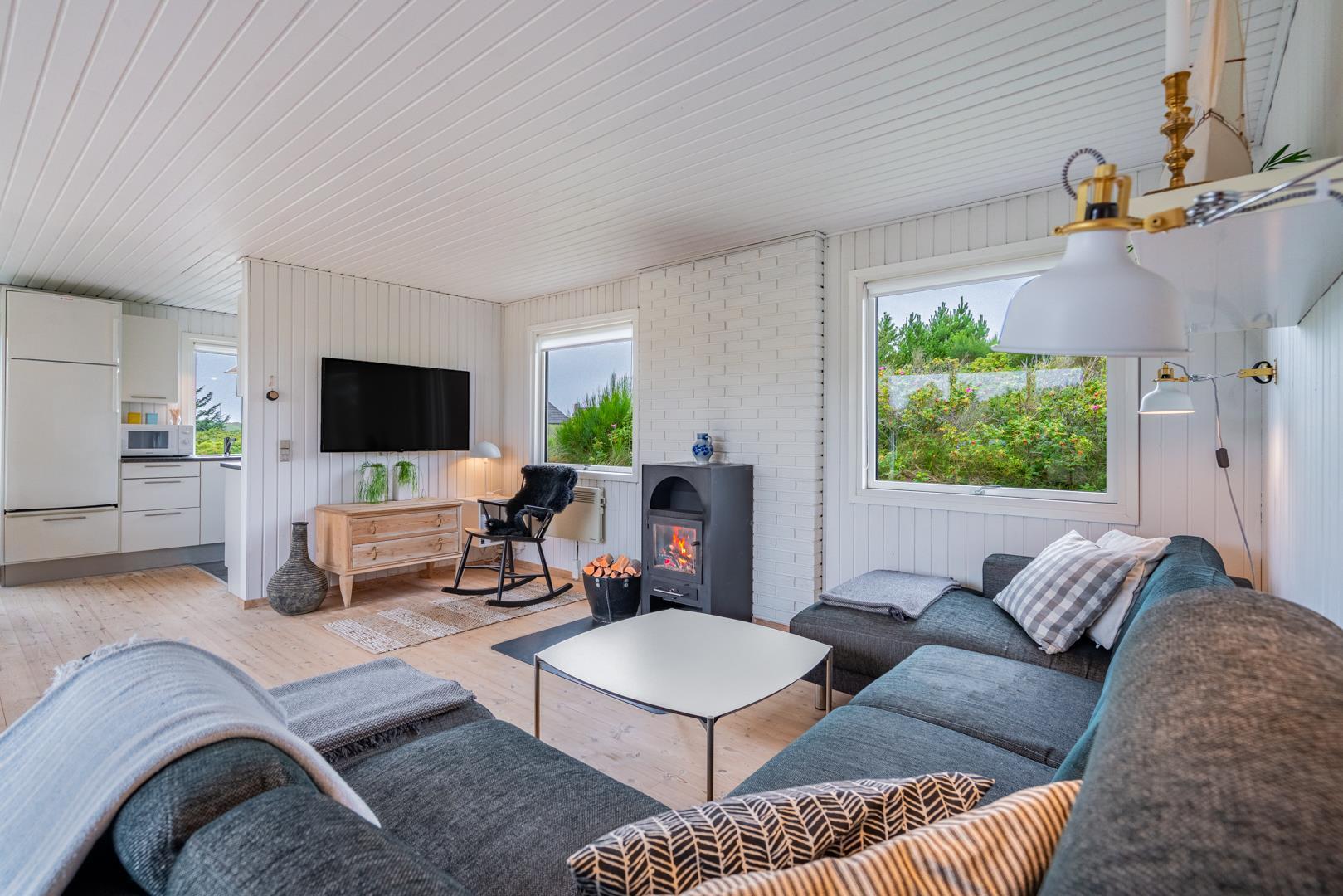 Oplev dette hyggelige og personligt indrettede sommerhus på en højtliggende klitgrund nær Vesterhavet.