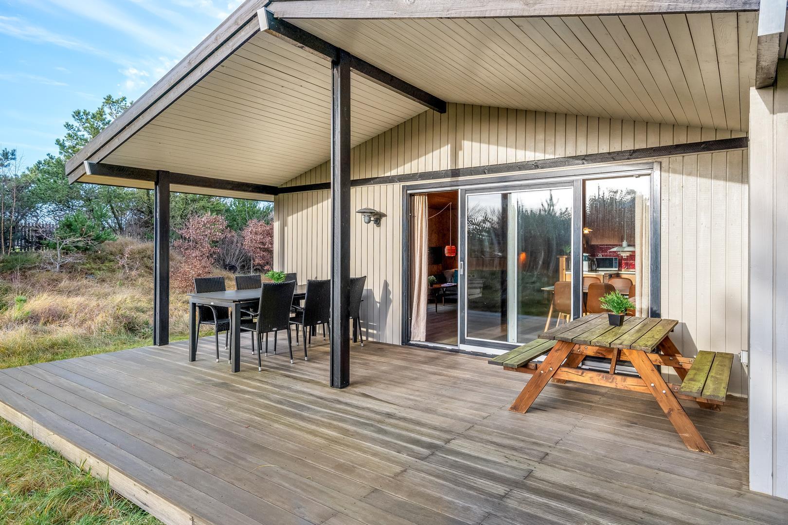 Hyggeligt træhus tæt på Henne Strand med flere terrasser og plads til børn i naturskønne omgivelser.