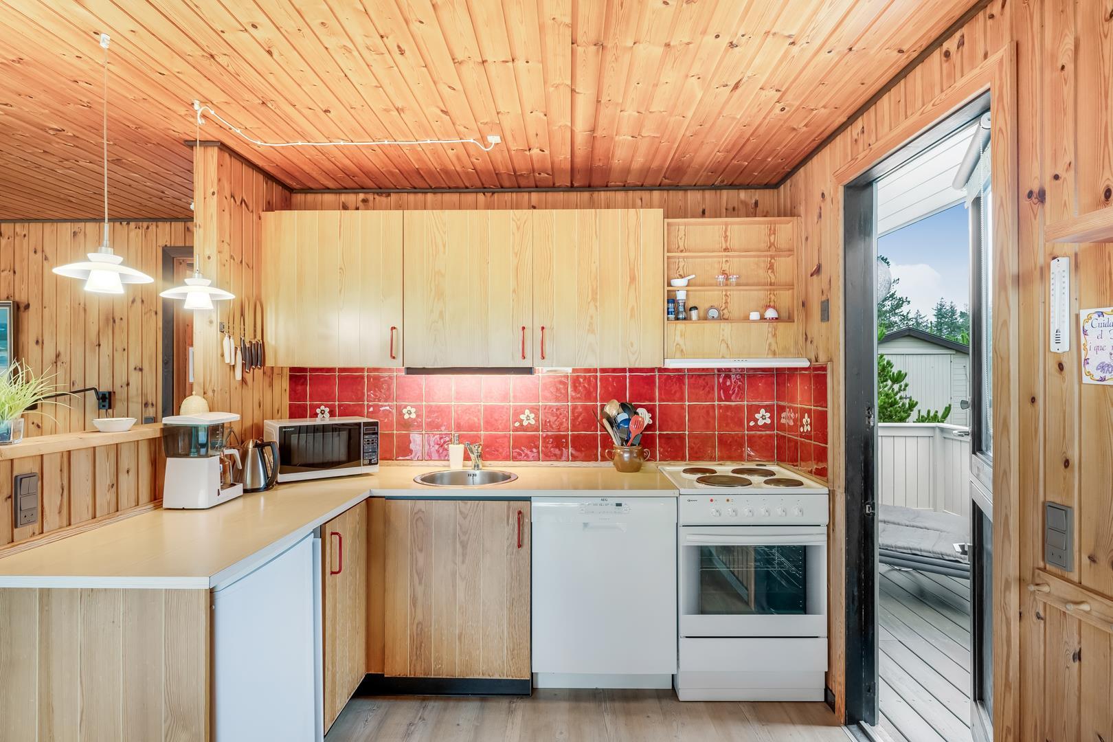 Hyggeligt og velholdt træhus på ugeneret, kuperet hedegrund. Omgivet af fyrretræer. Små hyggekroge med bord og bænk. Ideelt til børn med gemmesteder og plads til boldspil foran huset. Køkken og stue i et med udgang til overdækket syd- og vestvendt terrasse. Fra køkken udgang til østvendt terrasse, med mulighed for solskin hele formiddagen.