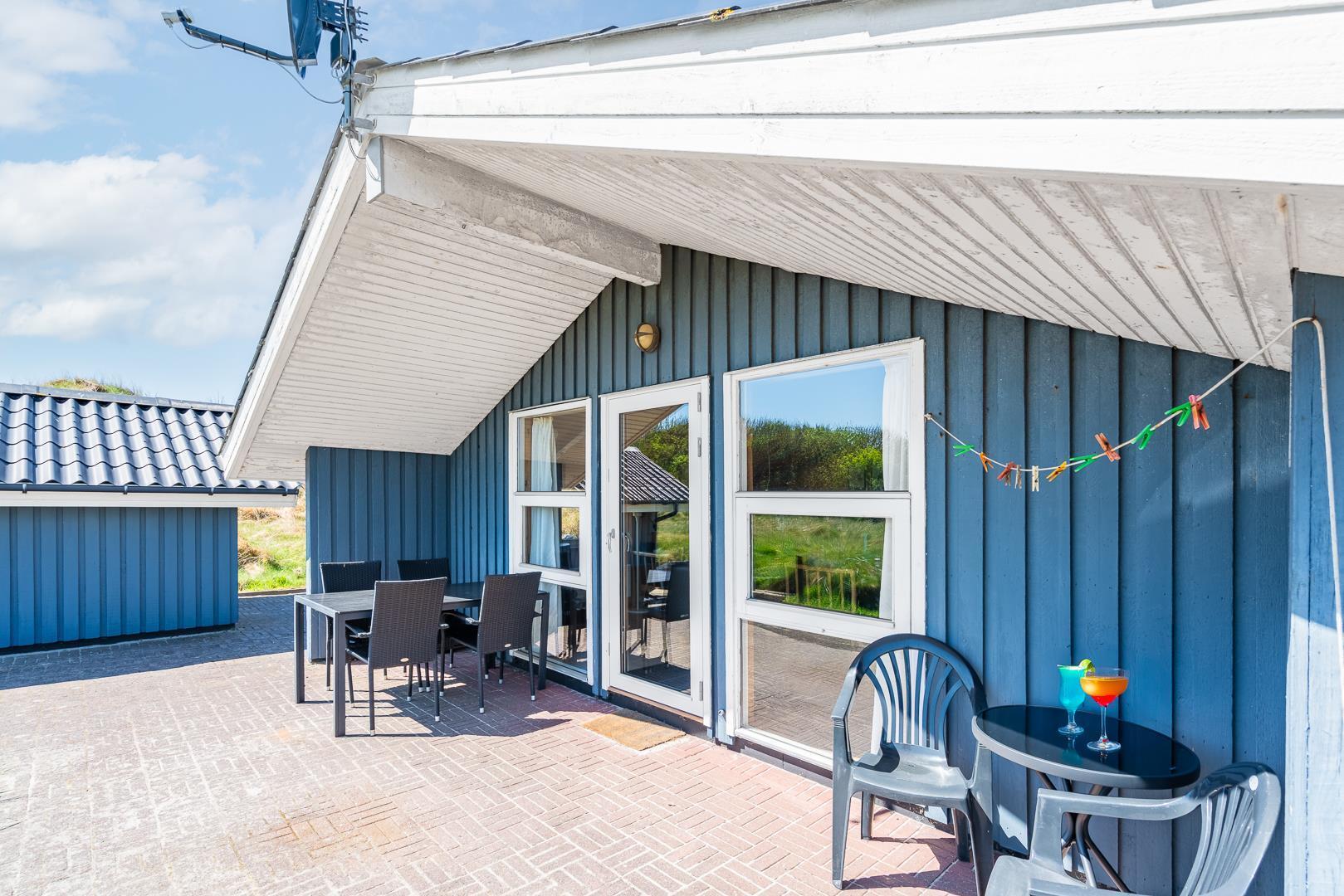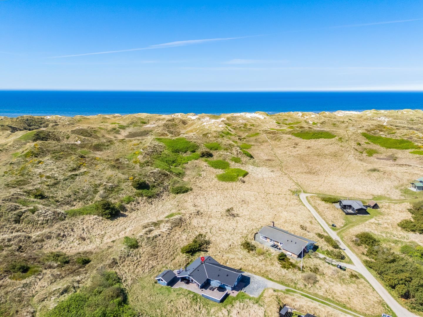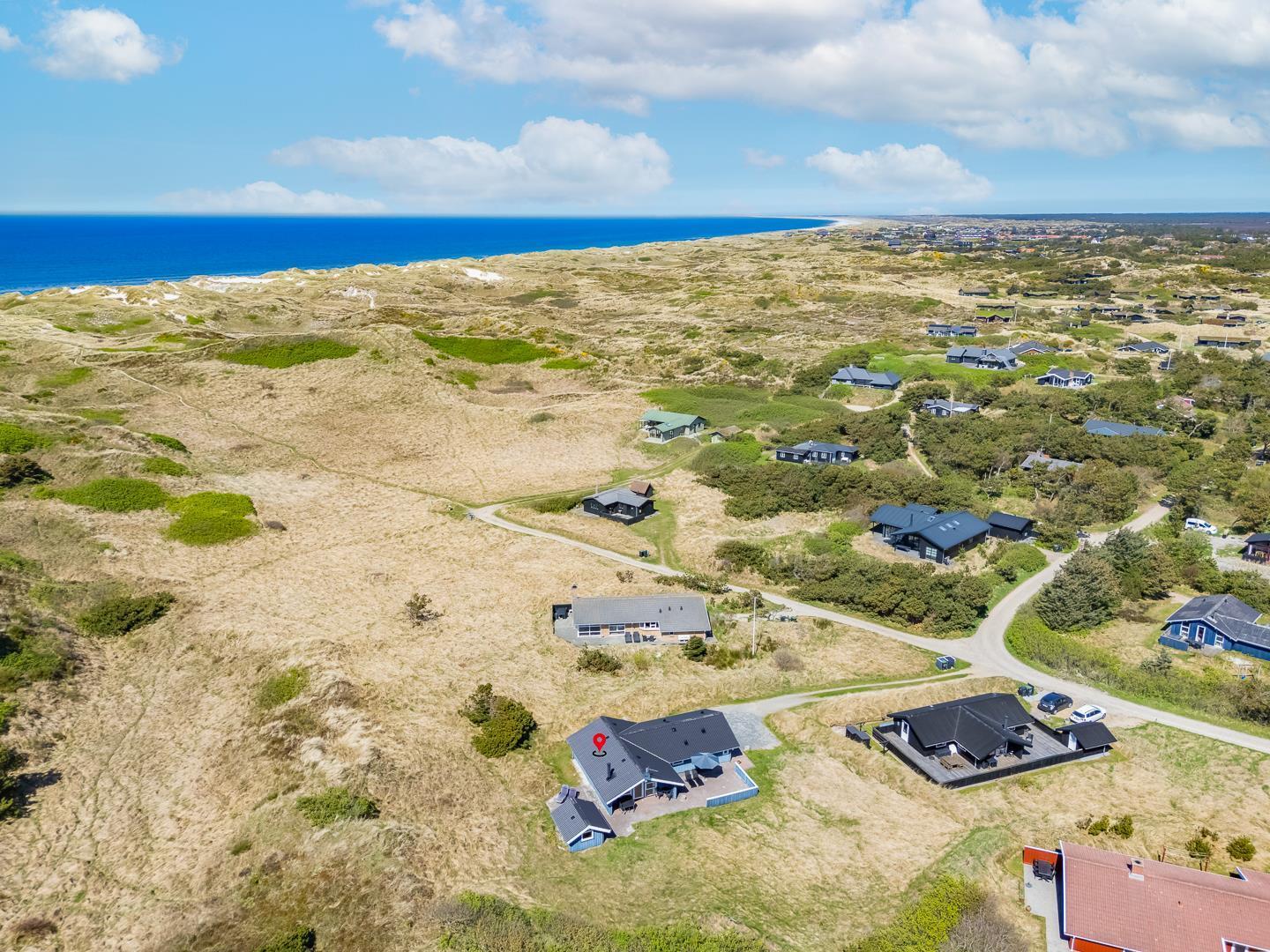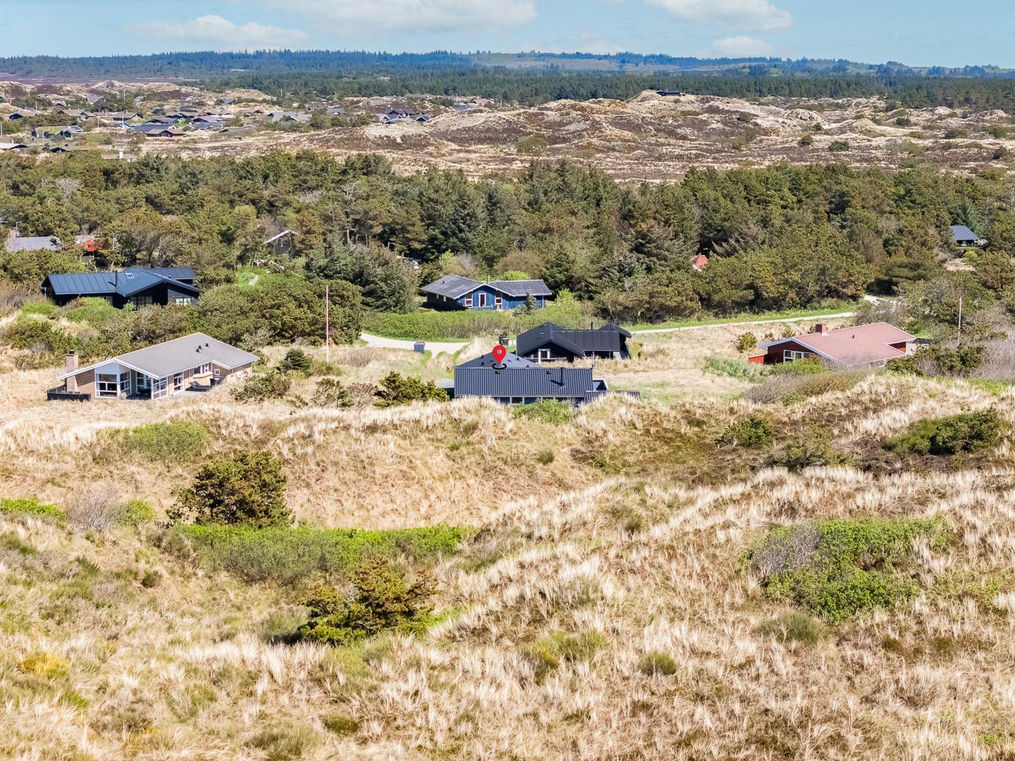 På en pragtfuld kuperet klitgrund tæt ved Henne Mølle Å og Vesterhavet ligger dette hyggelige og velholdte feriehus. Nyere badeværelser, hvoraf det ene er med spa og sauna. Stort køkken i åben forbindelse til rummelig stue. Herfra udgang til delvis overdækket, stor og ugenert terrasse hvorfra der er en flot udsigt over klitterne. Der forefindes en anneks/redskabsrum på grunden.