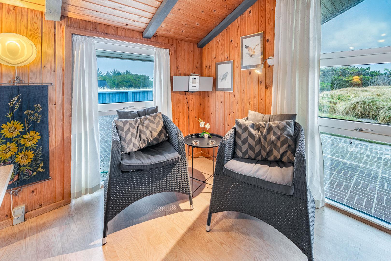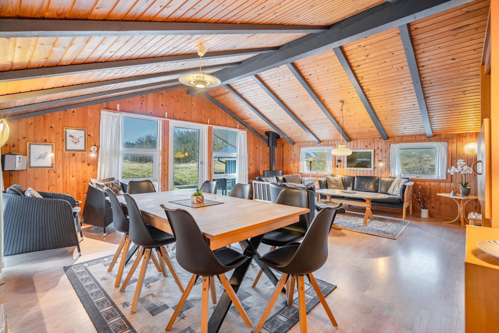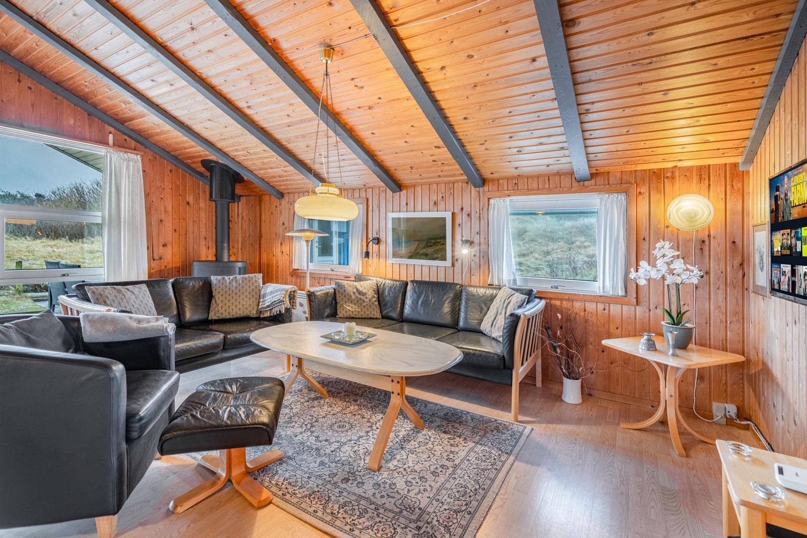 På en pragtfuld kuperet klitgrund tæt ved Henne Mølle Å og Vesterhavet ligger dette hyggelige og velholdte feriehus. Nyere badeværelser, hvoraf det ene er med spa og sauna. Stort køkken i åben forbindelse til rummelig stue. Herfra udgang til delvis overdækket, stor og ugenert terrasse hvorfra der er en flot udsigt over klitterne. Der forefindes en anneks/redskabsrum på grunden.