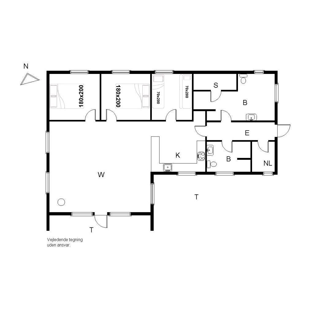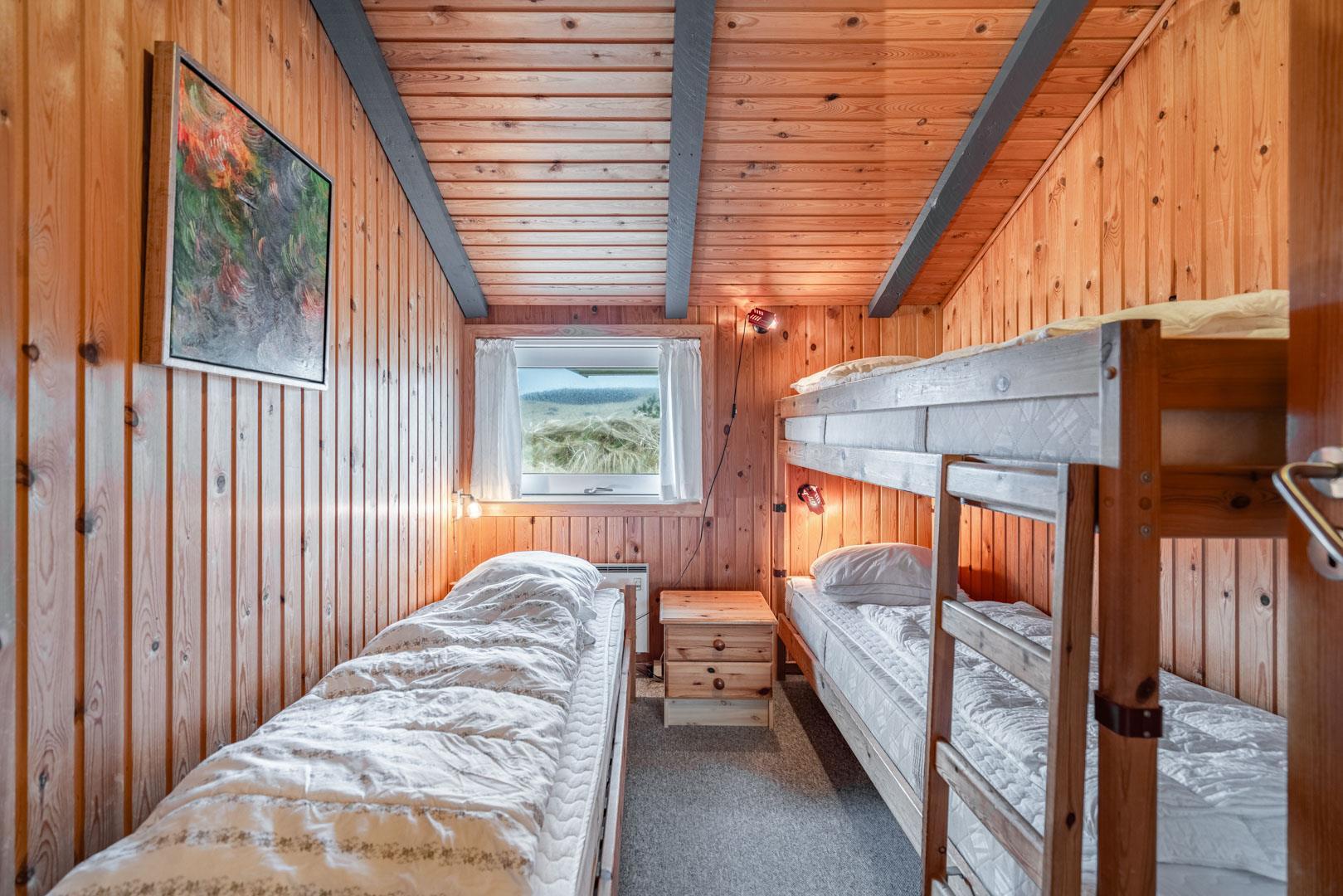 Sengestørrelse: 2 dobbeltsenge 180 x 200 cm (1 topmadras) + 1 enkeltseng 70 x 200 cm + 1 køjeseng 70 x 200 cm.