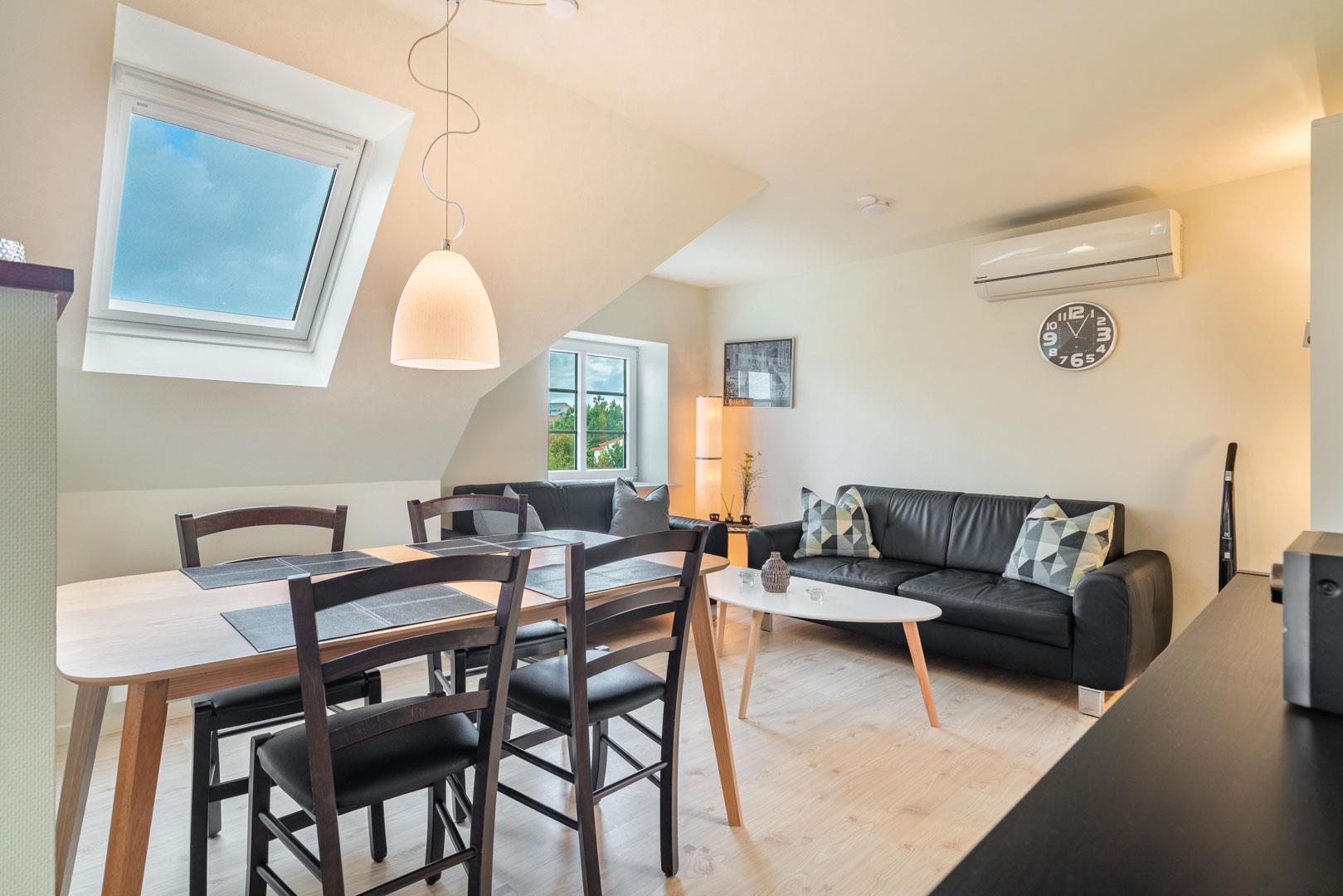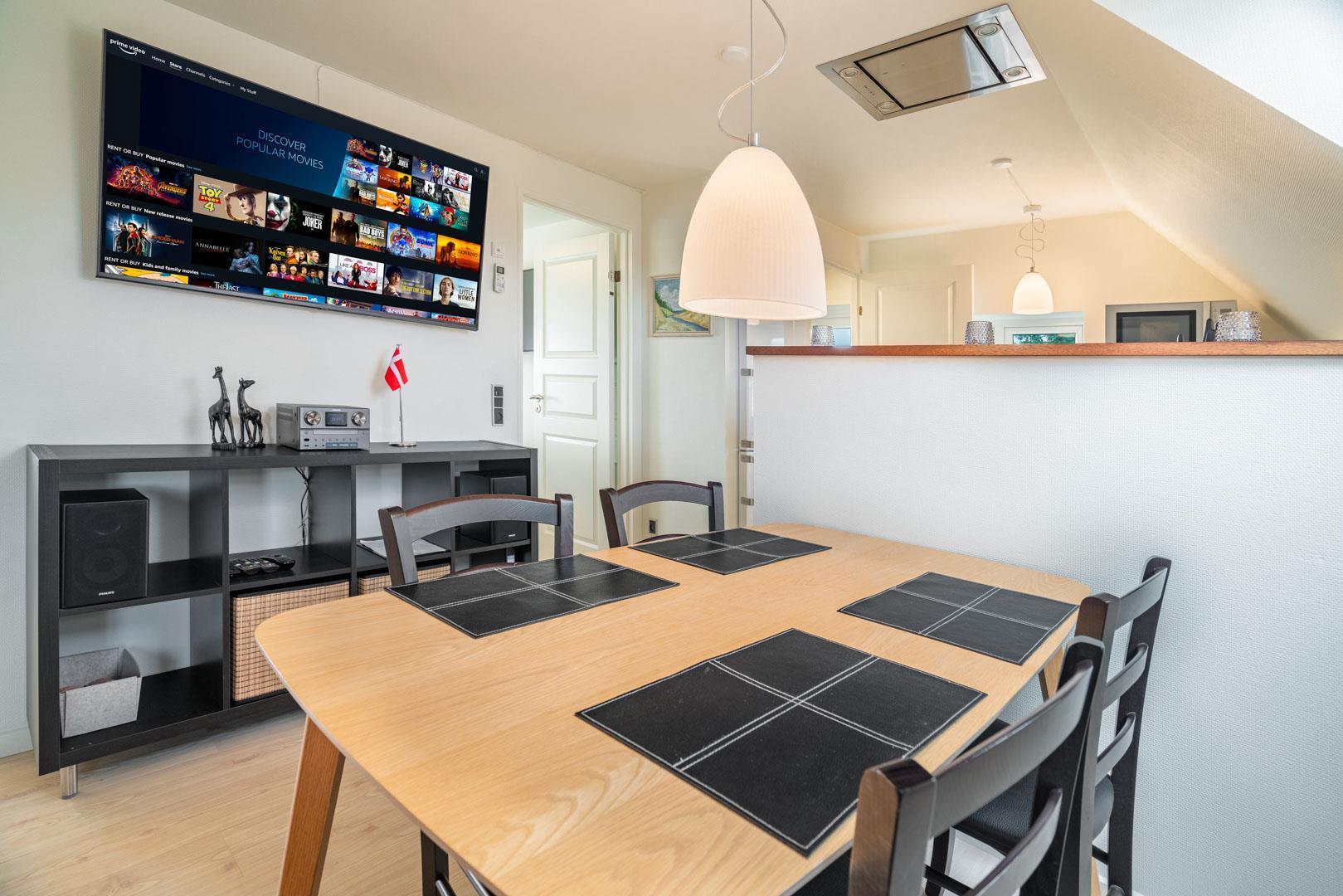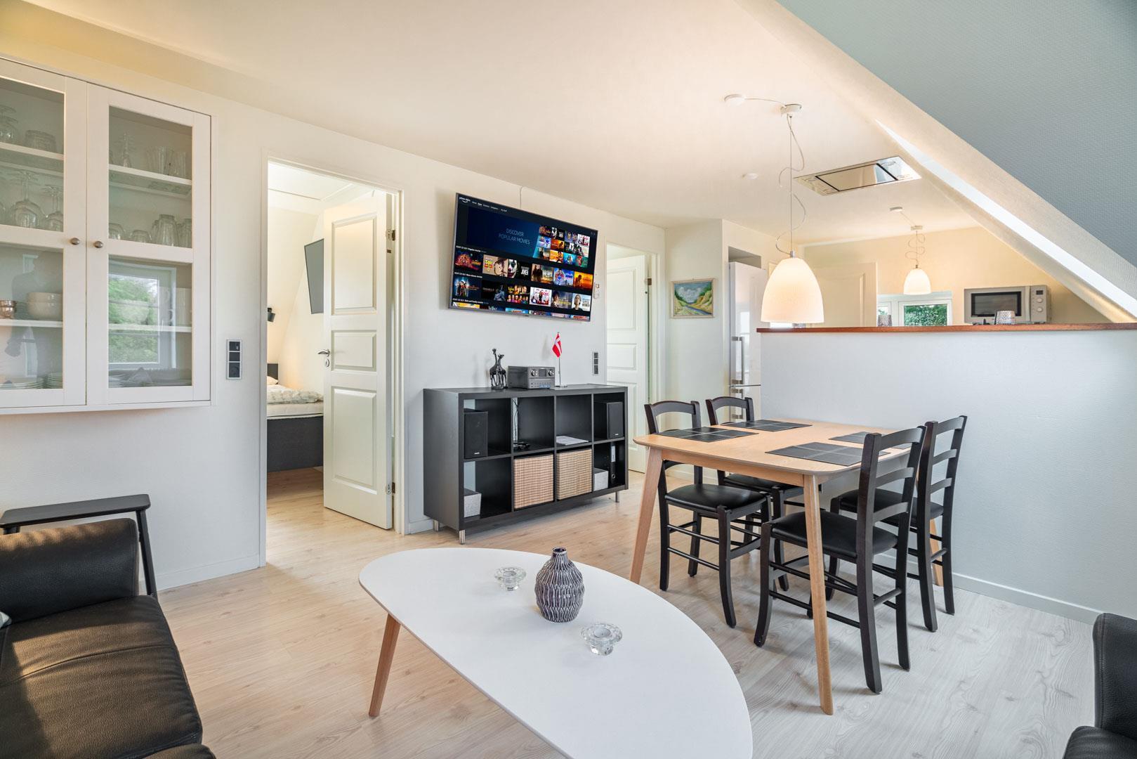 Veludstyret sydvendt kvalitetslejlighed på 1. sal beliggende på en stor lukket naturgrund ikke langt fra Henne Strands centrum og vandet. Stor solrig terrasse. Lejligheden er løbende blevet renoveret, så alt fremstår lyst og venligt. Der er trådløs internet. TV i begge soverum. El klima-/varmepumpe anlæg (energibesparende). BEMÆRK: Følgende ting findes ikke direkte lejligheden, men i et fællesrum med vaskemaskine og tørretumbler, som betales ekstra med mønt-indkast.