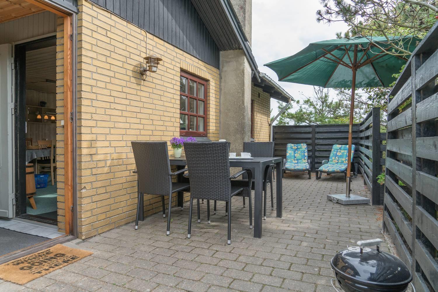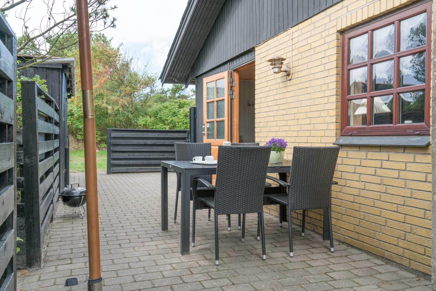 Privat og velholdt feriehus med dejlig lukket terrasse beliggende få minutters gang fra byen samt Vesterhavet. Feriehuset har godt køkken som ligger i åben forbindelse med den hyggelige stue, som er indrettet med pæne og gode møbler samt brændeovn. Der er på grunden hyggelig lille 'gryde' med gynge. Feriehuset har en dejlig ugenert terrasse.