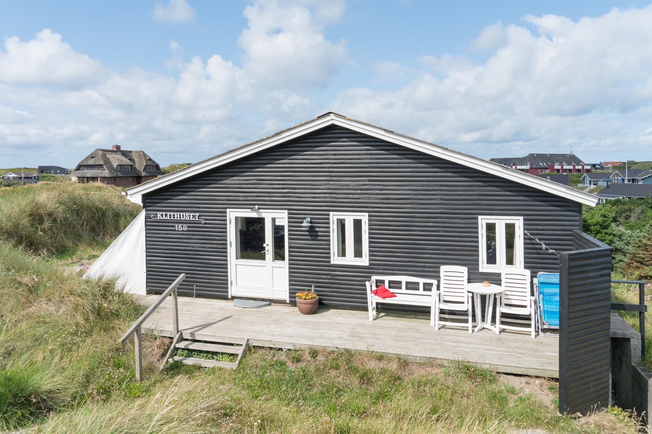 Porsevej 15 B Henne strand er et hyggeligt feriehus højtbeliggende på en klitgrund med god udsigt. Et rigtigt hyggeligt 'sommerhus' til den lille familie eller par. Porsevej 15 B ligger i flot og roligt område og i går afstand til vand Vesterhavet og byen. God terrasse rundt om huset, med flere lækroge.