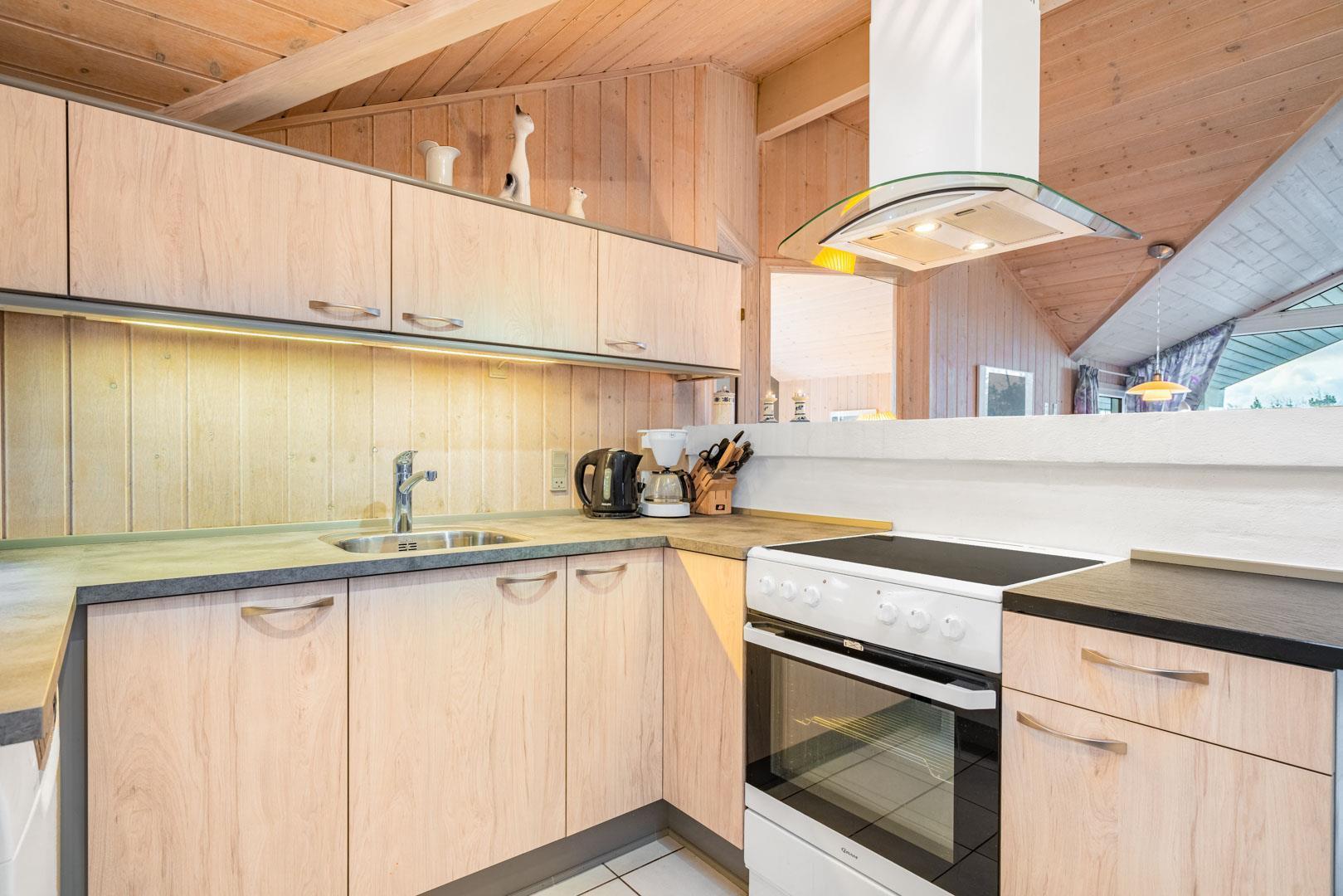 I feriehuset finder du et flot og veludstyrede køkken, som ligger i åben forbindelse med stuen. Så her går du ikke glip af familiehyggen selvom det er dig der står for madlavningen.