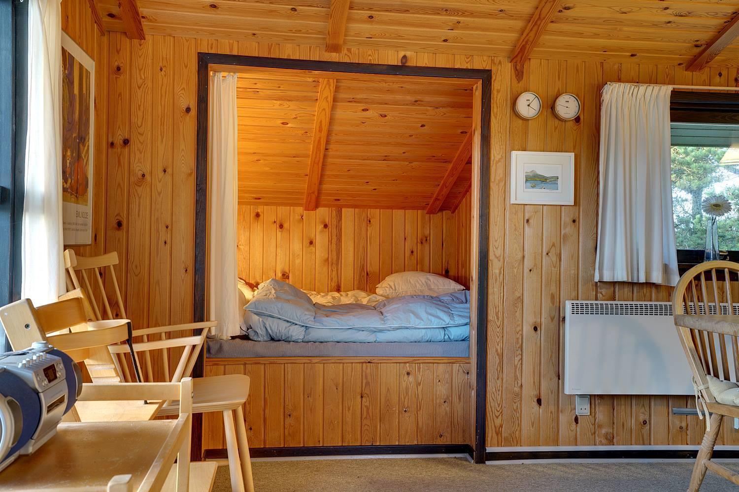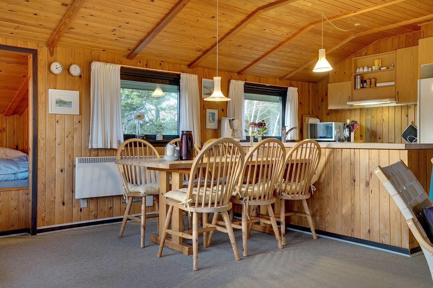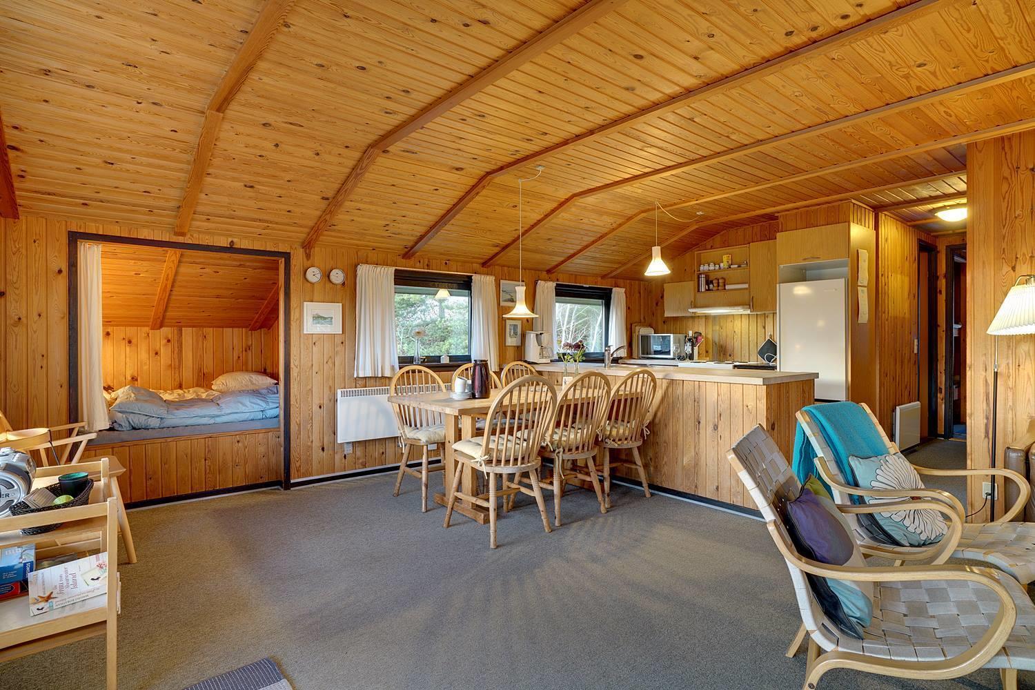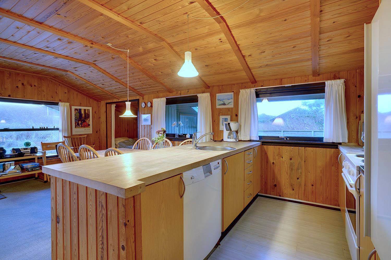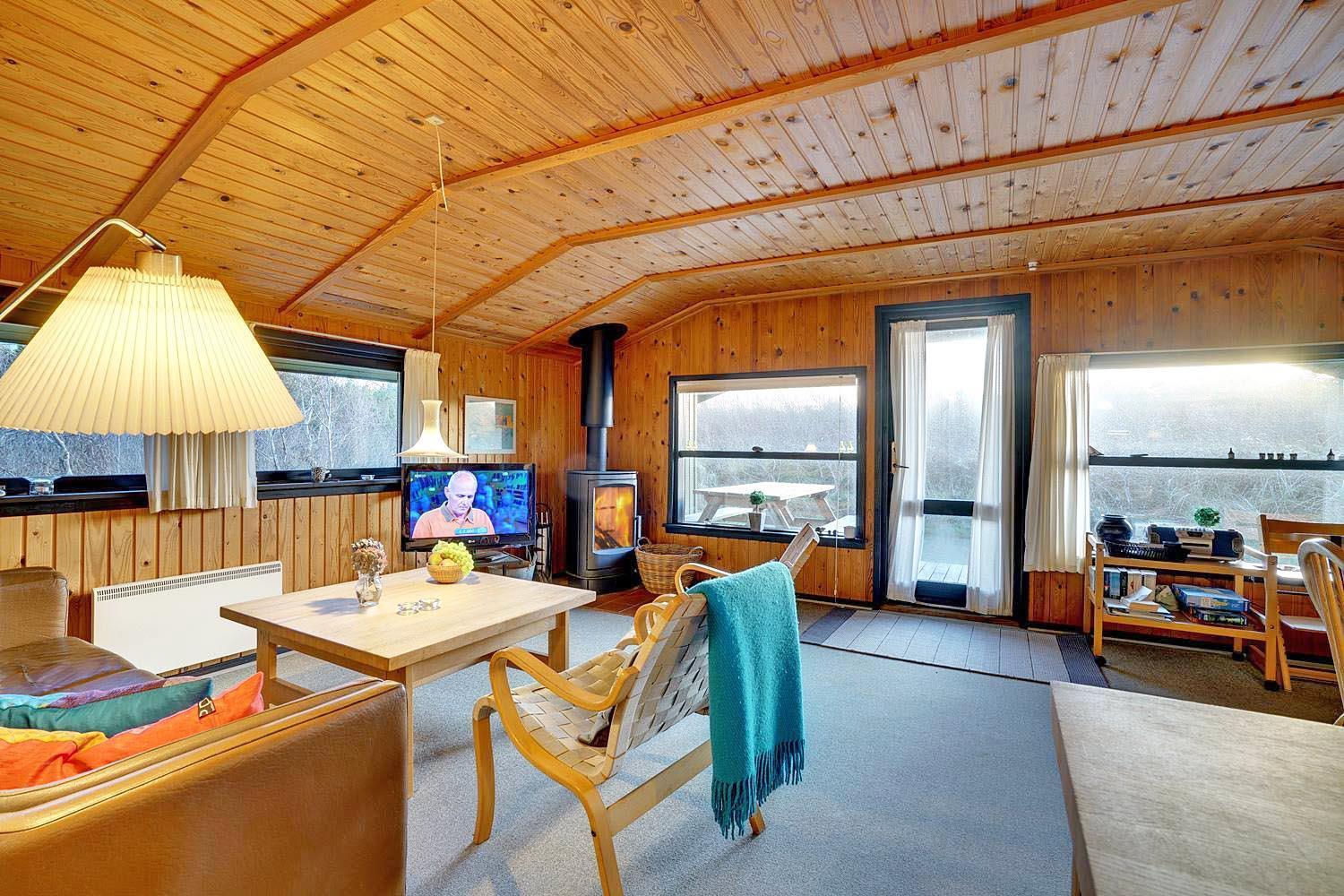 Hyggeligt sommerhus på lys naturskøn grund, med udsigt iver strandklitterne. Der 50 m til en natursti til stranden og 400 m til stranden. Der er 3. terrasser og derfor altid mulighed for sol. Køkkenet er i forbindelse med stuen, der har alkove, brændeovn og udgang til overdækket terrasse. Badeværelse i forbindelse med sauna.
