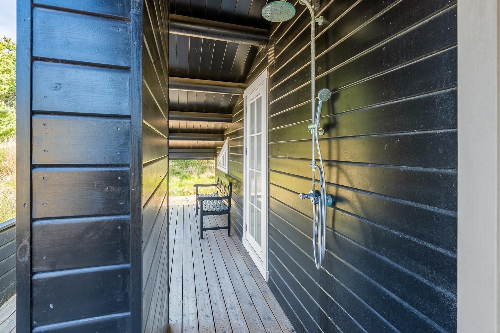 Indretningen byder på tre soverum, hvoraf to er meget rummelige og indrettet med dobbeltsenge. Fra det ene soveværelse er der direkte udgang til en skøn udendørsbruser – en luksus, der forlænger sommerfølelsen.