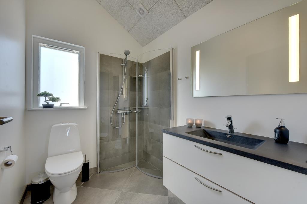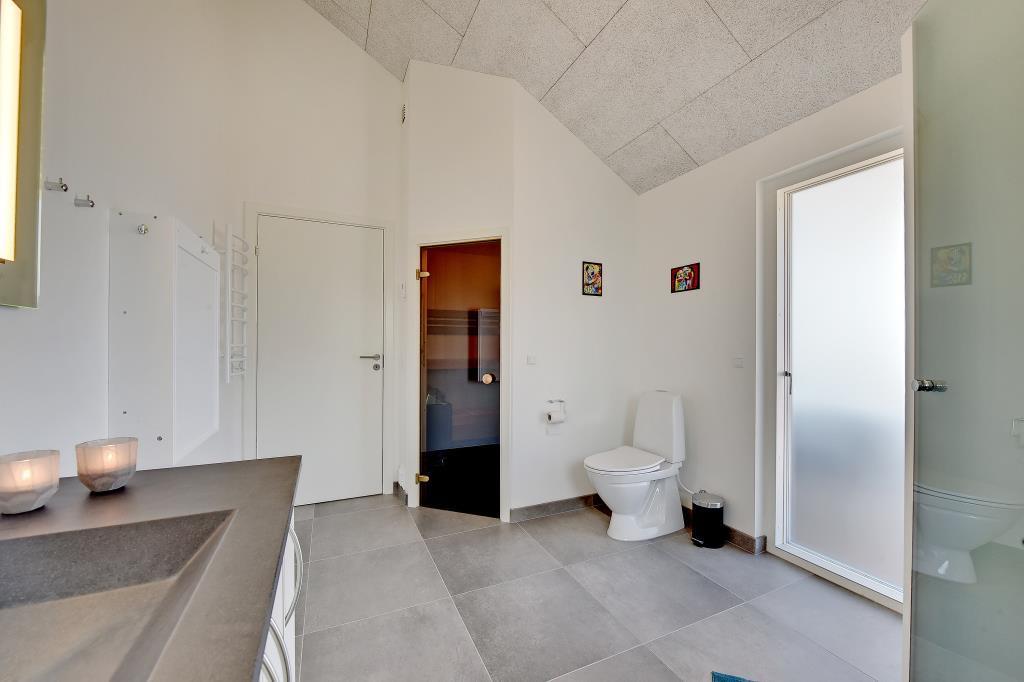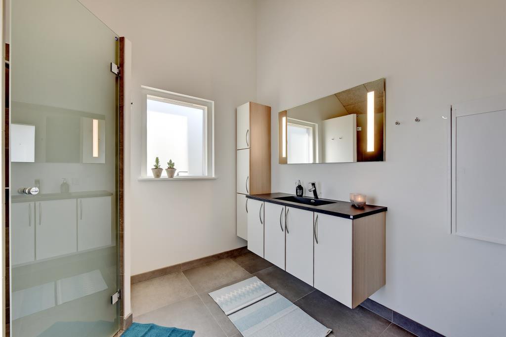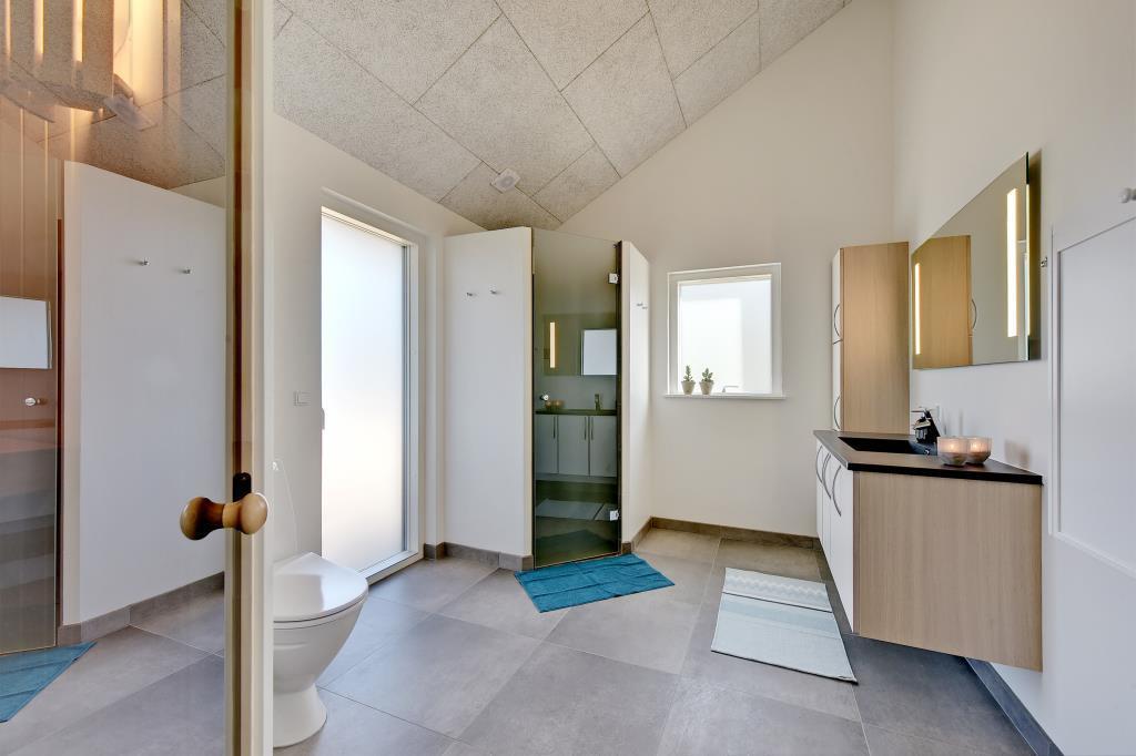 Huset har to moderne badeværelser med gulvvarme, hvoraf det ene byder på sauna og babybadekar. Til de mindste gæster er der også pusleplads. Vandforbruget er inkluderet i lejen – en ekstra bonus, der gør ferien endnu mere bekymringsfri.