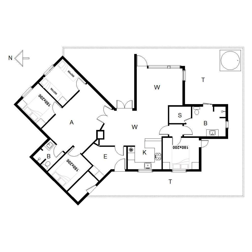 Sengestørrrelse: 3 dobbeltsenge (180x200 cm) og 2 enkeltsenge (90x200 cm).