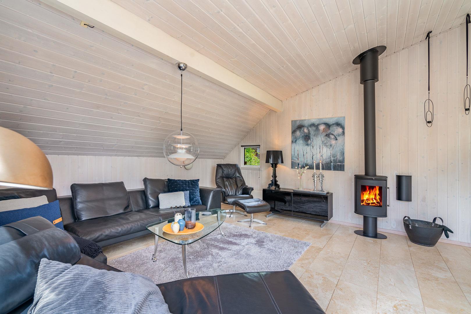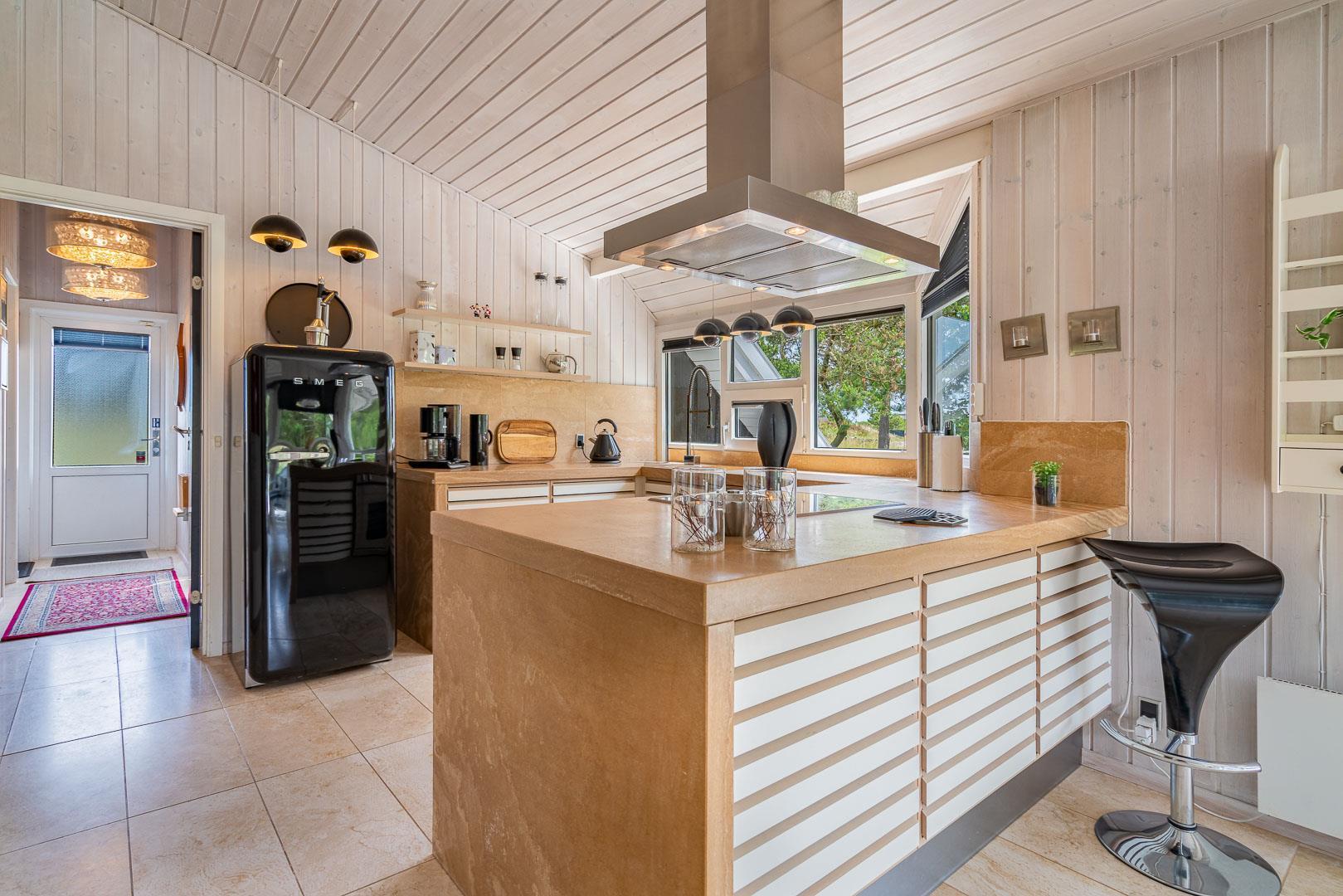 Udenfor er der masser af muligheder for både læ og sol på den over 150 m2 store, flisebelagte terrasse, som nærmest omkranser huset, og hvor der bl.a. findes stor dobbelt solseng, grill, fatboy og diverse havemøbler.