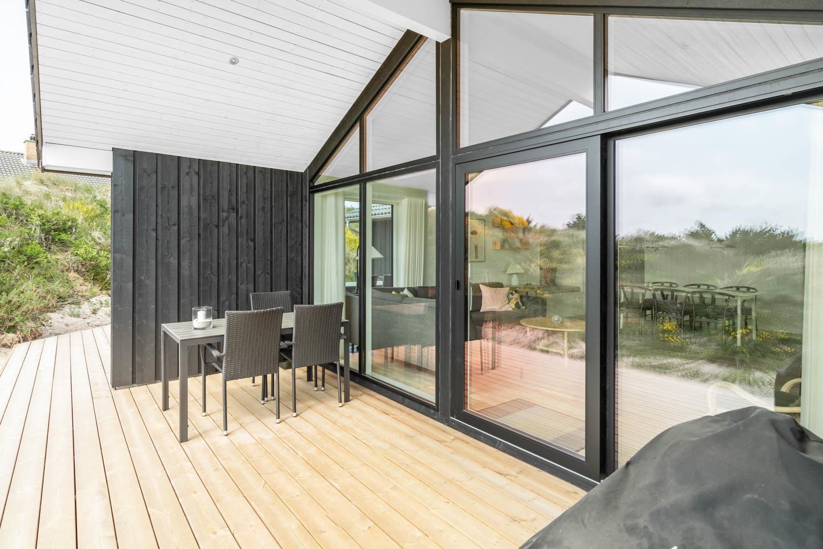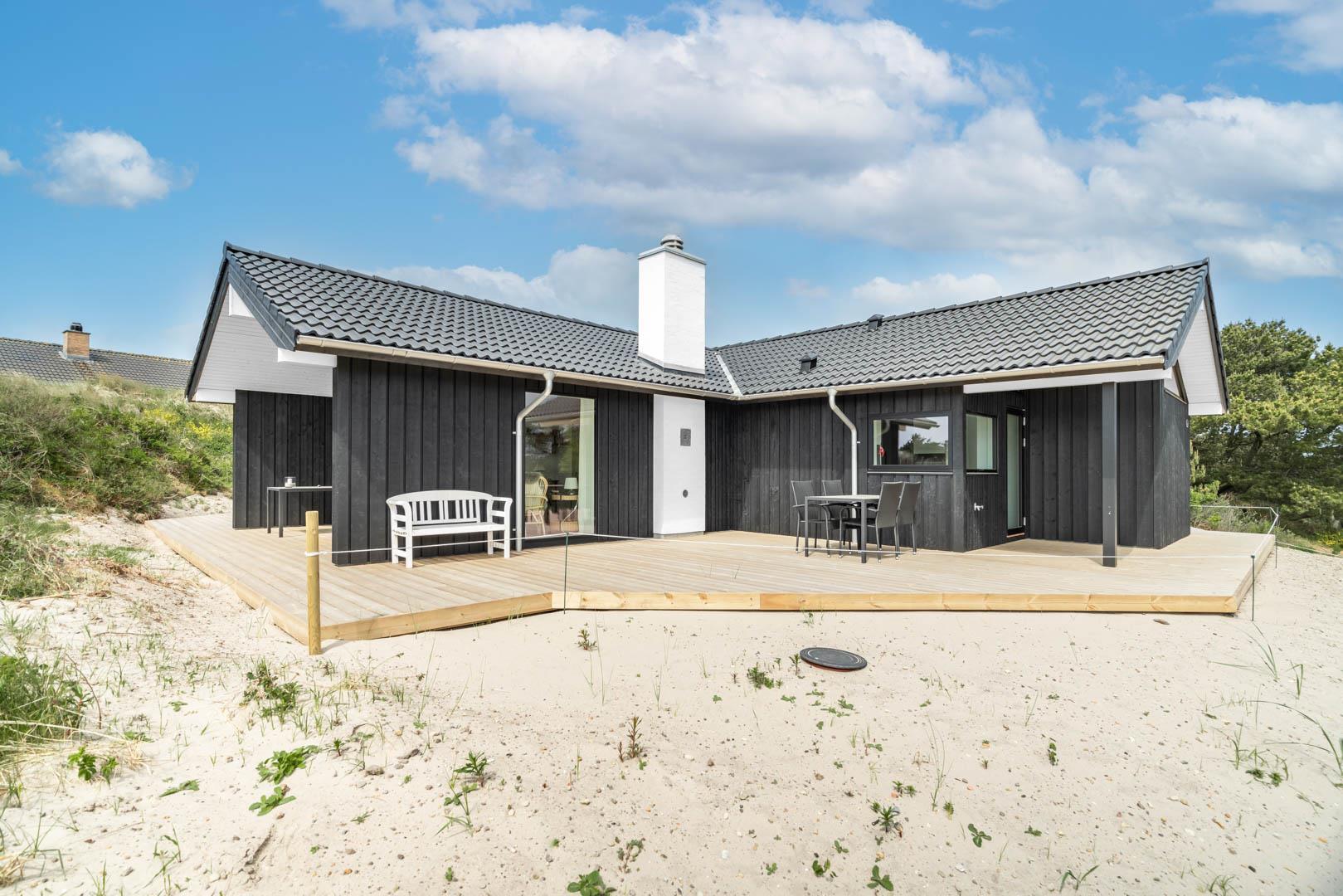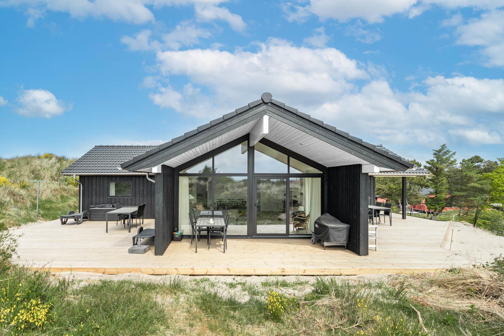 Moderne sommerhus i rolige omgivelser nær Henne Strand og Vesterhavet med store terrasser og moderne faciliteter.