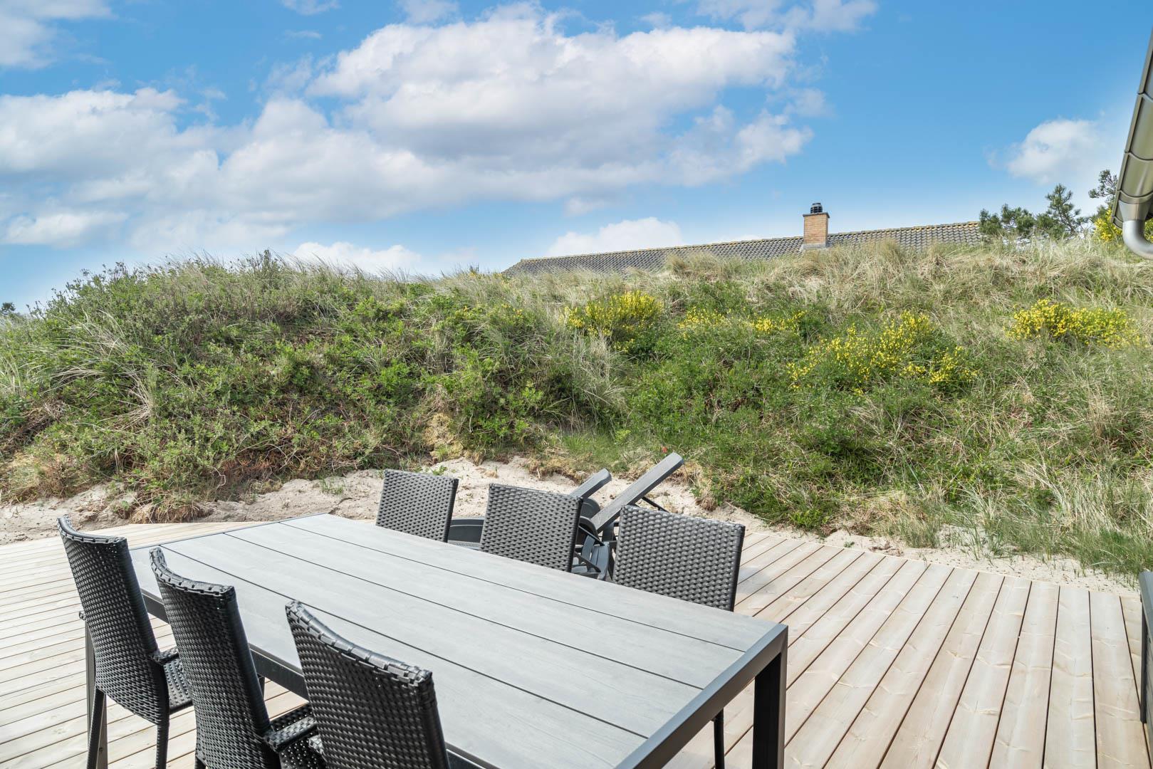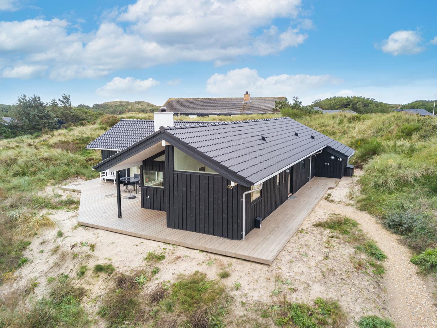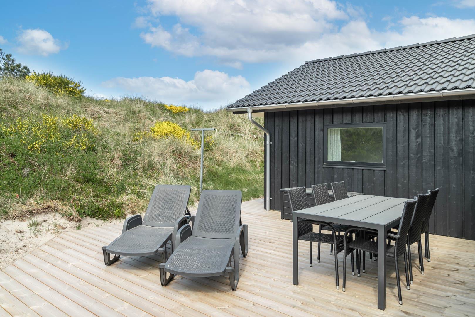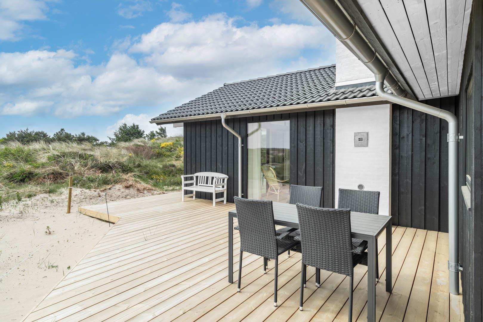 Moderne sommerhus i rolige omgivelser nær Henne Strand og Vesterhavet med store terrasser og moderne faciliteter.