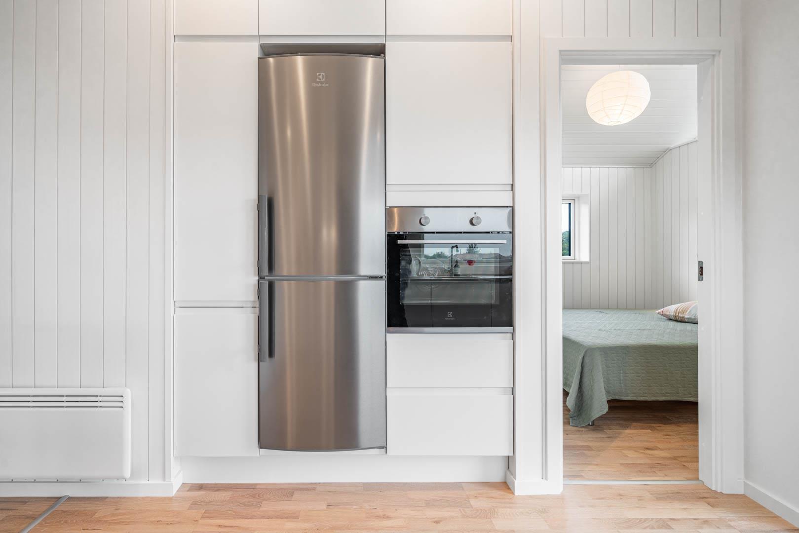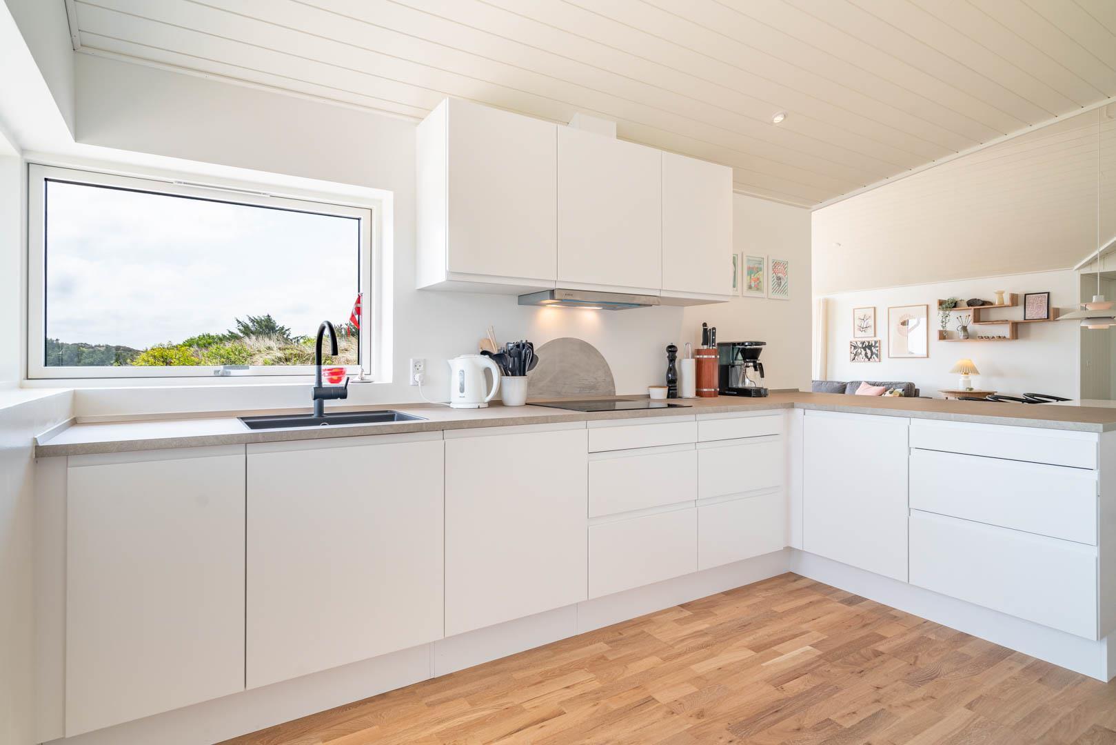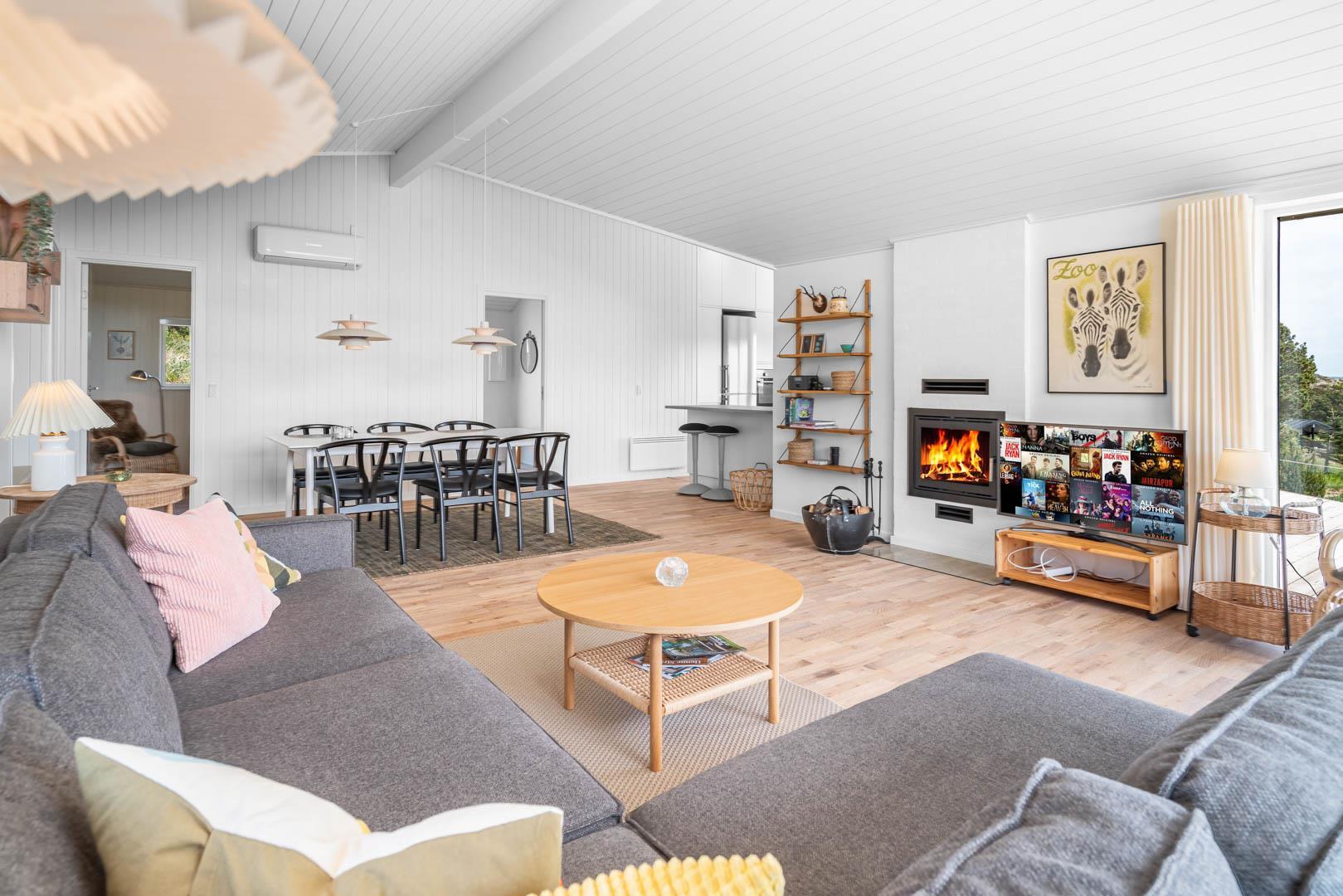 Sommerhuset har en rummelig og stor køkken/alrum med køkken med alt i hårde hvidevarer og køkkenet ligger i åben forbindelse til stue med varmepumpe samt brændeovn.