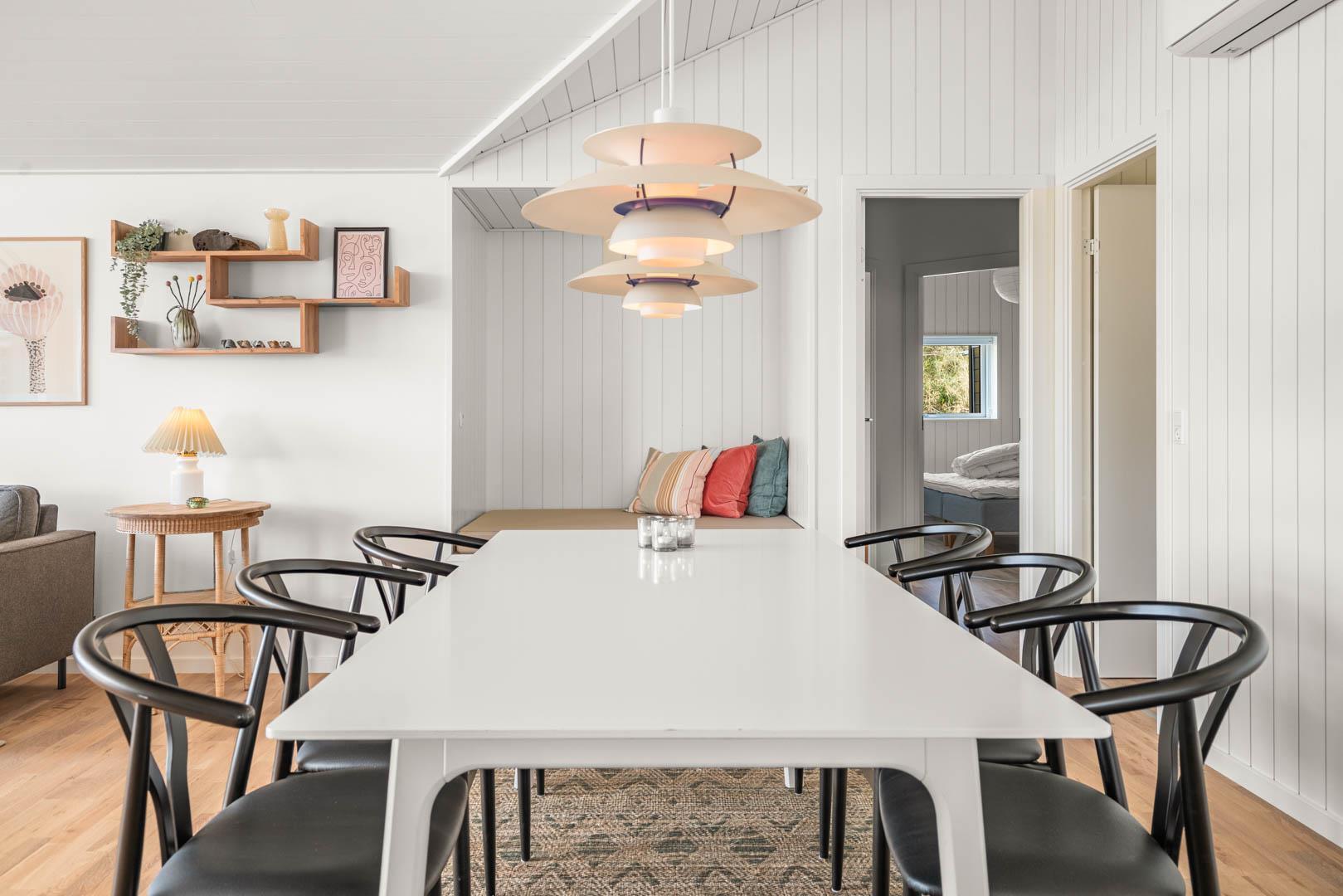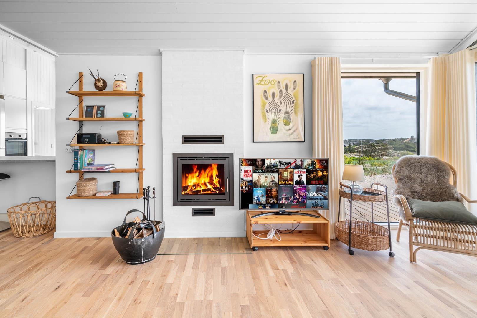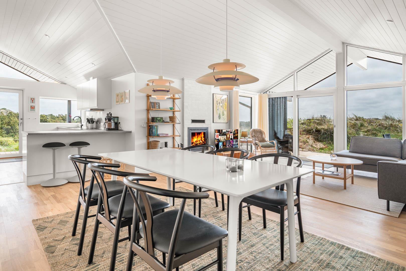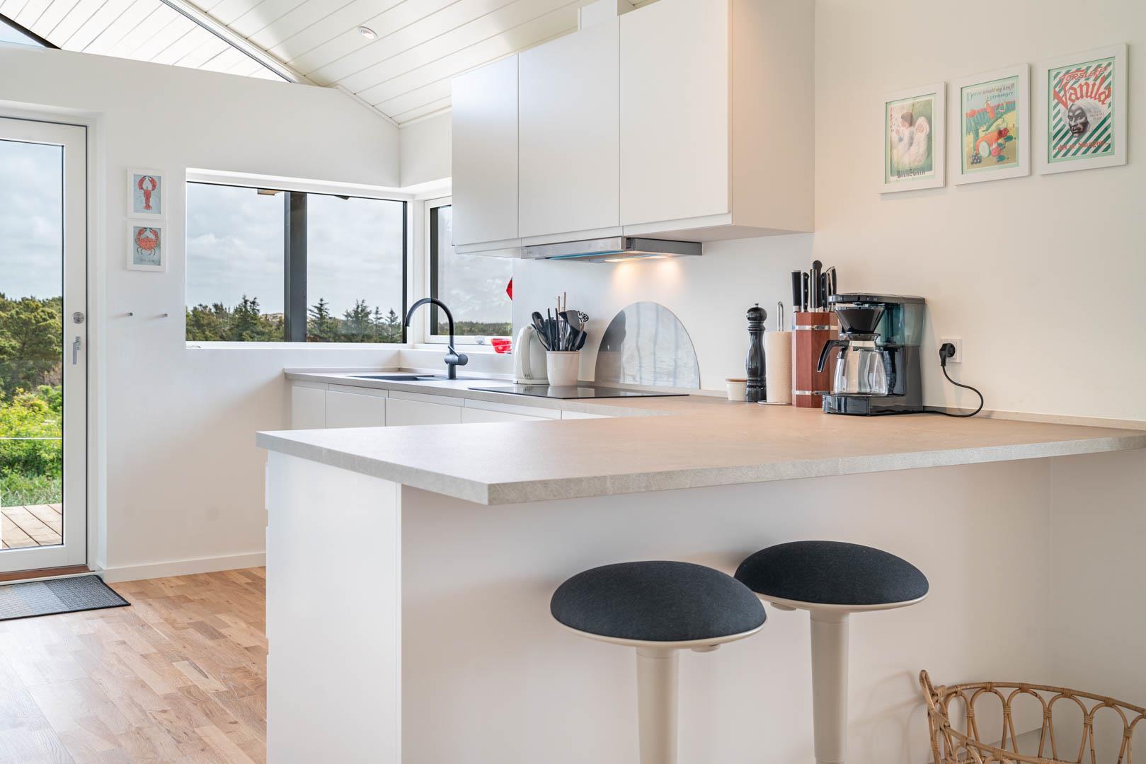 Sommerhuset har en rummelig og stor køkken/alrum med køkken med alt i hårde hvidevarer og køkkenet ligger i åben forbindelse til stue med varmepumpe samt brændeovn.