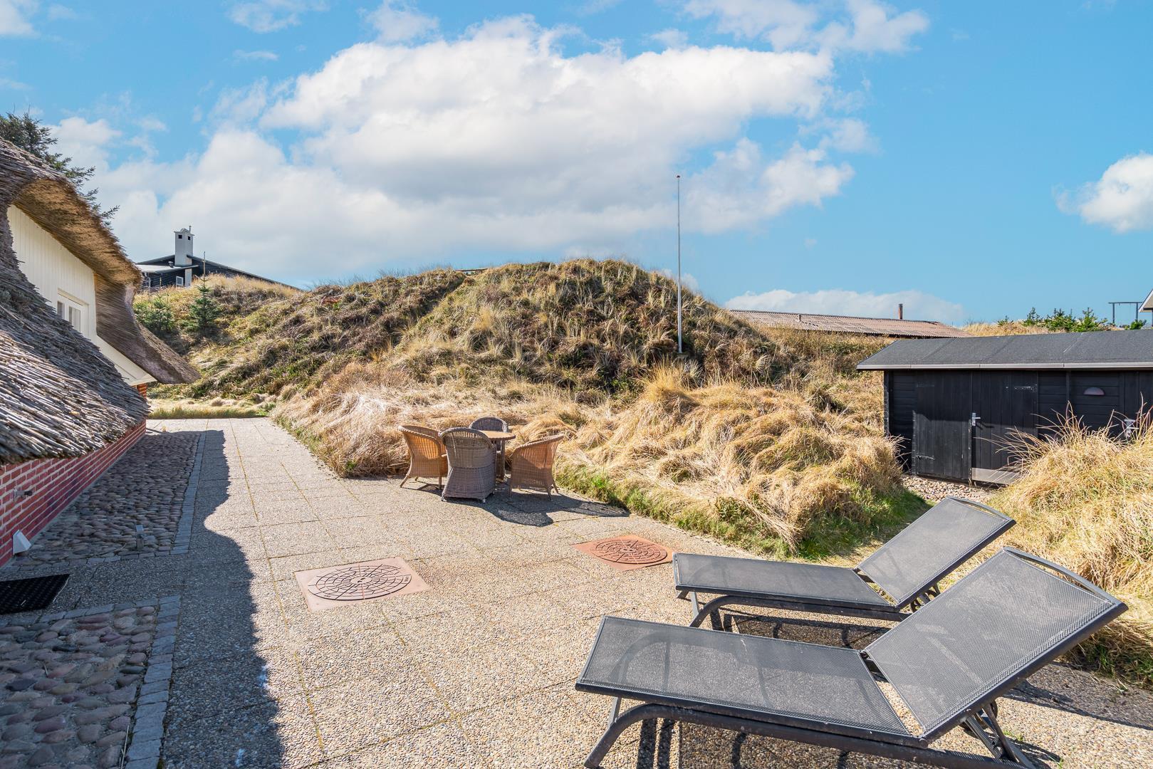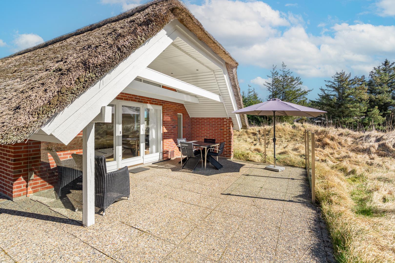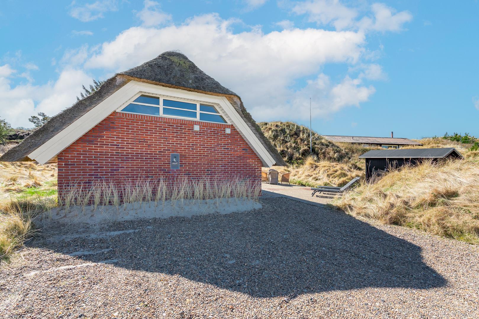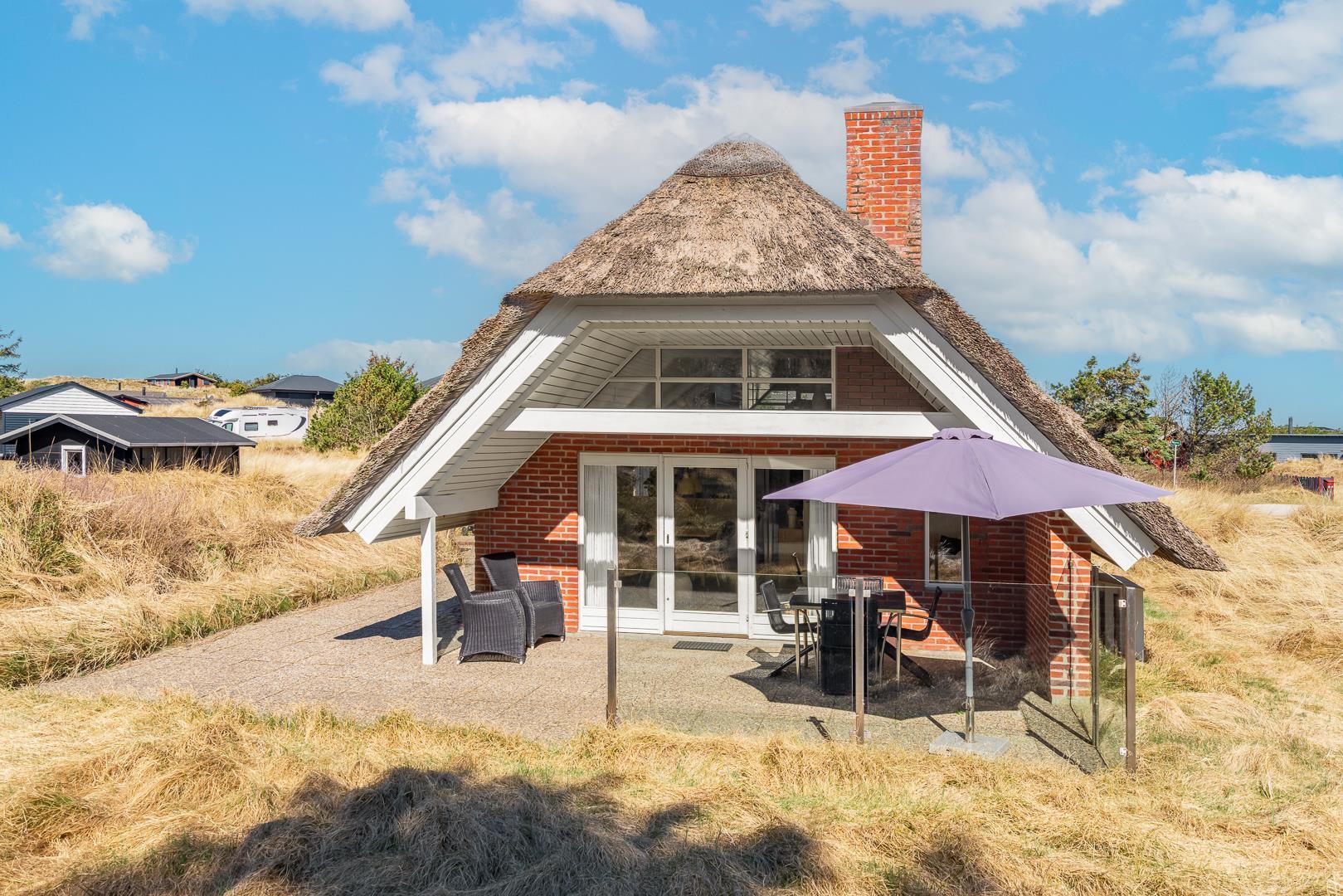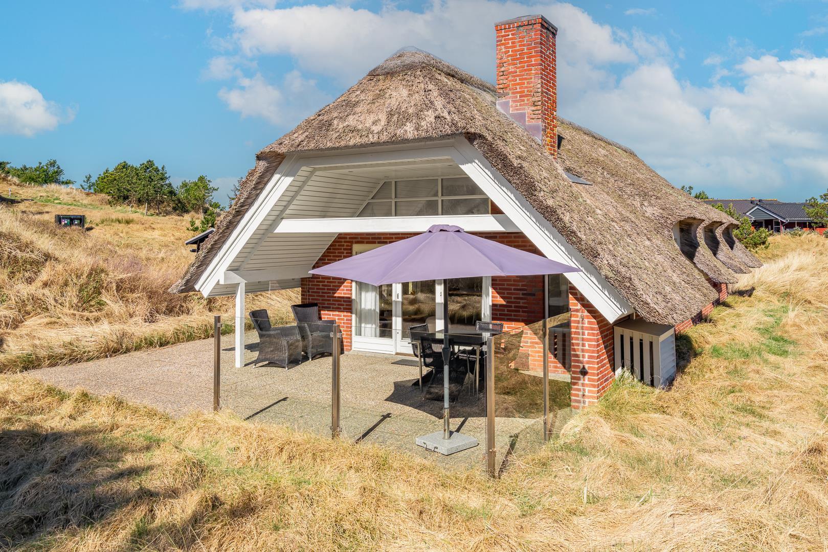 På en kuperet klitgrund ligger dette charmerende kvalitetsferiehus med stråtag. Huset er smagsfuldt, lyst og venligt indrettet. Der er trægulve i hele huset. Indvendigt står huset flot køkken og badeværelse og moderne møbler. Her er et hus der har sjæl og moderniseret med nænsom hånd. Der hems og flere dejlige terrasse, hvoraf en er delvis overdækket. Der er depot med bla. stort køle /fryseskab. Sengestørrelser: dobbeltseng 180x200 cm. (2 madrasser), dobbeltseng 180x200 cm. (2 madrasser), dobbeltseng (Hems) 140x200 cm. (1 madras)